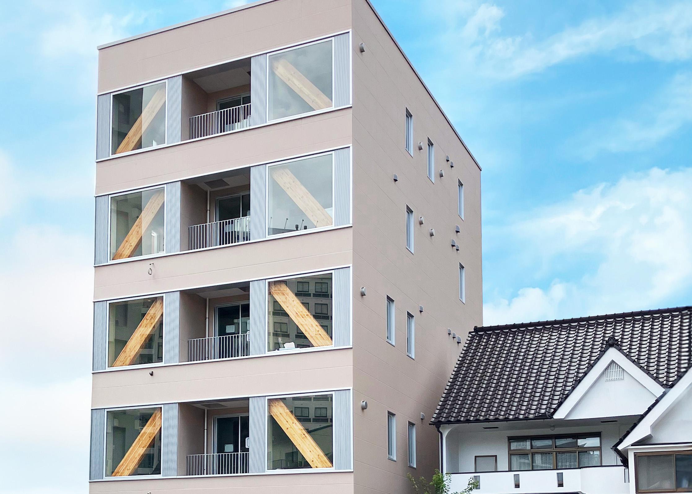 柱・梁・ブレースには木質耐火部材 COOL WOODを採用し、準防火地域における純木造ビルを実現しました。また、木造の躯体で軽量化を図り、杭基礎工事を不要としました。