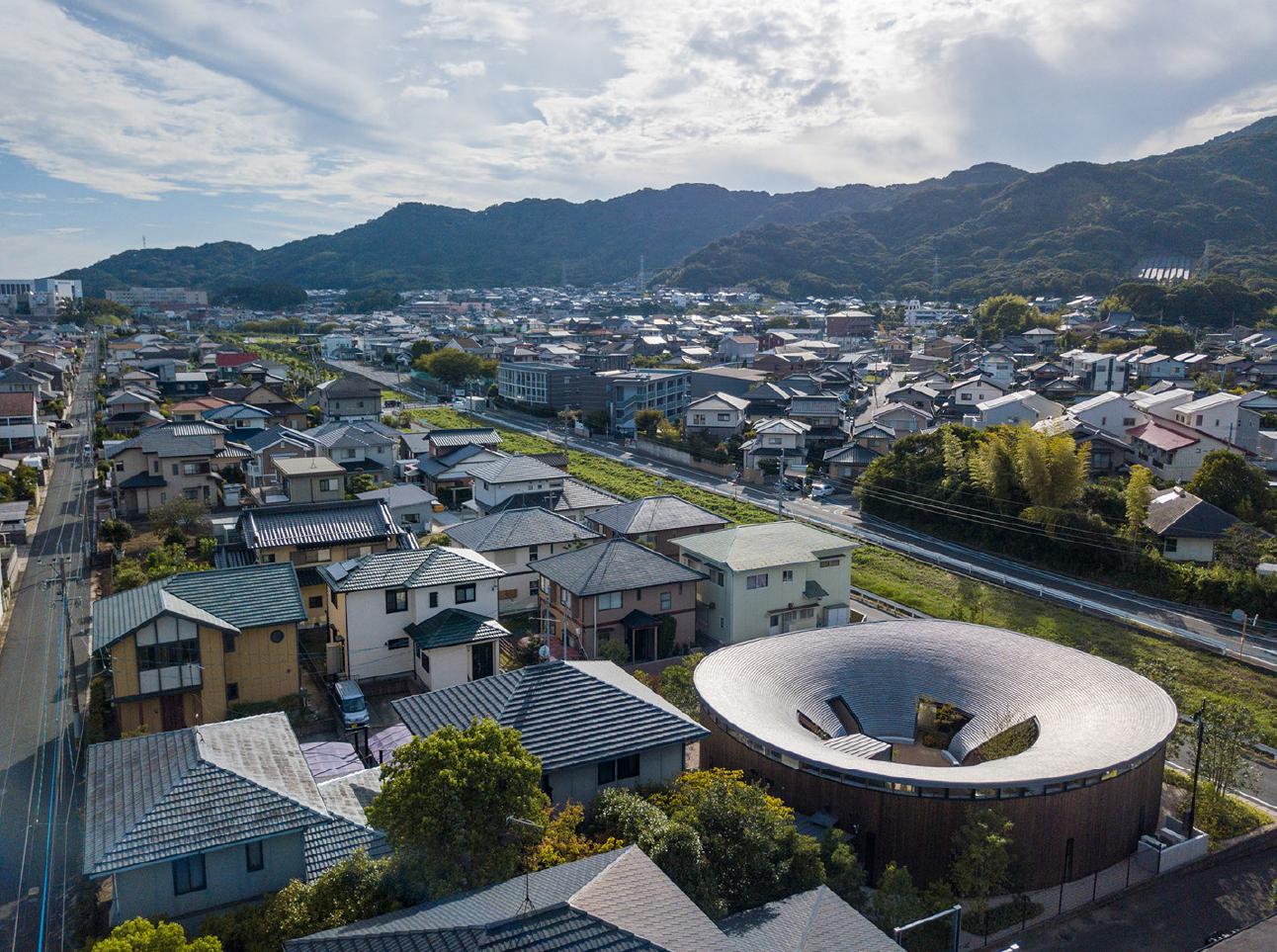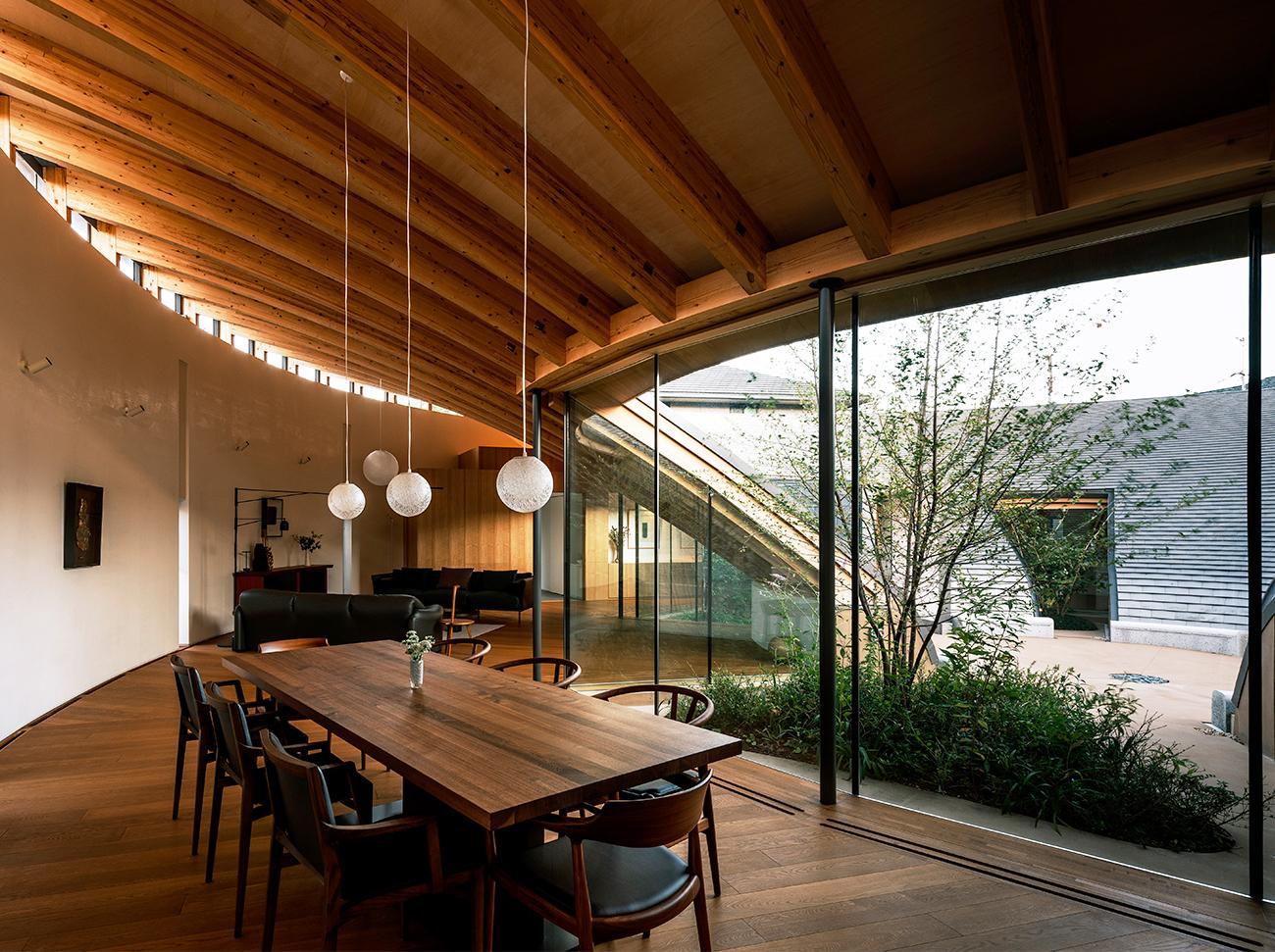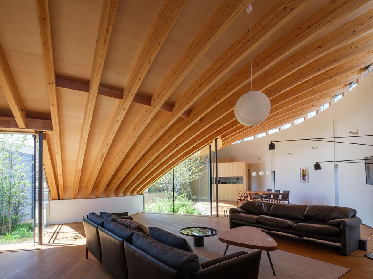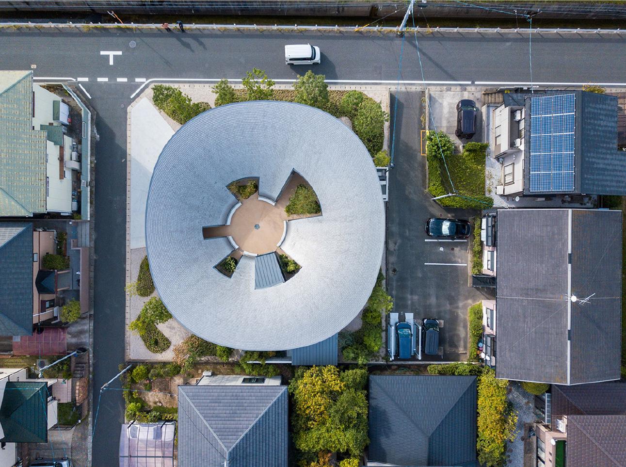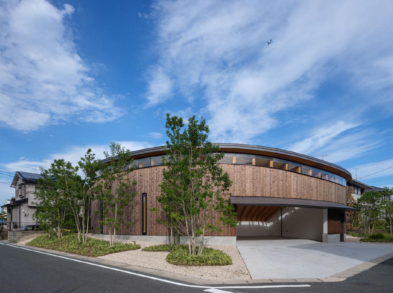 都市郊外の住宅地に建つ、夫婦二人のための住宅である。住宅地の中にありながらも豊かな自然環境を享受でき、日常生活だけでなく、時にはギャラリーやパーティー会場にもなる、おおらかな空間構造を持つ建築を目指した。湾曲集成材の木架構は、天井高の異なる多様な居場所をつくり、すべて同一形状で中心点から放射状に並べている。滑らかな曲面を描く瓦屋根は、空を切り取り、雨水を集め、太陽の光を柔らかに反射する。中庭のベンチに座って上を見上げると、自分も空と一体化して自然の一部になったように感じられる。