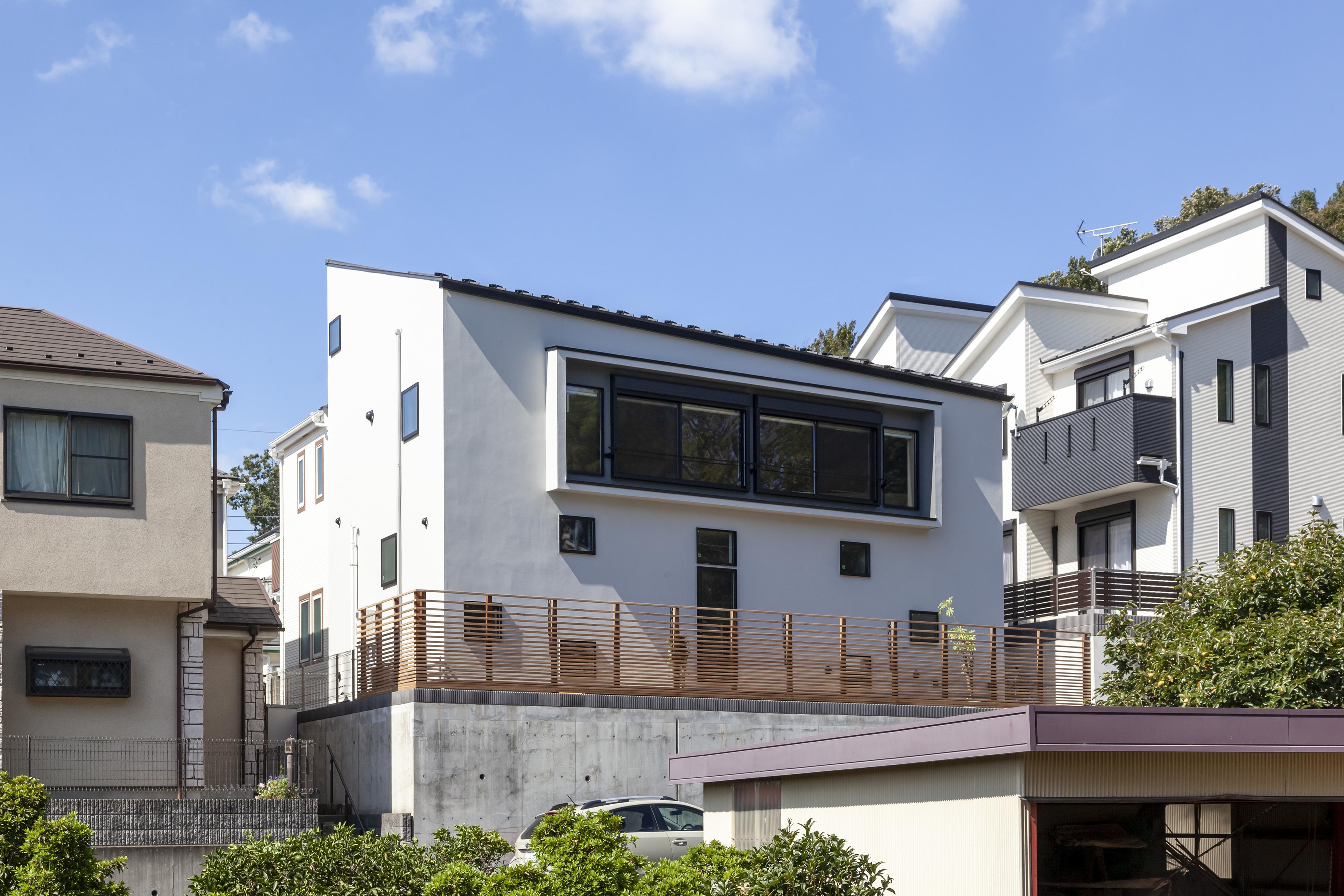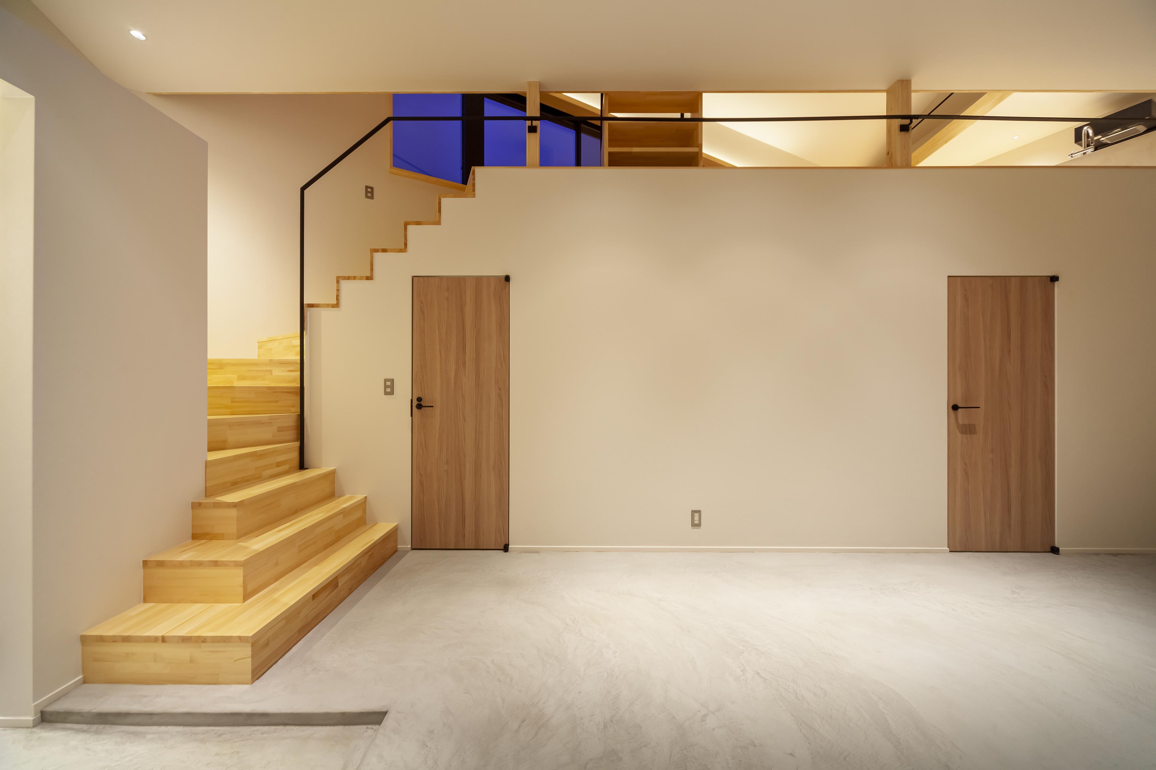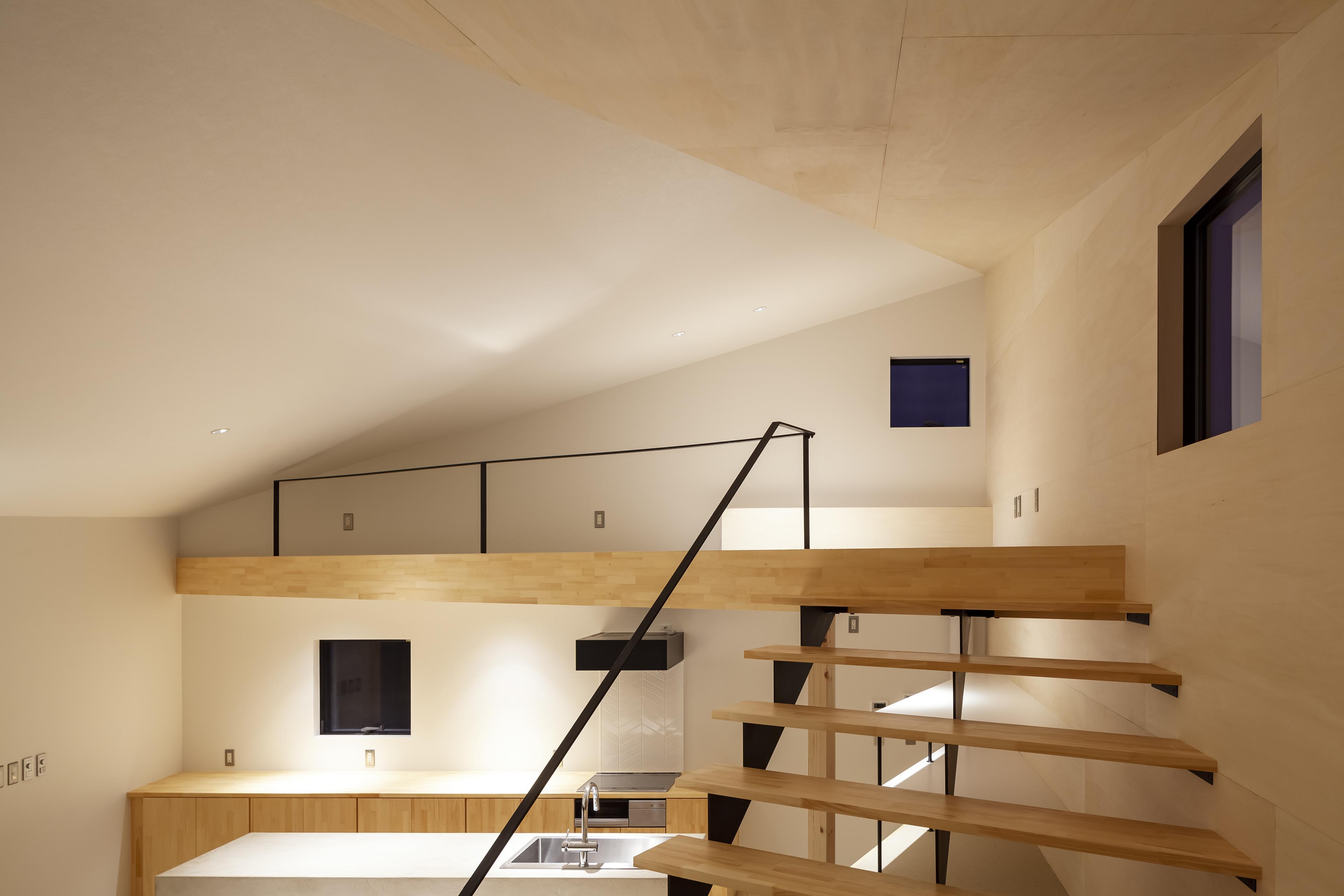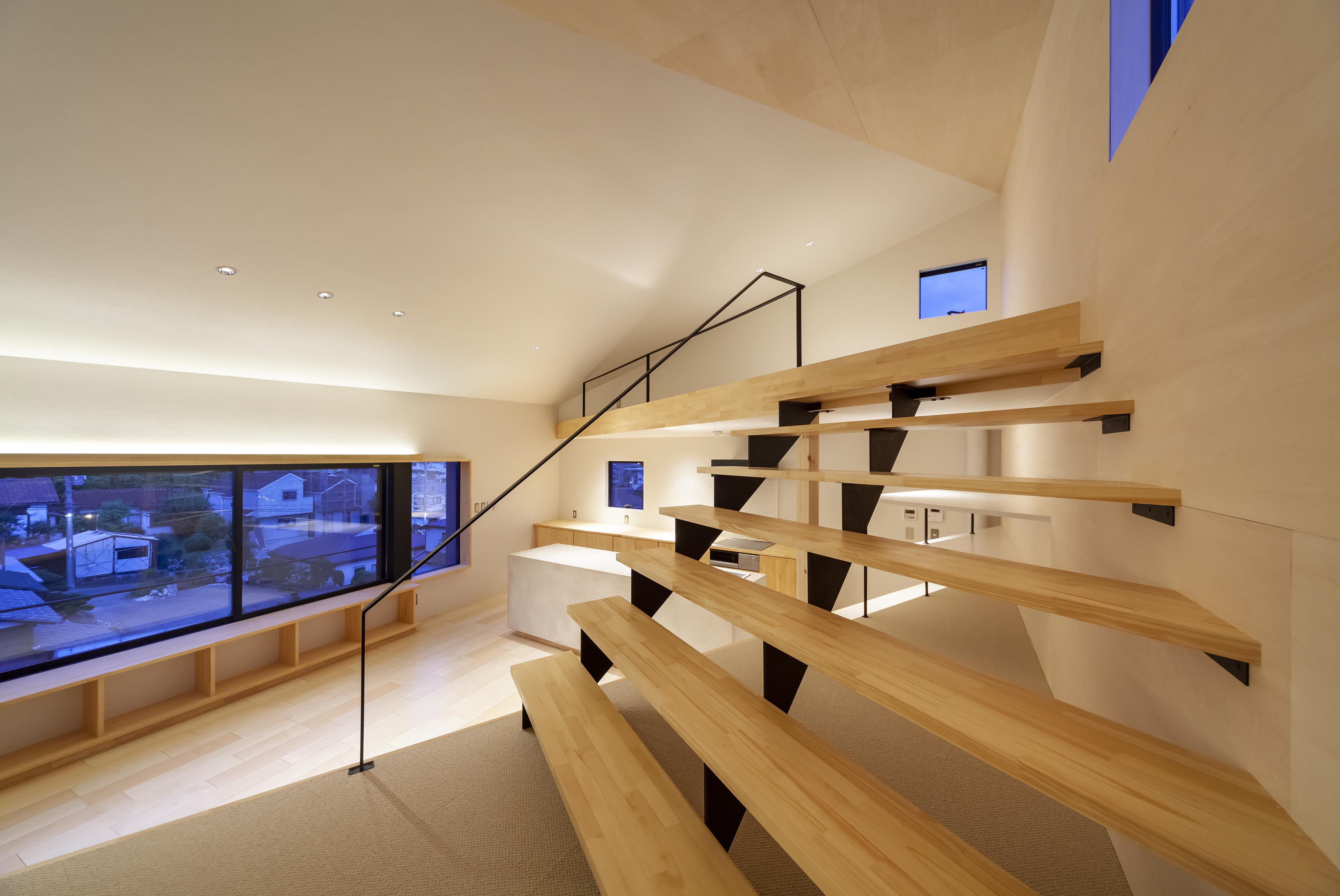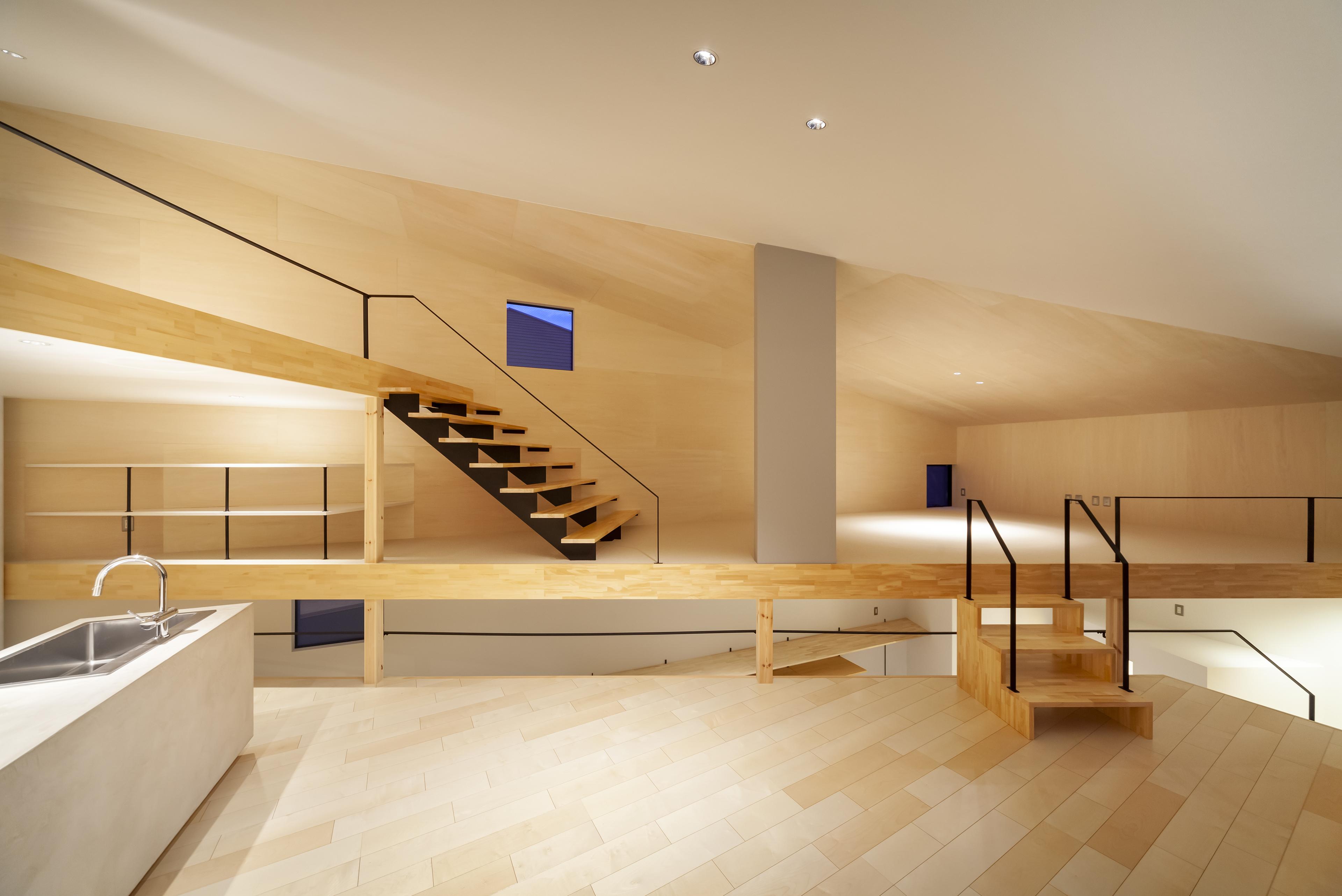 台形に変形した狭小宅地で、斜線も厳しい。どうにか法制限目いっぱいの空間を効率よくつくりたい。そうした想いから、斜めに重なり合う空間を考えた。床も屋根も鋭角や鈍角に交わるので、直交する箇所がほとんどないが、伸びやかで起伏ある空間がつくれると思った。地元のプレカットでは対応できず、3Dの木材加工技術によって実現した空間である。上棟の当日、鋭角に交わる仕口がピタリと納まった瞬間、みんなの歓声があがった。新しい技術が、新しい空間と、その先にある未知の生活を切り開いたように感じた。