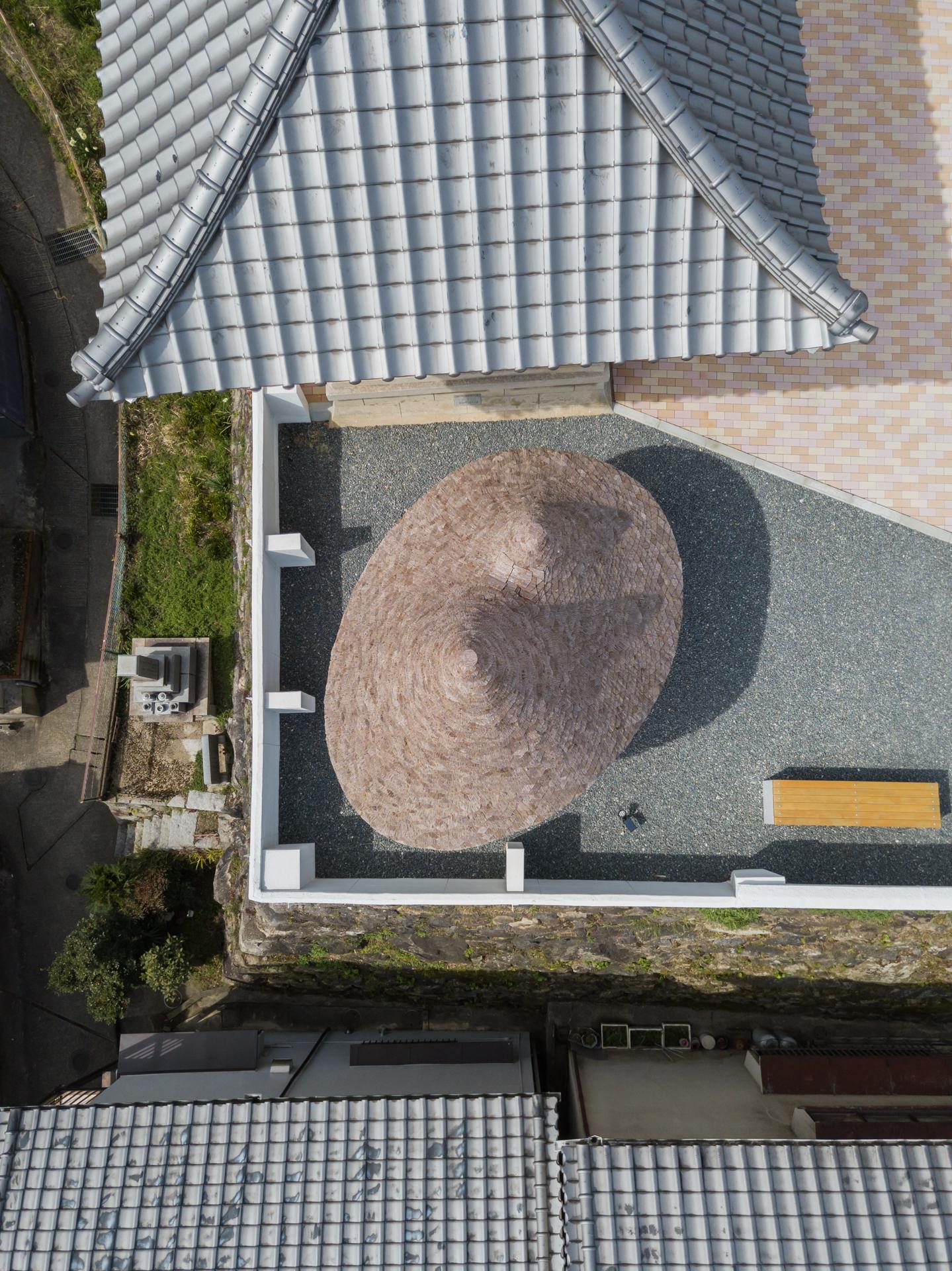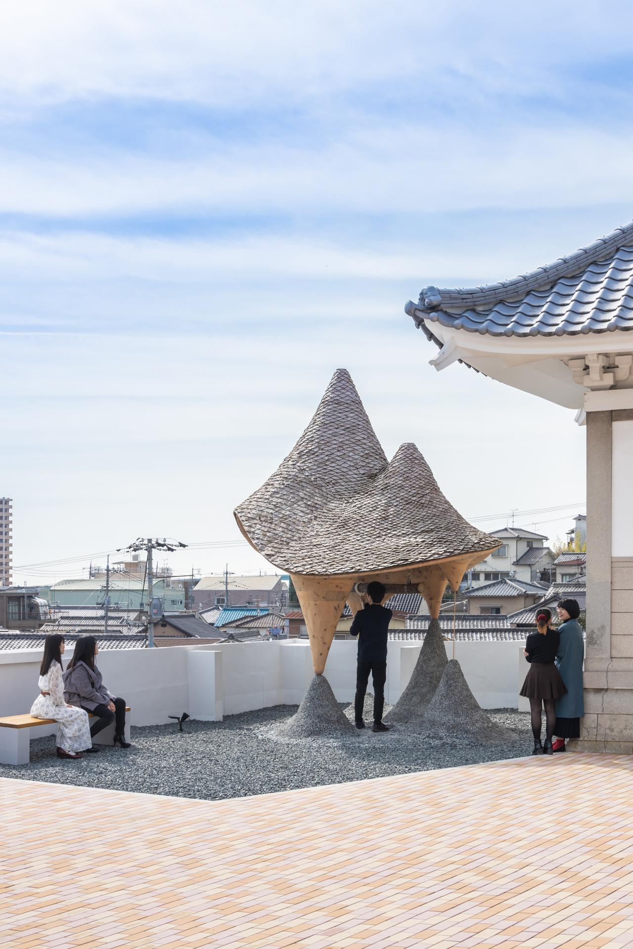 ご住職から「多くの方にお寺に興味を持ってもらえるようなものを」と要望を受け、洞窟や山を想起させる建築をつくることにした。特徴的な屋根は木材をジェンガのように積み重ね、3Dで削り出す技術を使って丁寧につくられた。木の塊が削り出された躯体が綺麗で、仕上げるのが惜しいくらいであった。彫刻と建築の間のような自由な造形が、お寺の新たなシンボルとして皆に愛されることを心から祈っている。