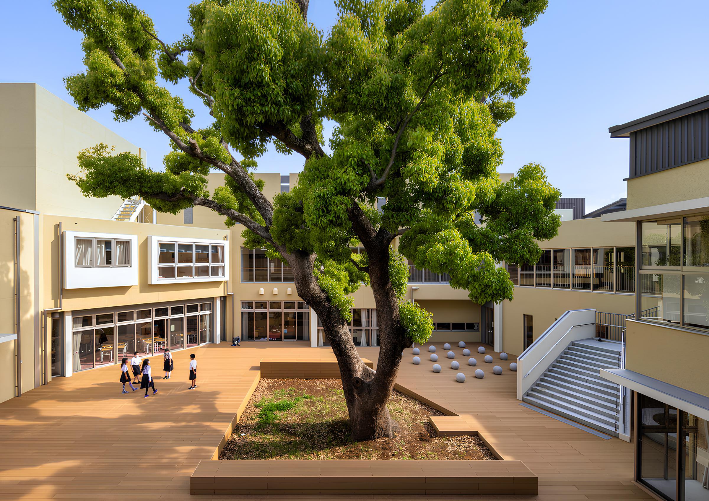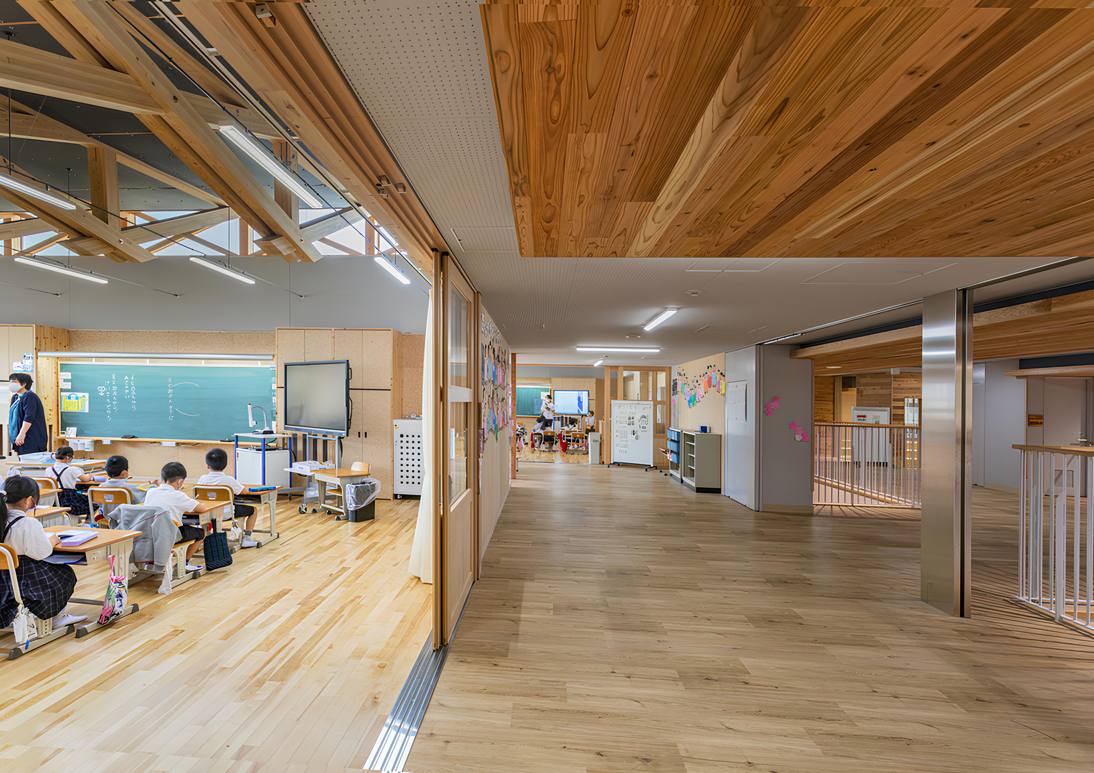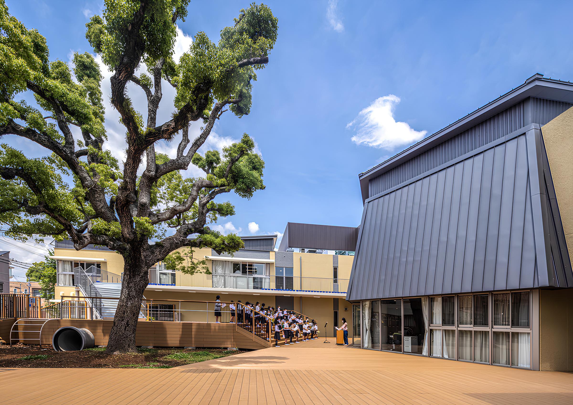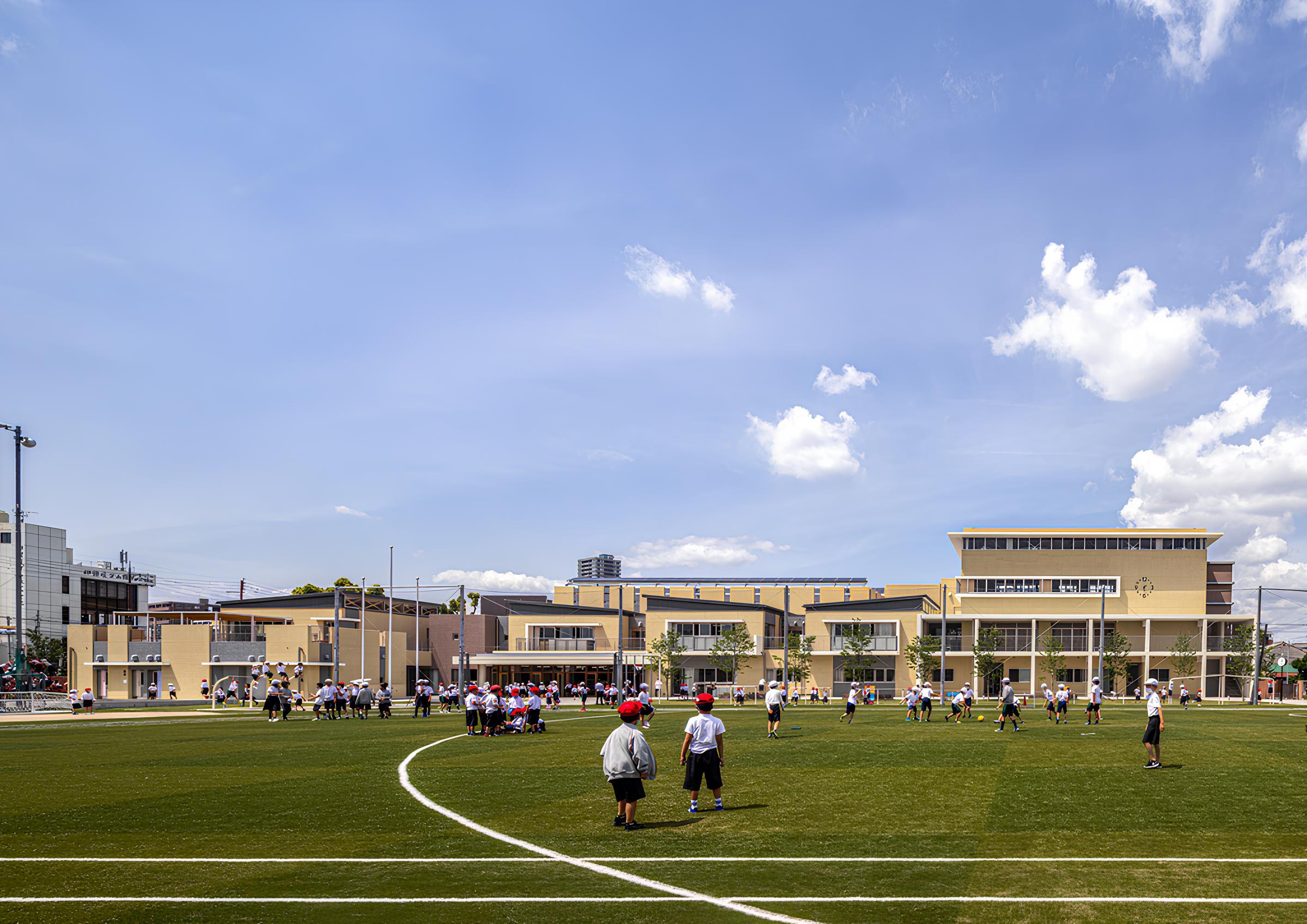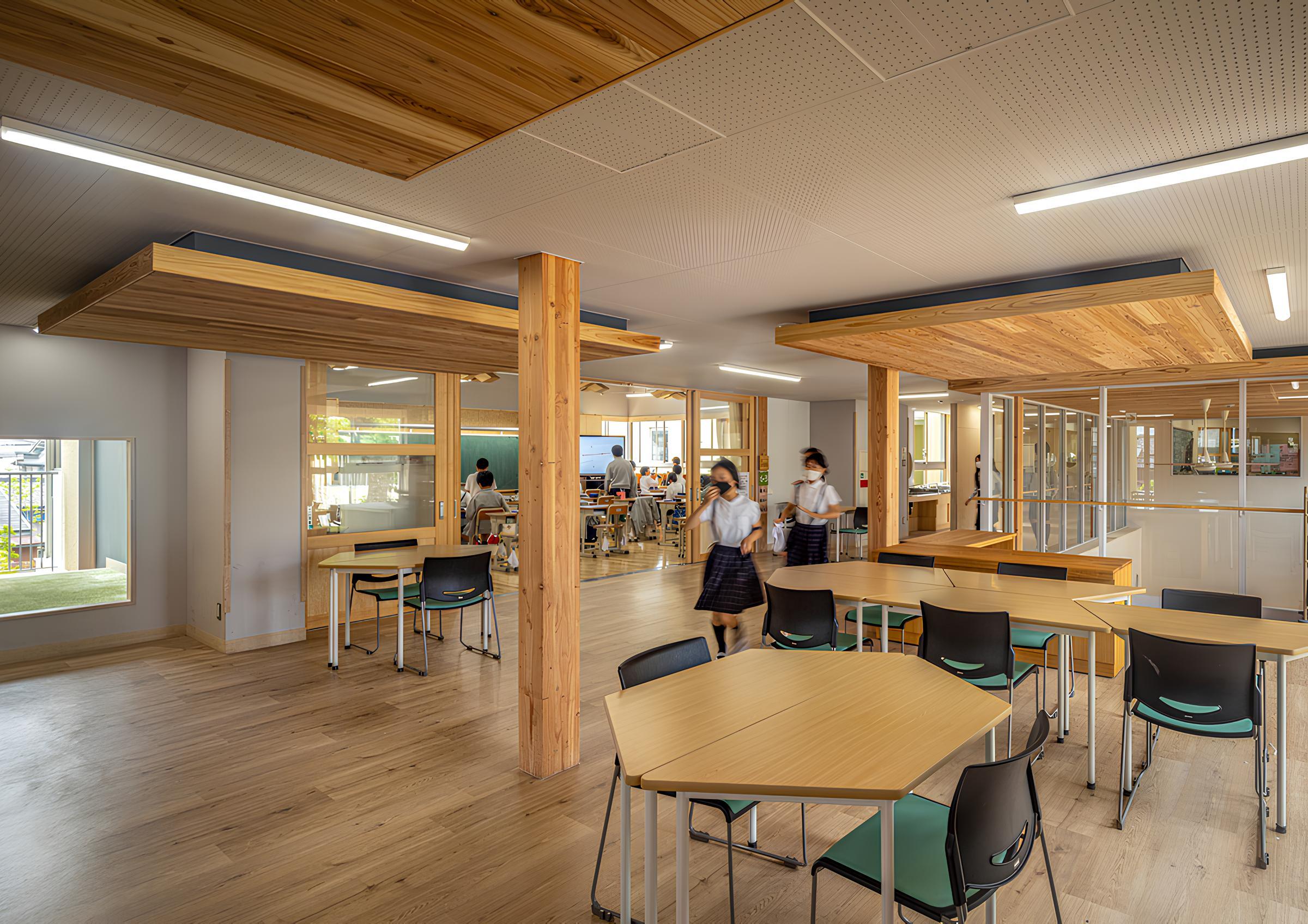 地域と学校がともに成長する、みんなに優しい木がいっぱいの学校を目指した。100年以上まちを見守ってきた3本のくすのきを活かした広場や屋外舞台では、地域の方々と先生方が協働した授業が展開され、子ども達の楽しそうな声がまちに響いている。校舎は木造とRC造の混構造とし、木トラスを用いた教室で都市部ながらも豊かな自然が感じられるよう工夫した。そのほか内装・家具・サインにも木を積極的に活用しながら各場所に特徴を持たせ、校内を廻るたびに新たな発見や出会いが生まれるような、学校全体にワクワクが連続する学び舎とした。