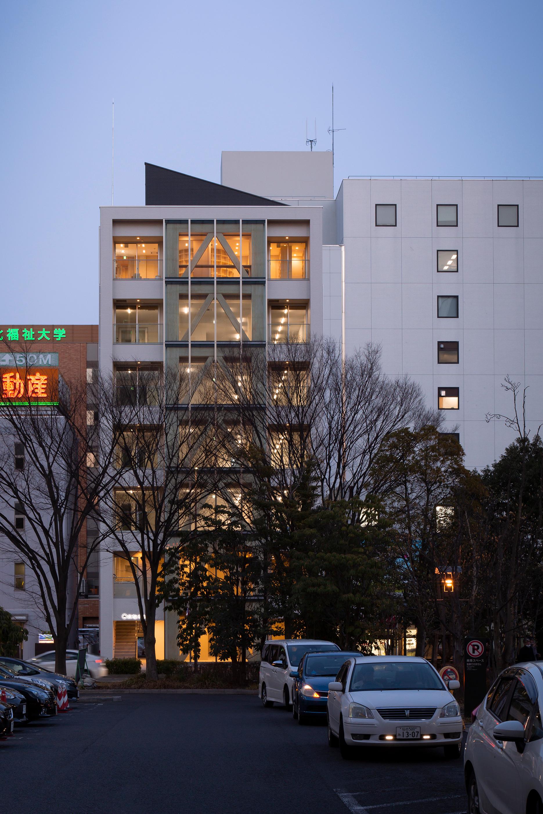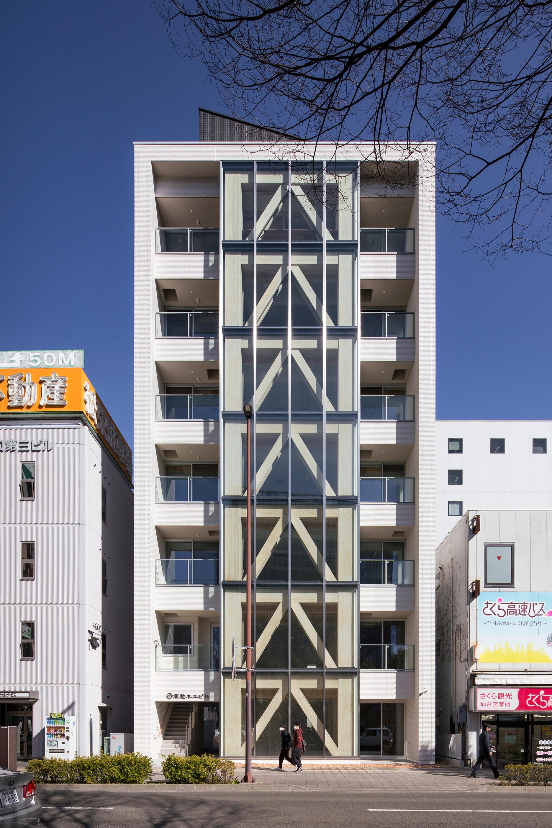 仙台駅東口正面に建つ日本初の製材による純木造7階建てプロジェクトである。カーテンウォールで内部の木を見せ、木造らしい温かみのあるシンプルでシャープな外観とした。