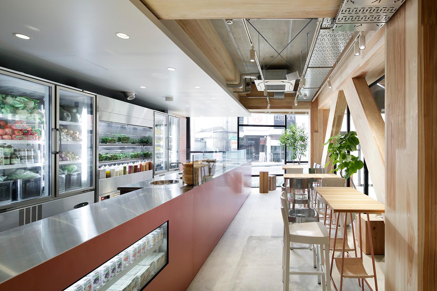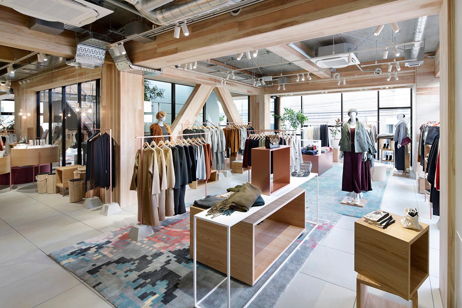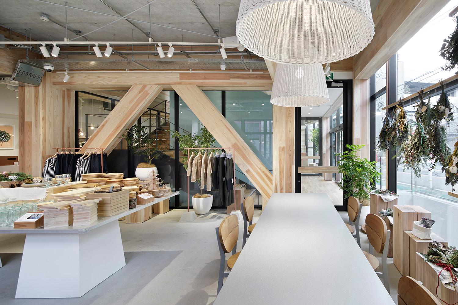 温かみと力強さを併せ持った耐火木構造の3階建建築は、構造自体が空間デザインとなり、店舗は木の空間をリスペクトしながら什器と商品によって空間にさらなる魅力と楽しさを作り出していく。
