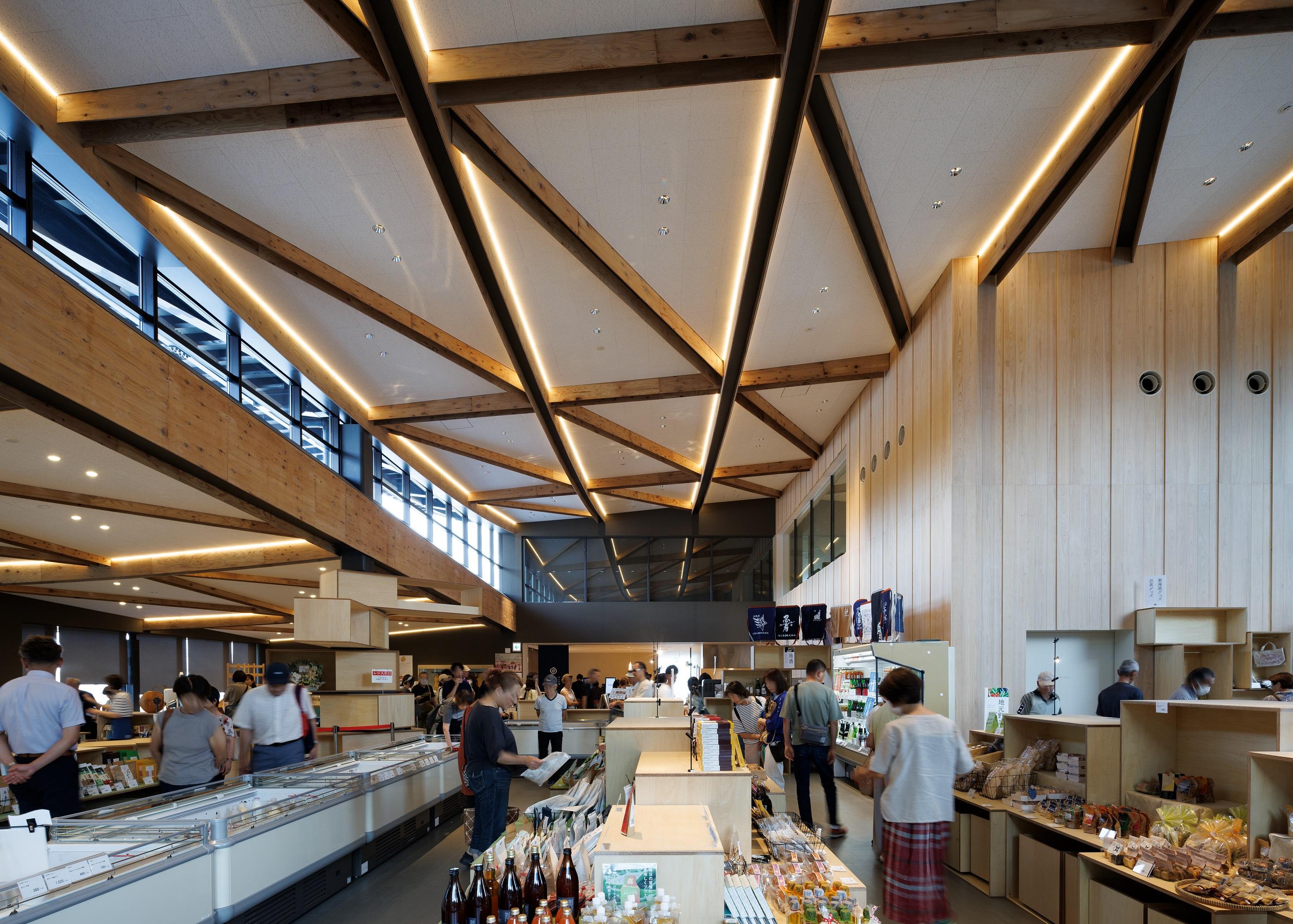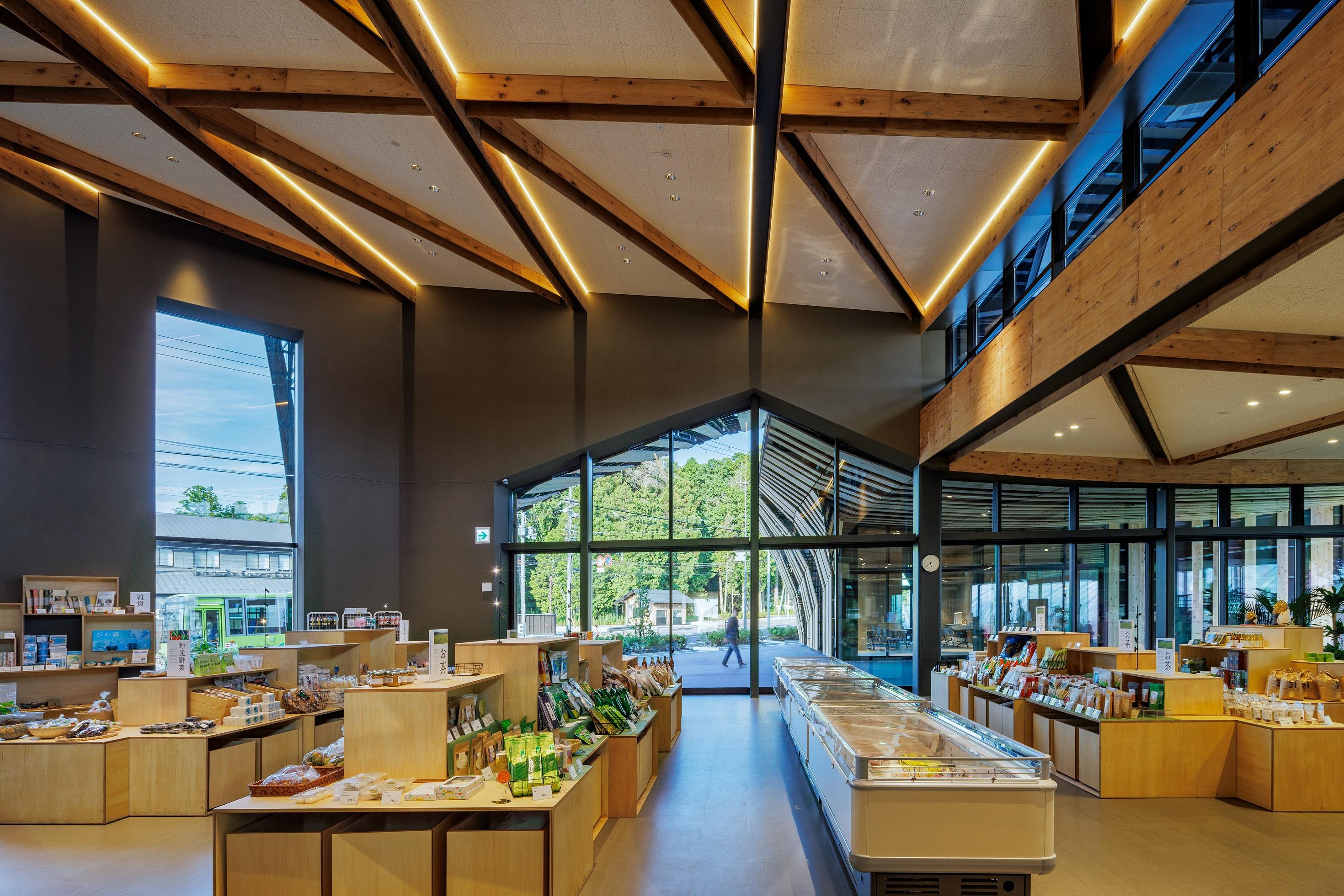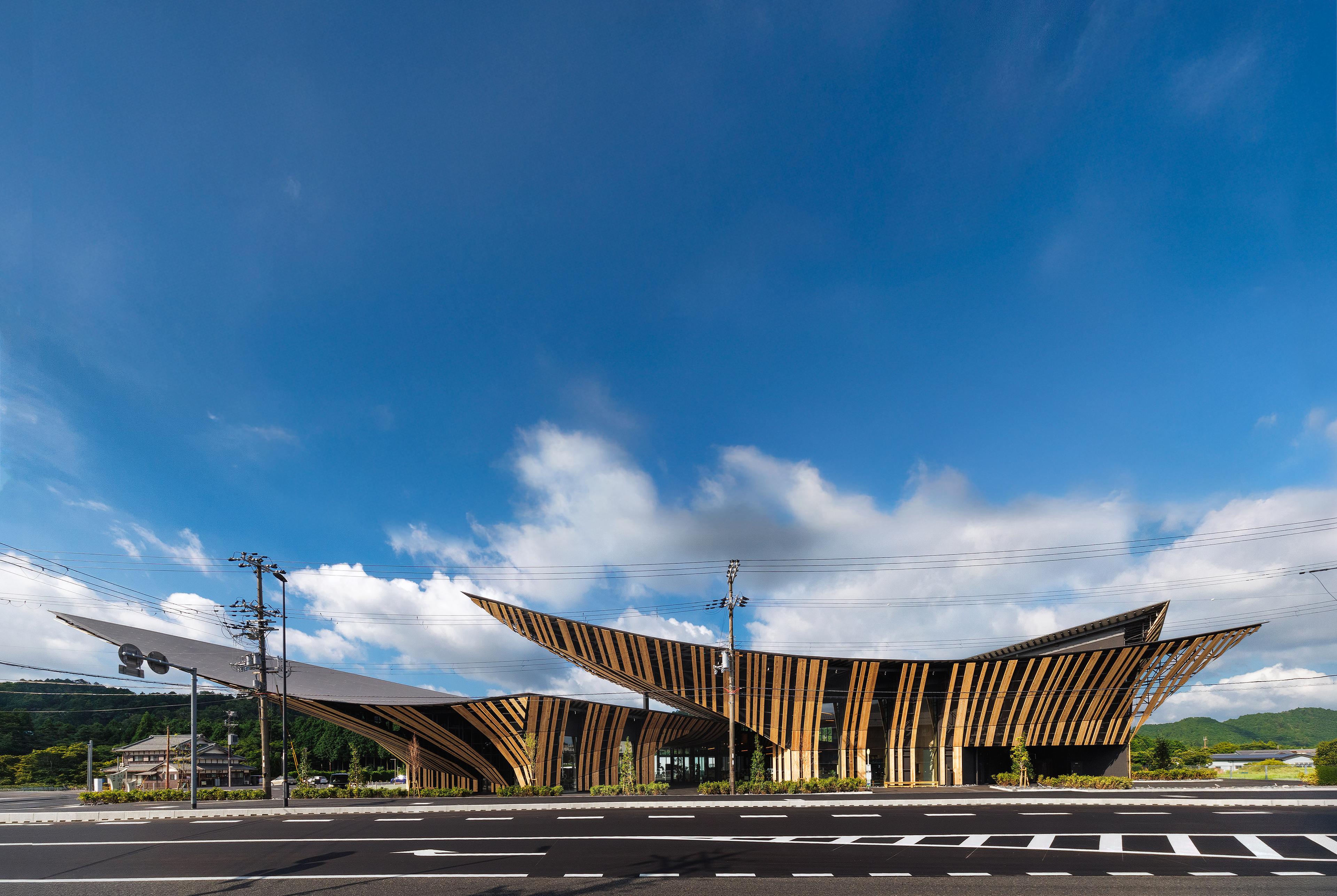 国内初の道の駅の内の1つである「道の駅あいの土山」のリニューアル。 デザインモチーフとして、屋根には周辺の茶畑から採れる土山茶の〝茶葉〟の形状、外部木ルーバーには歌川広重の浮世絵「東海道五十三次 土山 春之雨」でも描かれる〝雨〟の降る様を取り入れた。 屋根は最高高さ約14m、最高はね出し距離約22mとし、大地から軒裏に連続するびわ湖材のスギルーバーにより温かみと賑わいのある軒下広場を創出した。 三角形格子の曲げ加工したH鋼鉄骨梁は、内部の天井からもそのパターンを感じることができる。