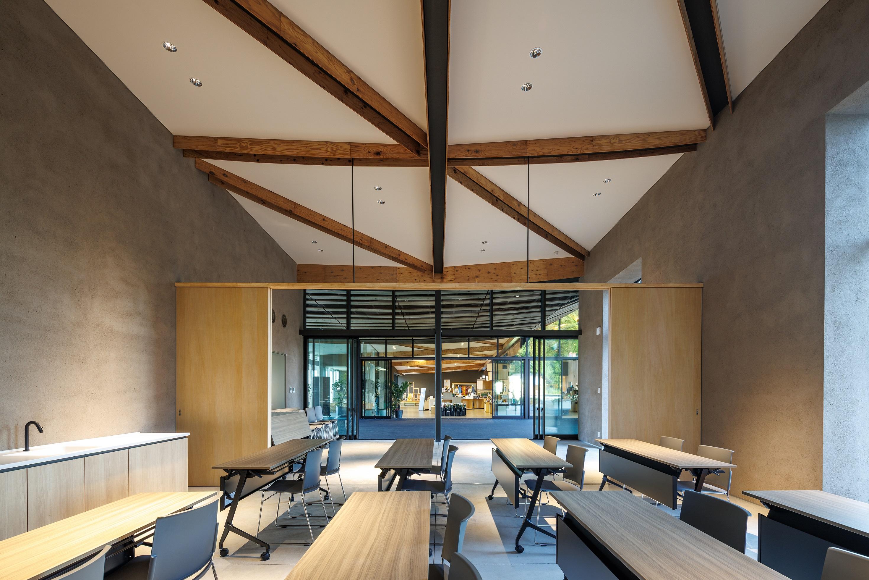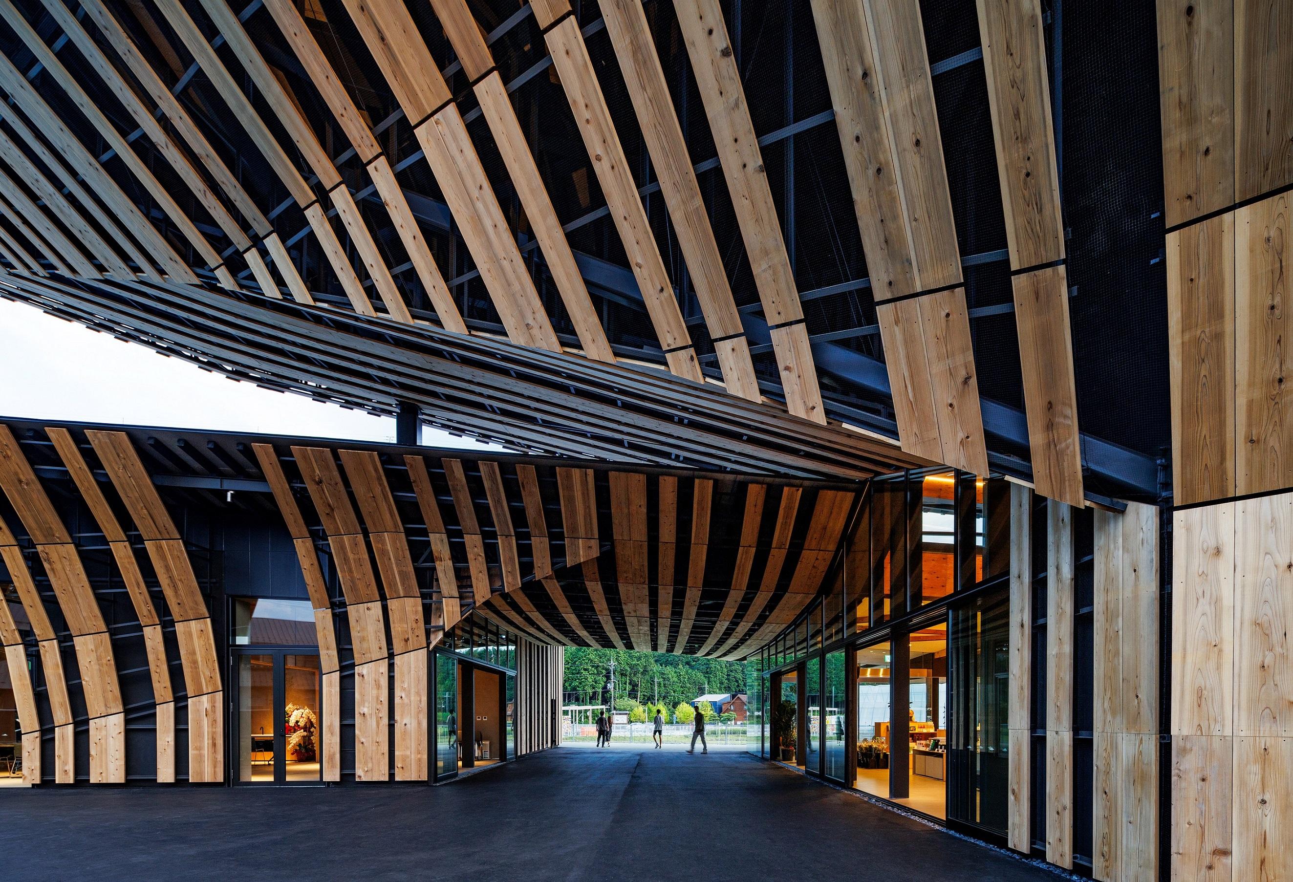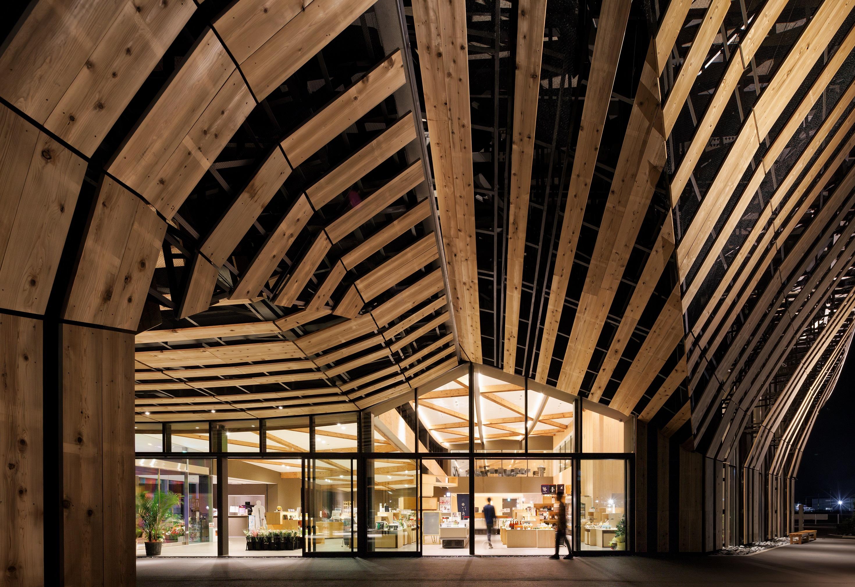 国内初の道の駅の内の1つである「道の駅あいの土山」のリニューアル。 デザインモチーフとして、屋根には周辺の茶畑から採れる土山茶の〝茶葉〟の形状、外部木ルーバーには歌川広重の浮世絵「東海道五十三次 土山 春之雨」でも描かれる〝雨〟の降る様を取り入れた。 屋根は最高高さ約14m、最高はね出し距離約22mとし、大地から軒裏に連続するびわ湖材のスギルーバーにより温かみと賑わいのある軒下広場を創出した。 三角形格子の曲げ加工したH鋼鉄骨梁は、内部の天井からもそのパターンを感じることができる。