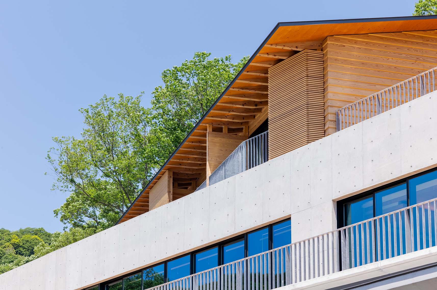 2階外壁は八溝杉の下見張りとし、木質の温かい表情を創出