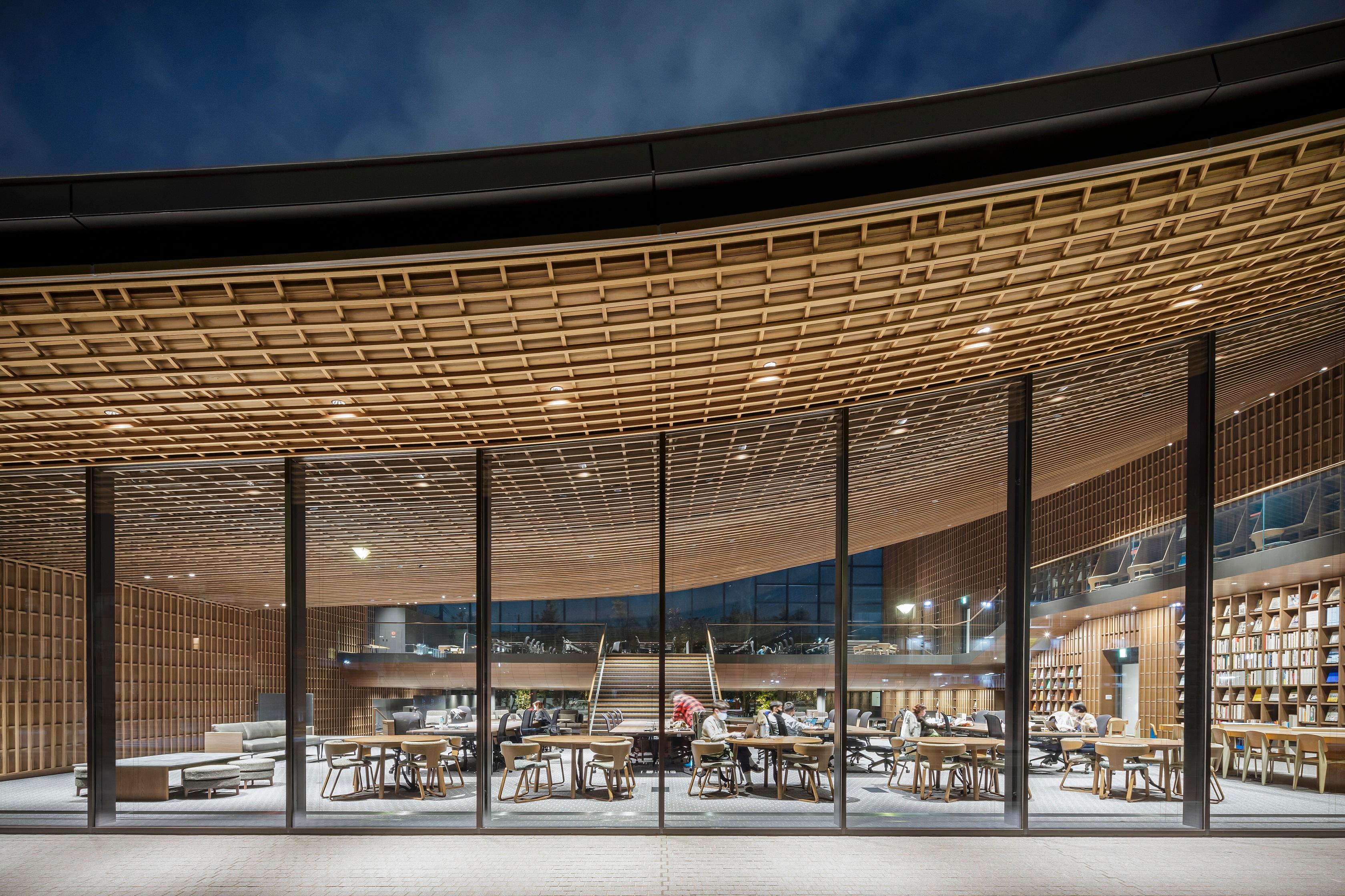 ZOZO本社屋は、スタッフ同士の顔が見える吊り屋根の無柱空間が特徴である。街路と一体化した大開口とはね出しの大庇は、ストリートから生まれるトレンドを観察する習慣を促している。2~8mに変化する天井高とスキップフロアによって、フリーアドレスの執務空間にパブリックとパーソナルな空間がグラデーション状に生まれている。30×30mmの木材をR=39mの曲率で曲げ、柔らかに編み込んだ繊維質の屋根と壁は、大きな布のようにたっぷりと垂れ、人びとをやわらかに包みこむ。ZOZOらしい「着心地のよい服のような建築」である。