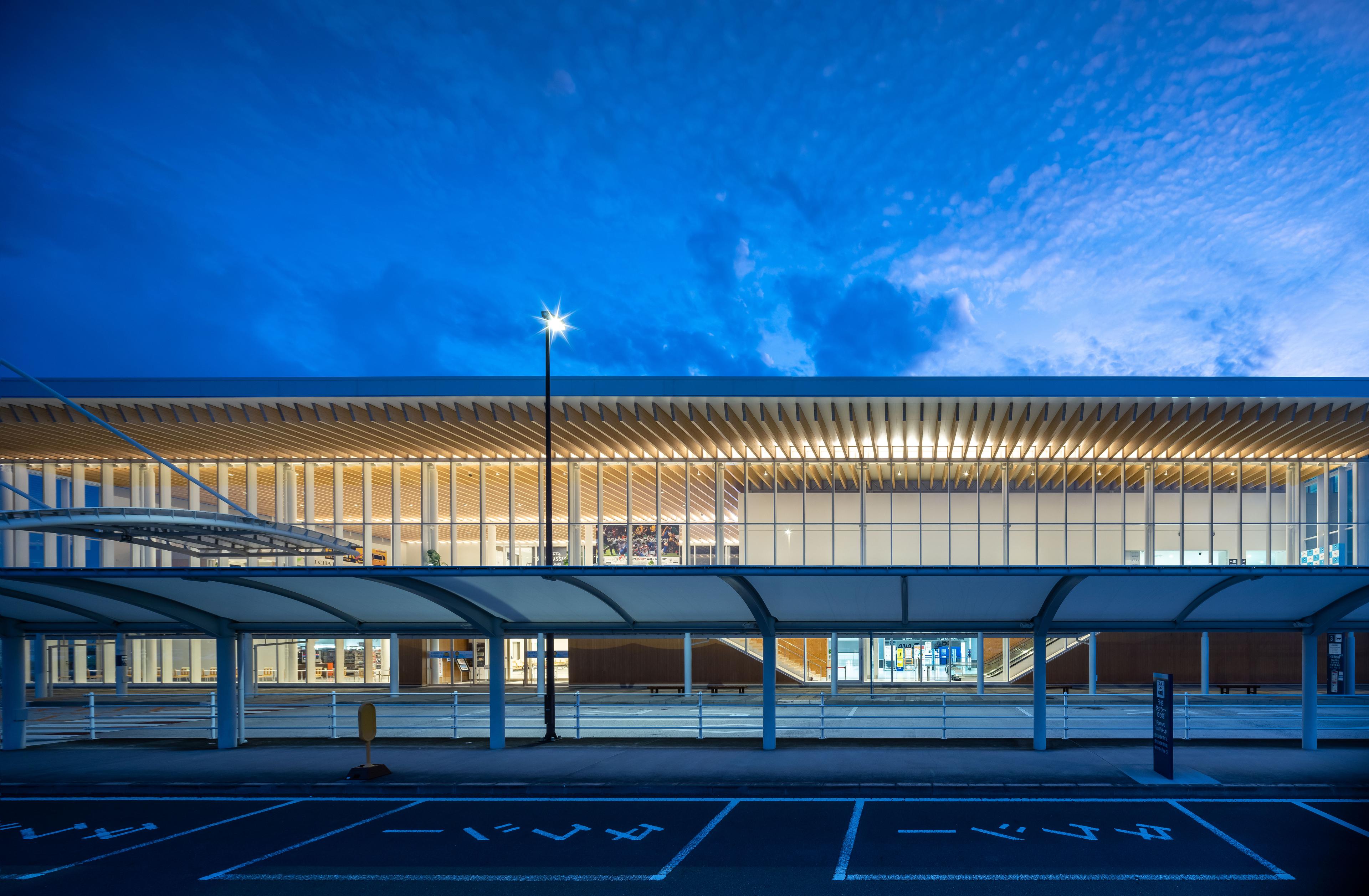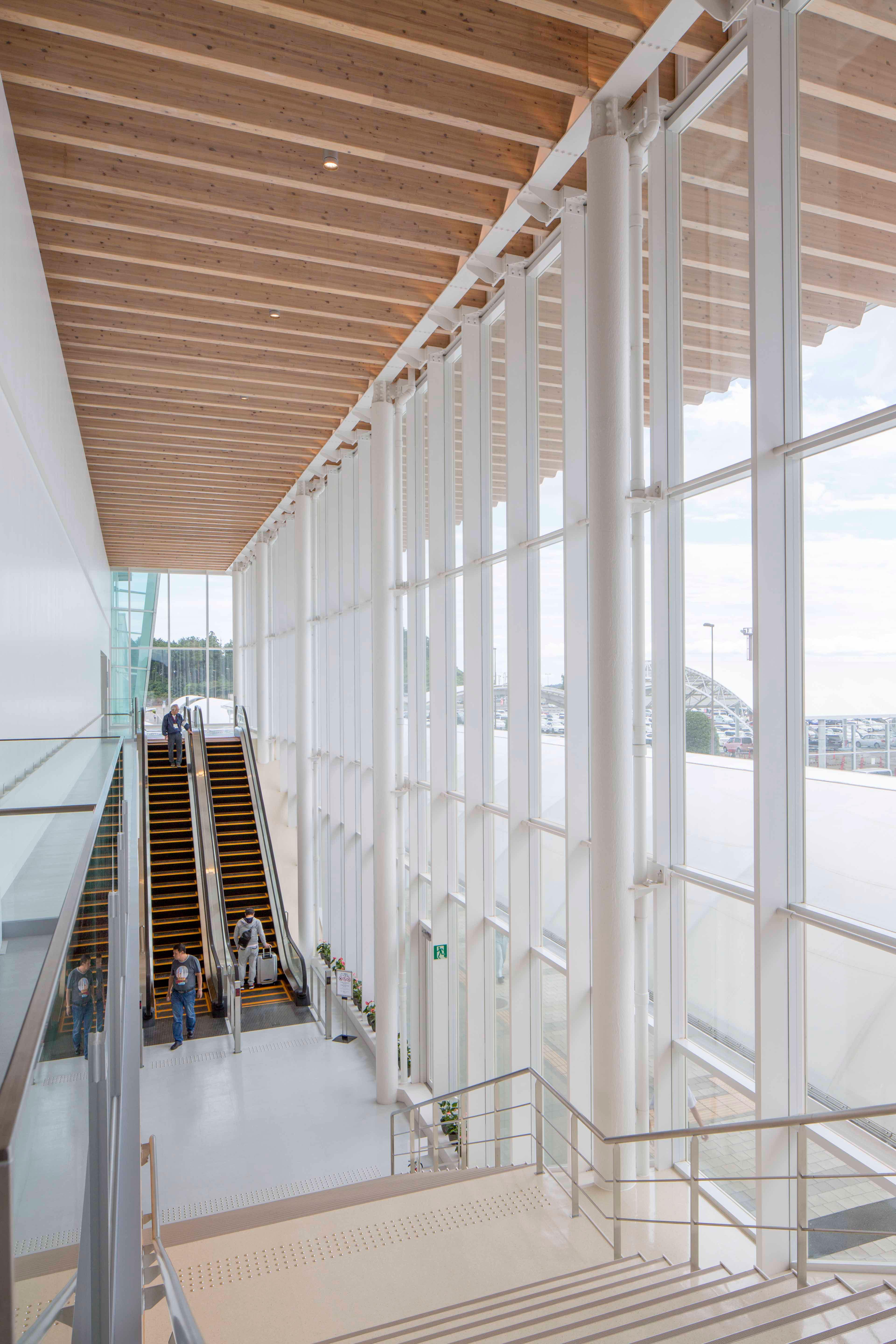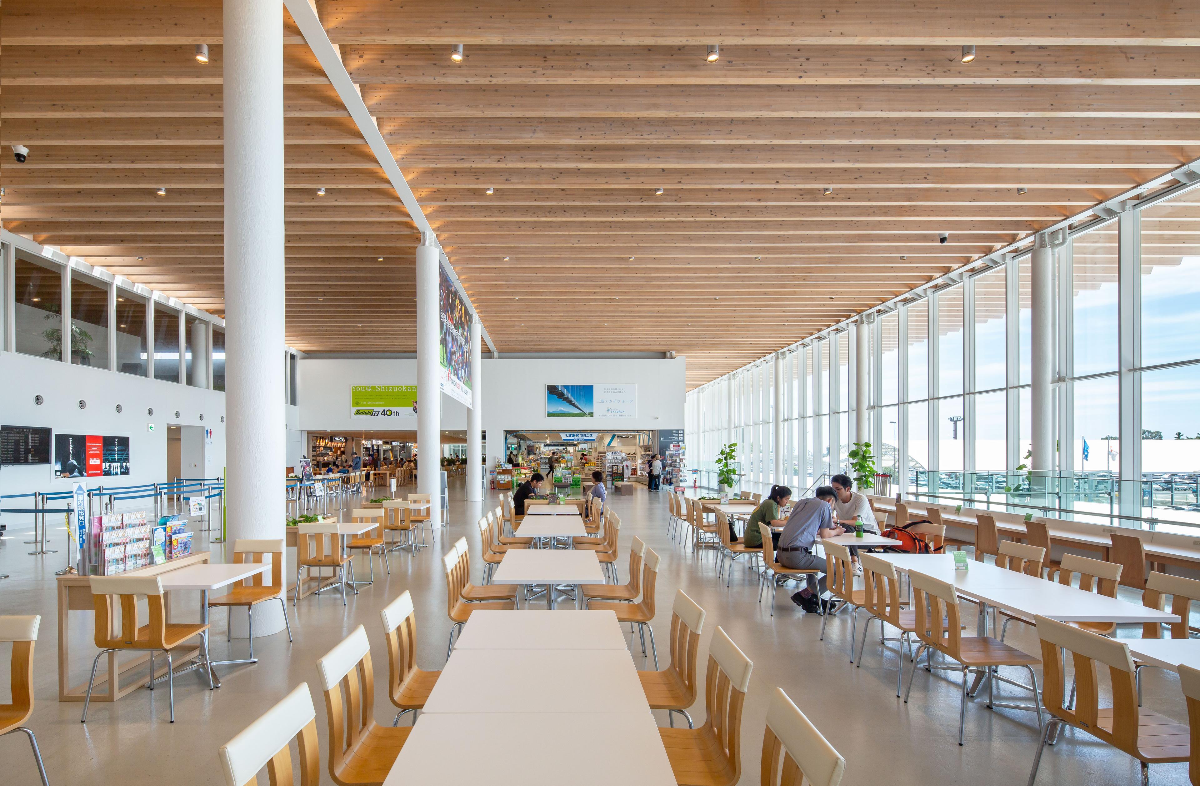 既存空港ターミナルビルの増築・改修である。大断面の静岡県産のスギ集成材をシンプルに700㎜ピッチのジョイスト状に使い、大屋根の構造としている。ジョイスト梁は、スパンごとにそれとは直交方向の大梁で受ける必要があるが、空間がスパンごとに分断され空間の流れが損なわれてしまう。そこで大梁をなくし、ジョイスト梁を連続して見せる方法として、木と鉄のハイブリッドトラス梁と考えた。正面のドロップオフの大きな庇の木架構が、そのままロビーからボーディングのエアサイドまでつながり、利用客を柔らかく覆う空間となった。