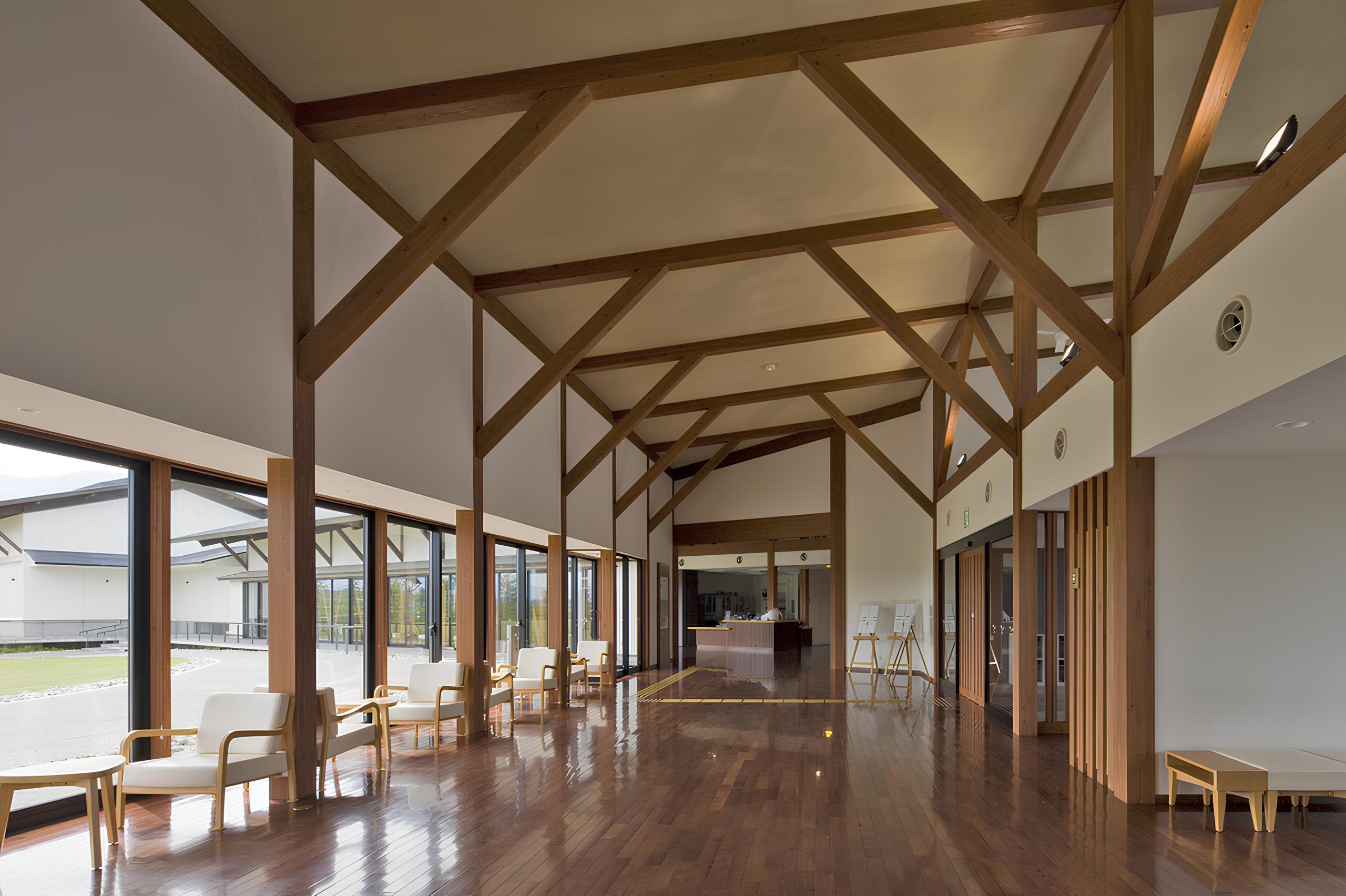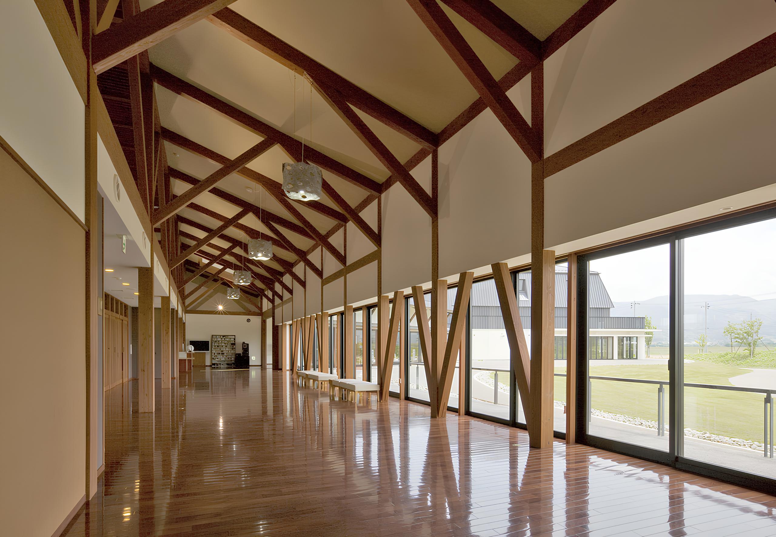 施設は、文化伝承室を中心とする文化伝承発信ゾーン、町出身の洋画家・梅津五郎氏(1920~2003)の作品を展示・収蔵、また創作活動発表の場となるギャラリーゾーン、ホールを中心とする多目的交流ゾーンで構成される。交流回廊とロビーは広場との中間領域として視覚的・機能的な開放性を持ちながら、これら各ゾーンを有機的に繋ぎ、外部の多目的交流広場を取り囲む配置となった。