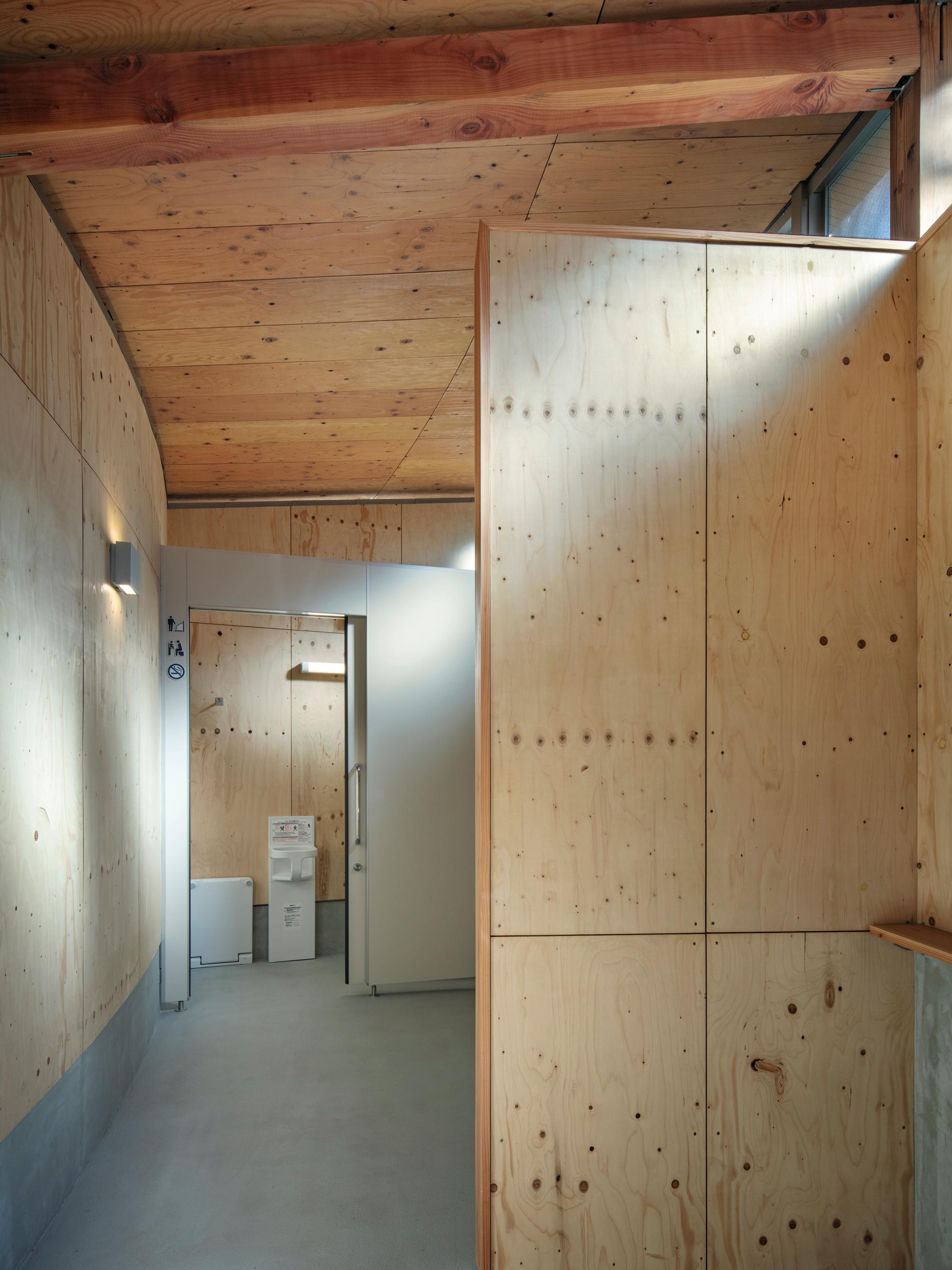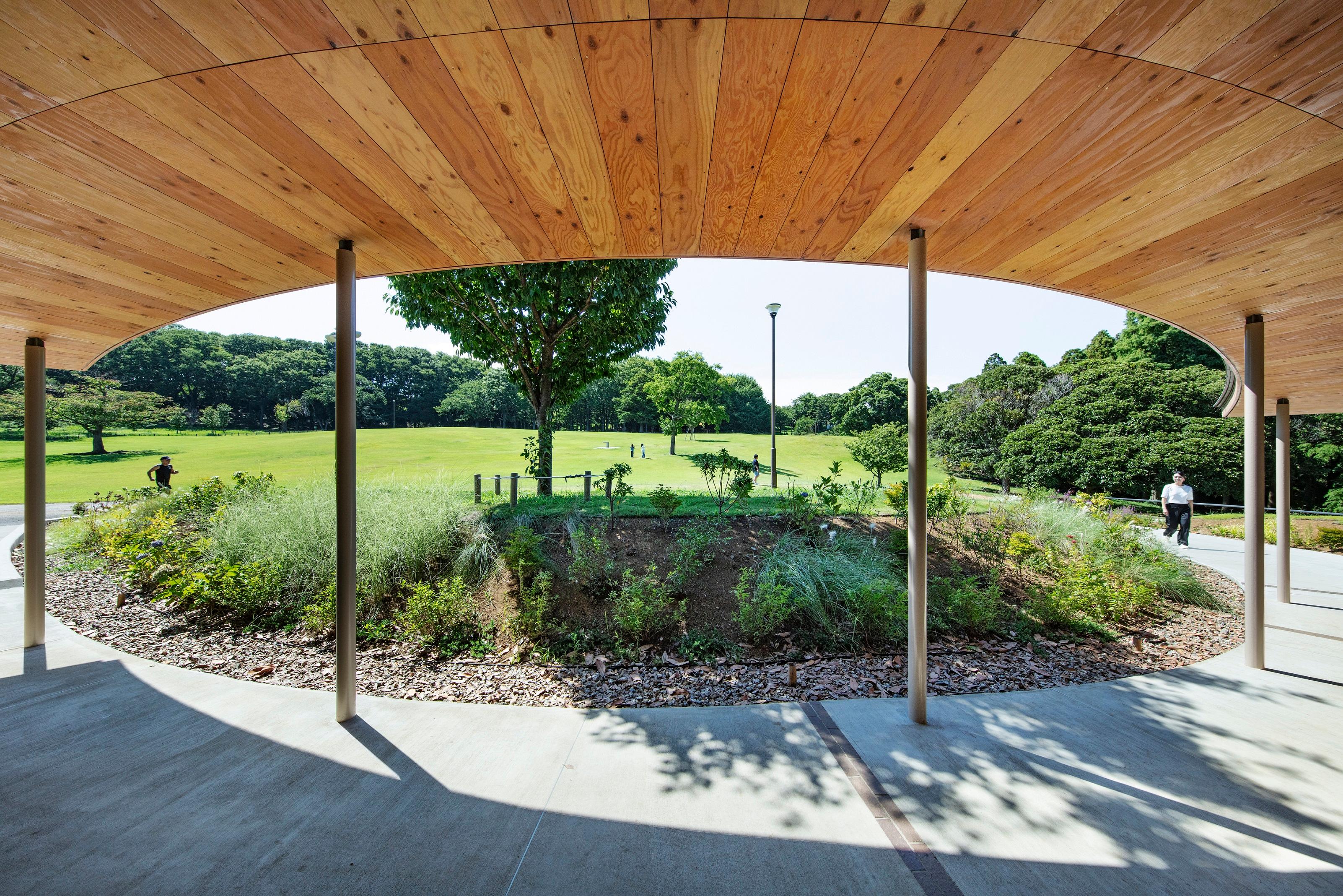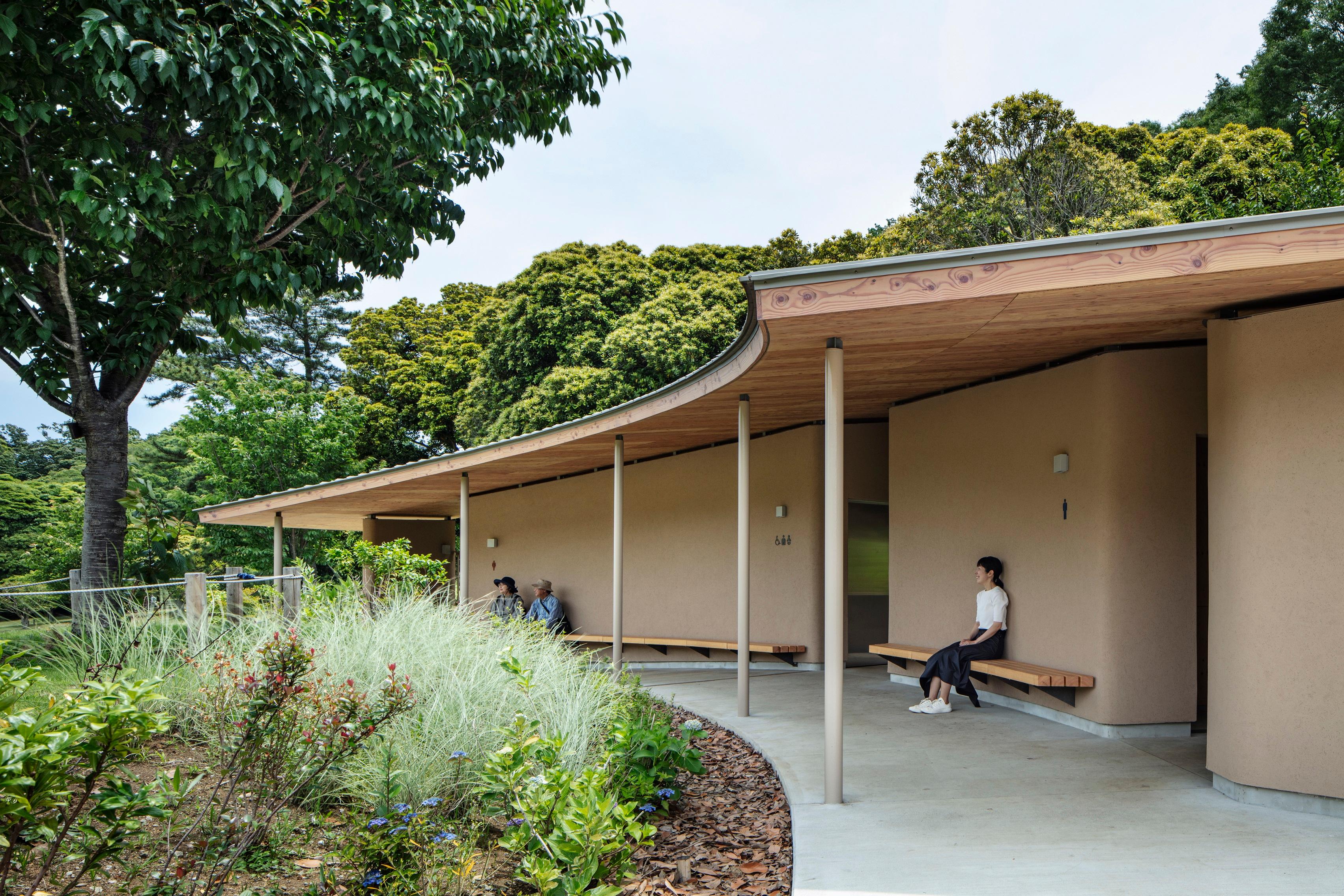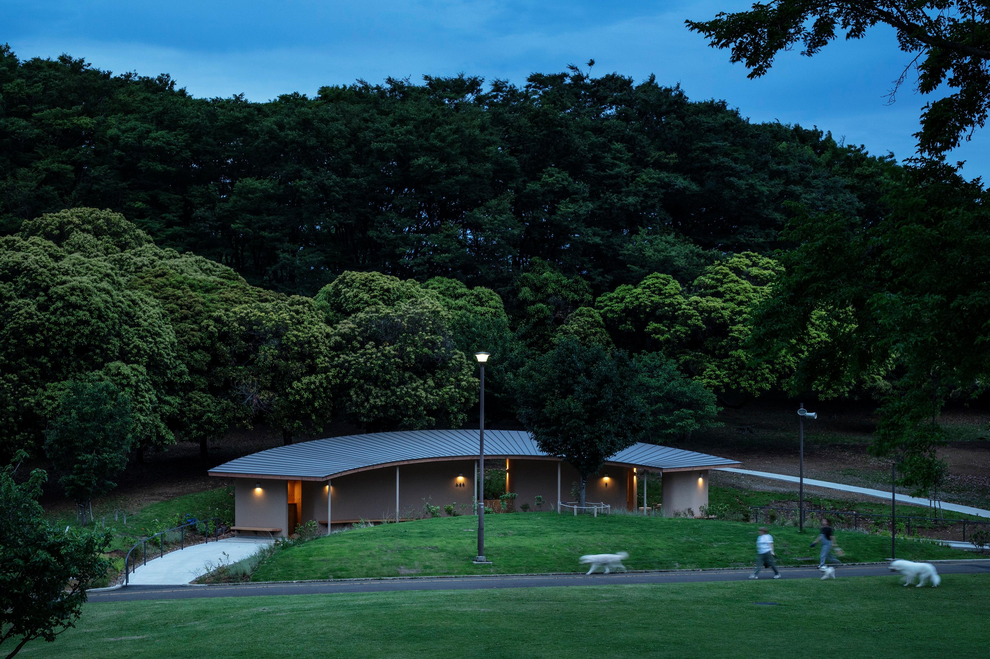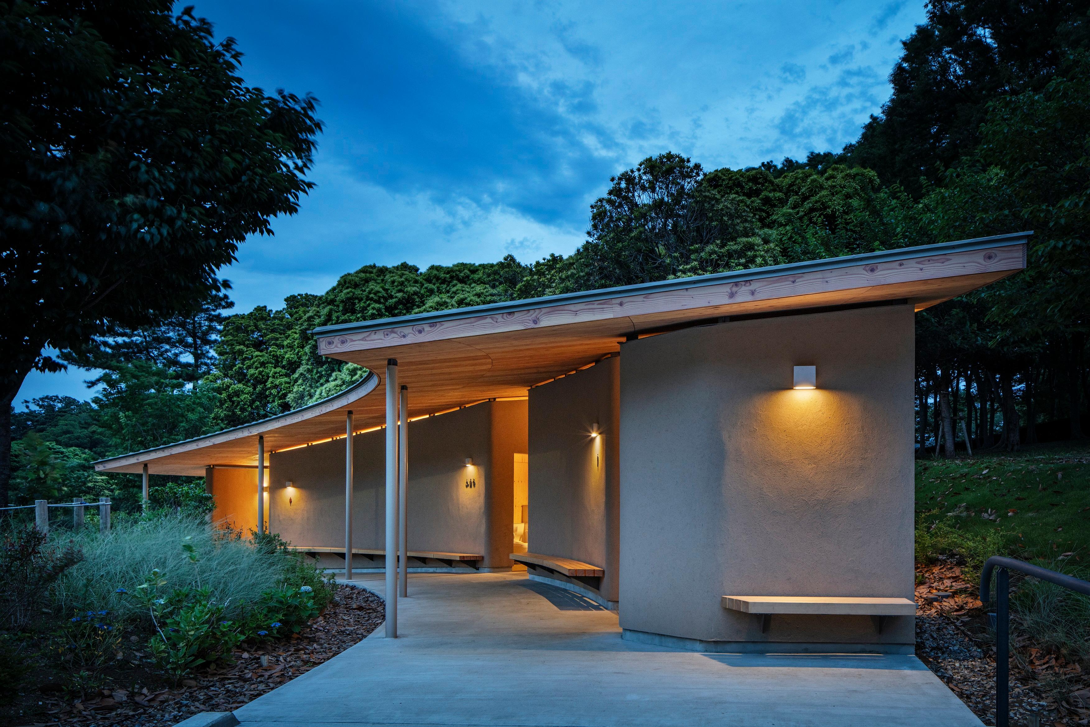 丘陵地の風景に調和し、ふと通り抜けたくなるような自然の小道と一体になった公共トイレを目指した。園路からなめらかに分岐する緩勾配のアプローチは、車いすやベビーカー利用者を含め、だれもが自然の地形を楽しみながら通り抜けられる。動線に並走するように整備した植栽帯は、歩きながら変わるシークエンスとともに、多彩な植栽の表情や四季の移ろいを感じる。軒下は風速が抑えられた穏やかな風環境と、日射の和らいだ休憩スペースになっている。分棟型の構成は、自然光や風を十分に取り込み、快適なトイレ環境の維持に貢献する。そして、公園の豊かな土壌を育て未来へつなぐための試みとして、雨水浸透を促す土中改良、建設残土の場内利用、子供たちとの植樹ワークショップの開催などを実施した。