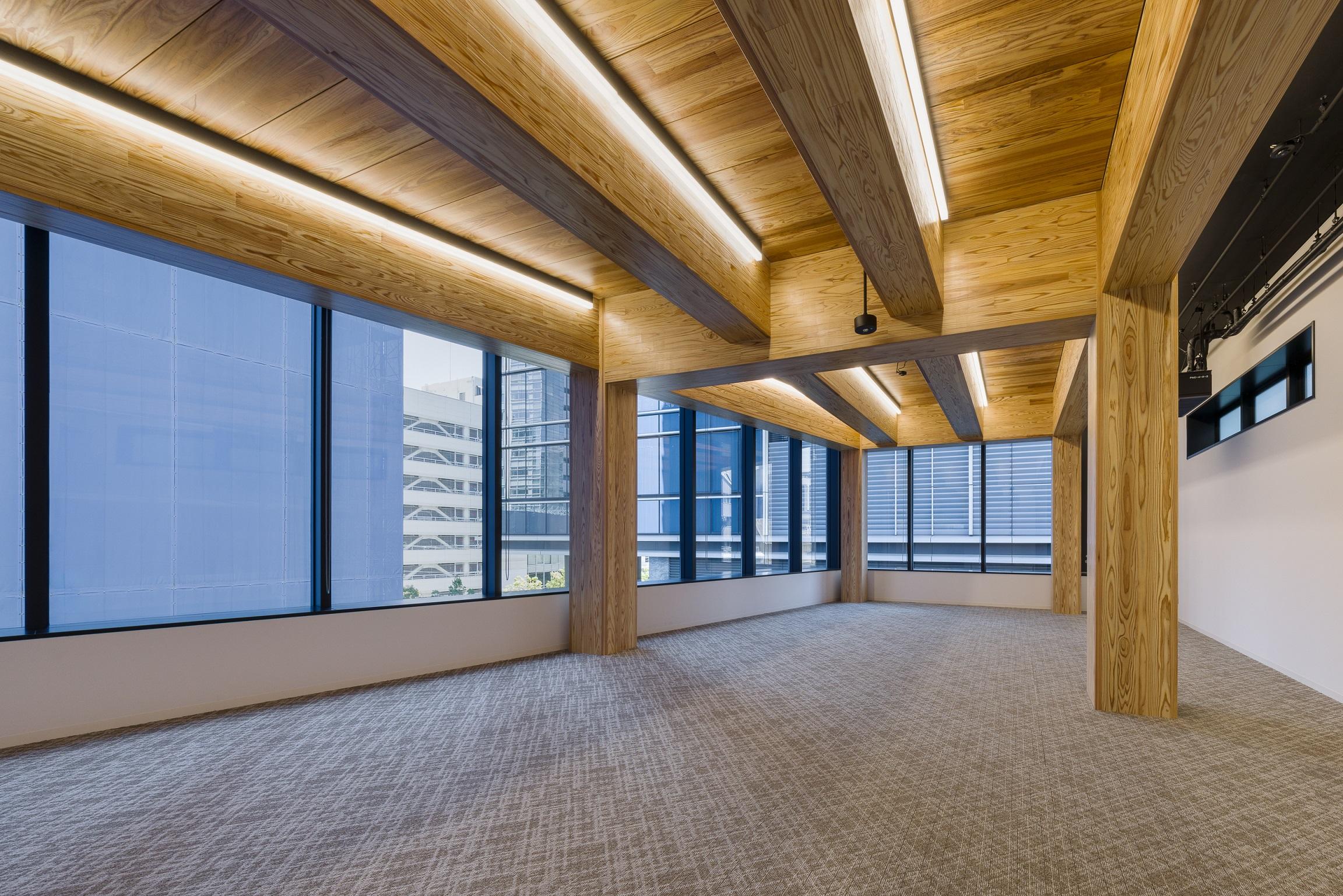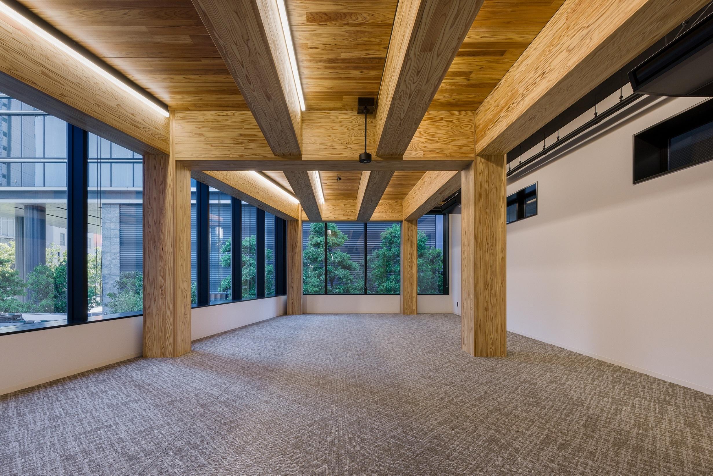 東急建設が事業主・設計・施工を一貫して手がけた、店舗・貸事務所の自社開発ビル。RC造と木造の平面混構造4階建てで、1時間耐火のモクタスWOOD耐火やMIデッキを採用。RC造と木造の対比を1フロア内で体感できる。木造部の外装はカーテンウォールを採用し、外部からの視認性と室内の開放感を生み出すデザインとした。
