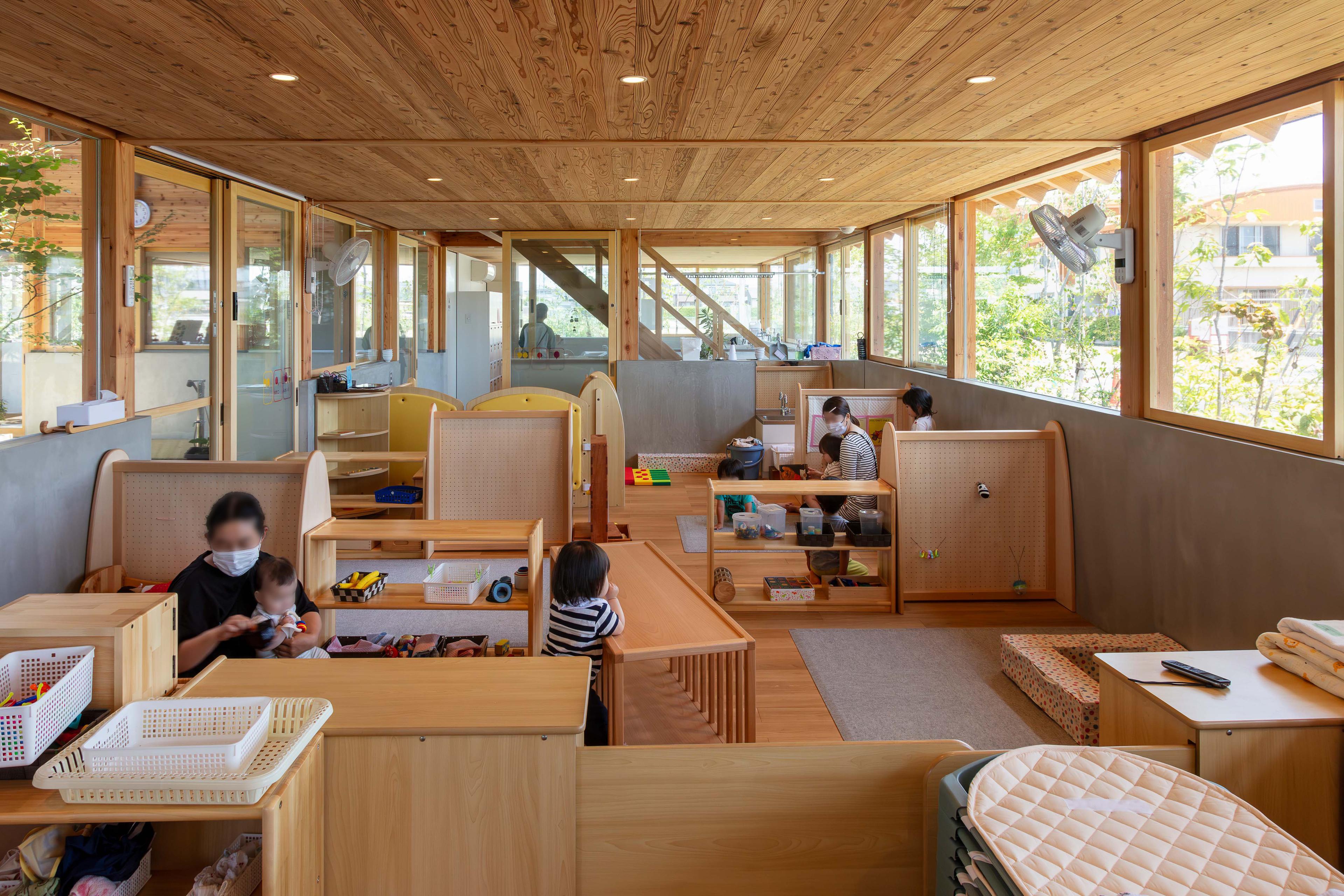 初めて親元から離れるこども達は、それだけでとても不安な心境である。加えて大人の世界は威圧感を与えとても強く目に映るのではないか。そのような刺激の強さを和らげる建築をつくりたいと考え、内外の境が曖昧に感じる中間領域でこども達の居所づくりを行った。園舎は、周辺環境を取り込んだ「街のあずまや」のような存在を目指した。あずまやは、公園など広い場所に開放された環境にありながら、人が休憩や雨宿りをする拠り所になっている。地域のこども達がこのあずまやに集まり安心して保育生活を送ることは、ここでの一つの正解になると考えた。