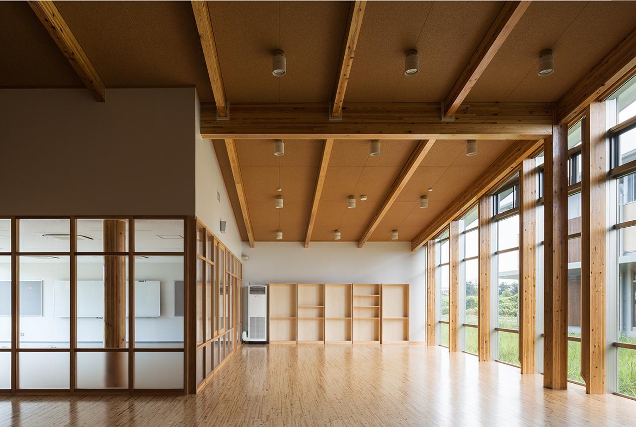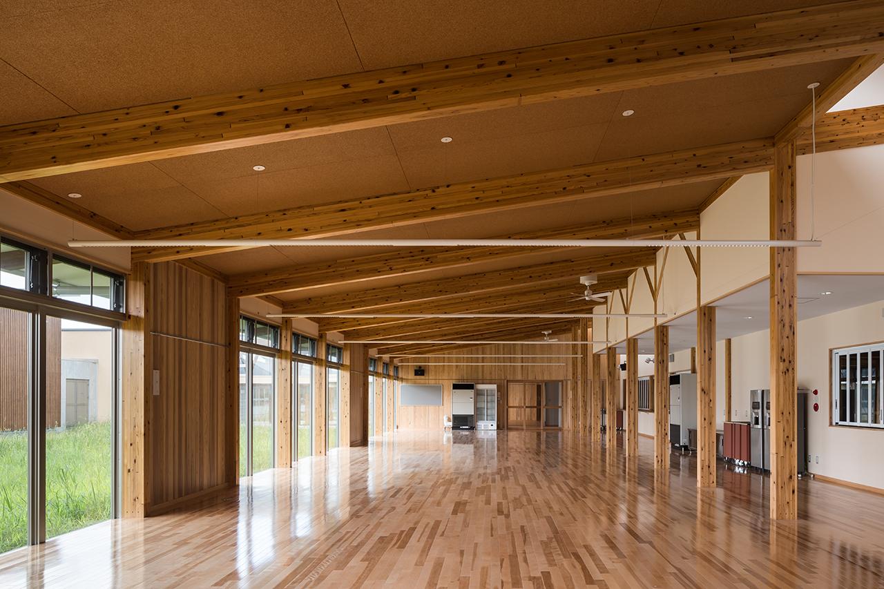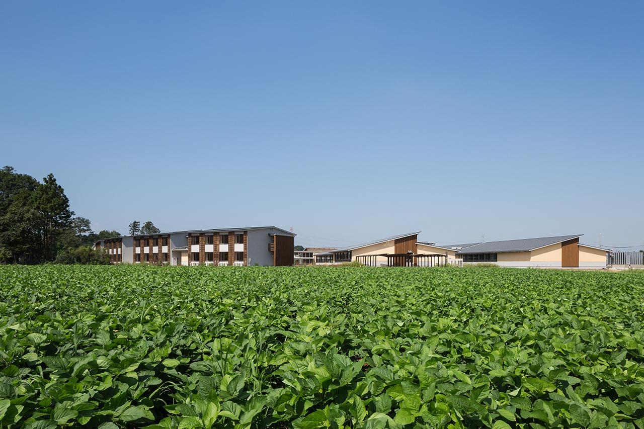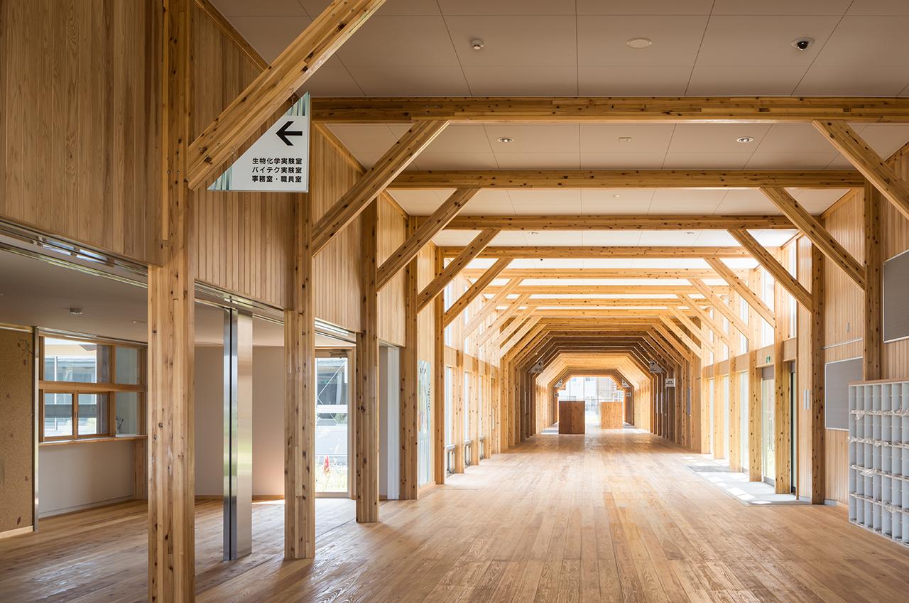 平成27年4月、埼玉県熊谷市に移転する木造新校舎(延床面積7 ,753㎡)は講堂・ゼミ棟・職員棟・食堂などで構成された9棟を通路棟がつないでいます。「木のぬくもり、香り、素材感を感じてもらう」というコンセプトのもと、構造材料の杉・桧集成材は100%埼玉県産材を使用しています。内部は木架構を見せ、杉材の風合いを活かした意匠デザインとしました。有機農業専攻の新設や6次産業化教育の強化など、教育内容を充実させ、未来の農業を担う若者たちの育成機関として、魅力ある農業大学校となるよう取り組んでいきます。