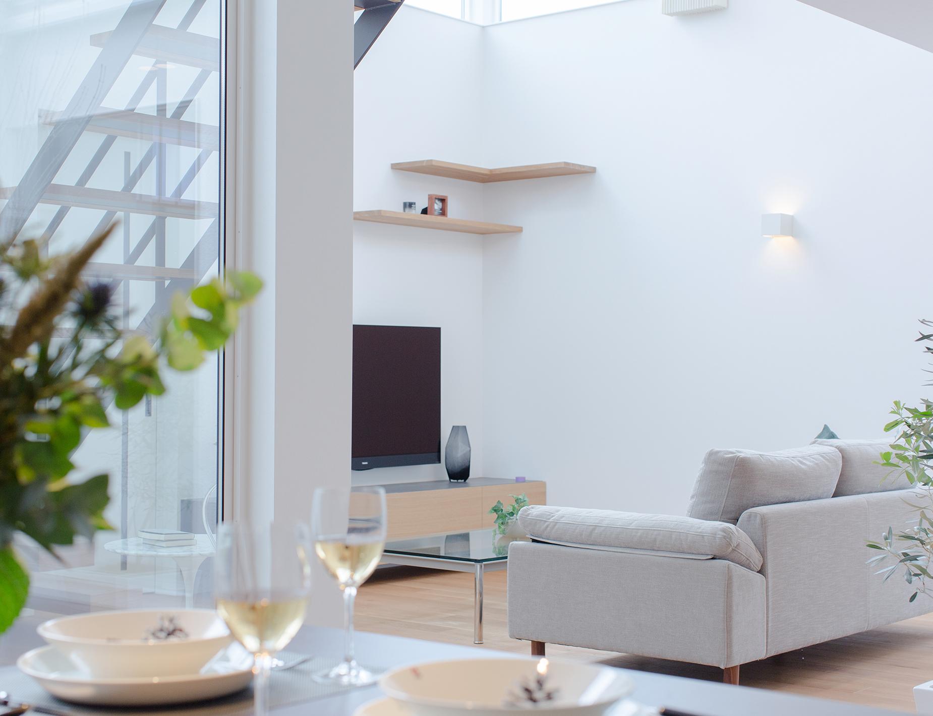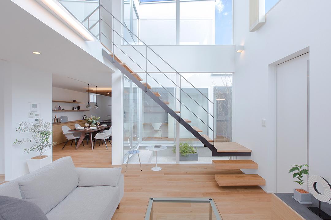 中庭から柔らかな陽が降り注ぐ 吹抜けのリビングルーム