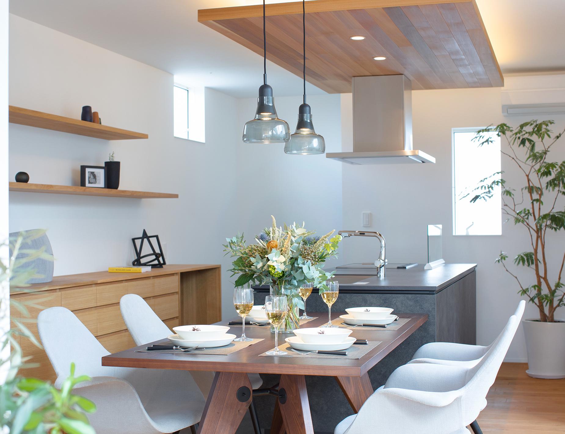 ダイニングから庭や青空の爽やかな眺めを楽しむ