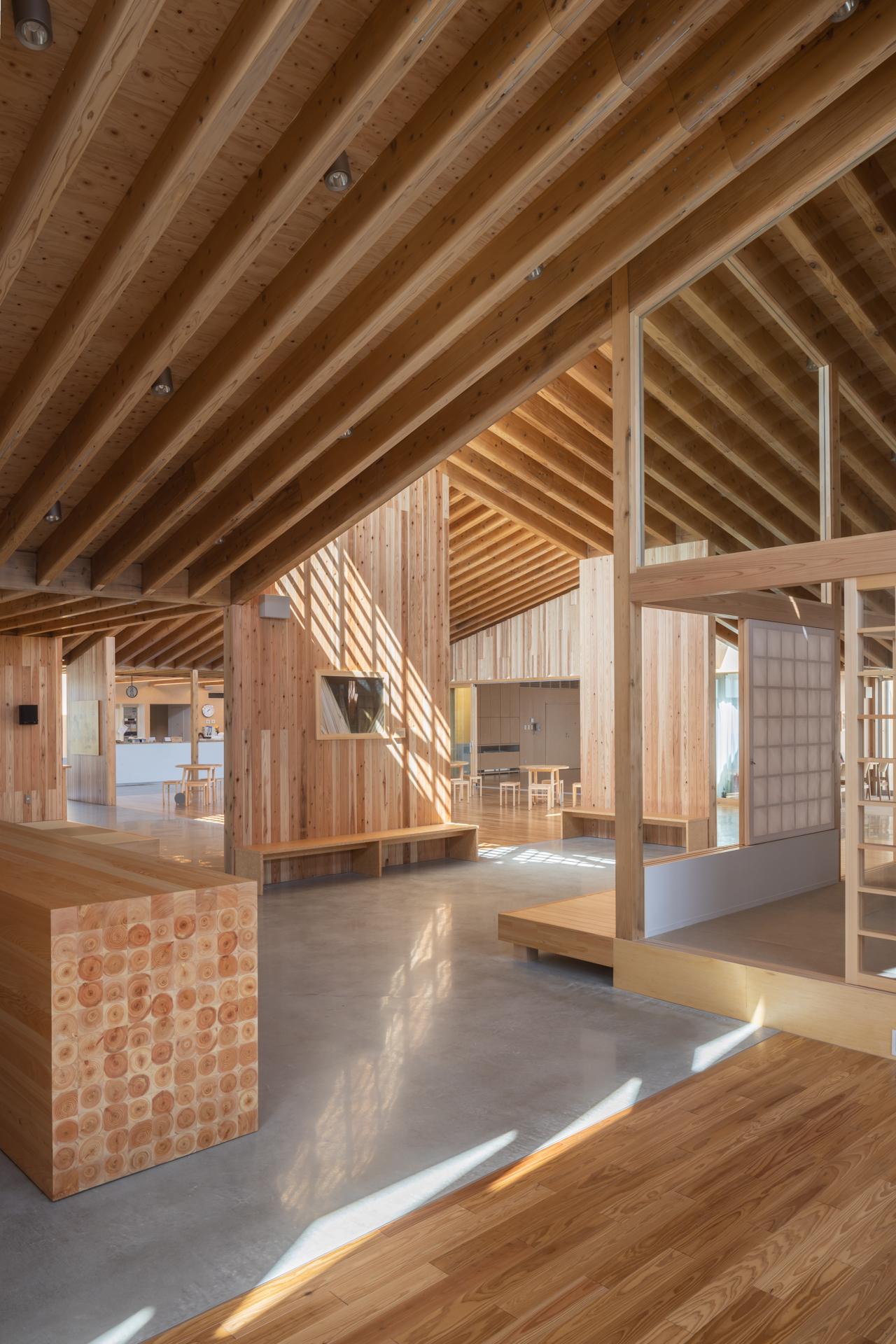 多賀結いの森は、約2500平米の木造平屋の中央公民館である。新しいまちづくりの拠点となること、町の木材を最大限使って魅力的な空間をつくることが求められた。誰もが目的がなくとも気軽に訪れ、くつろげる場となるように、共用部のあちこちに居心地のよい場所をつくりたいと考えた。そこで、地元で入手しやすい製材を金物でつなぐことで生まれる大きな片流れの屋根を様々な向きにかけ、多様なスケールの生まれる構成を考えた。屋根の隙間からは光が差し込み、雁行してつながる平面の間に庭や多賀の山々が垣間見える、たくさんの居場所が連続していく空間となった。