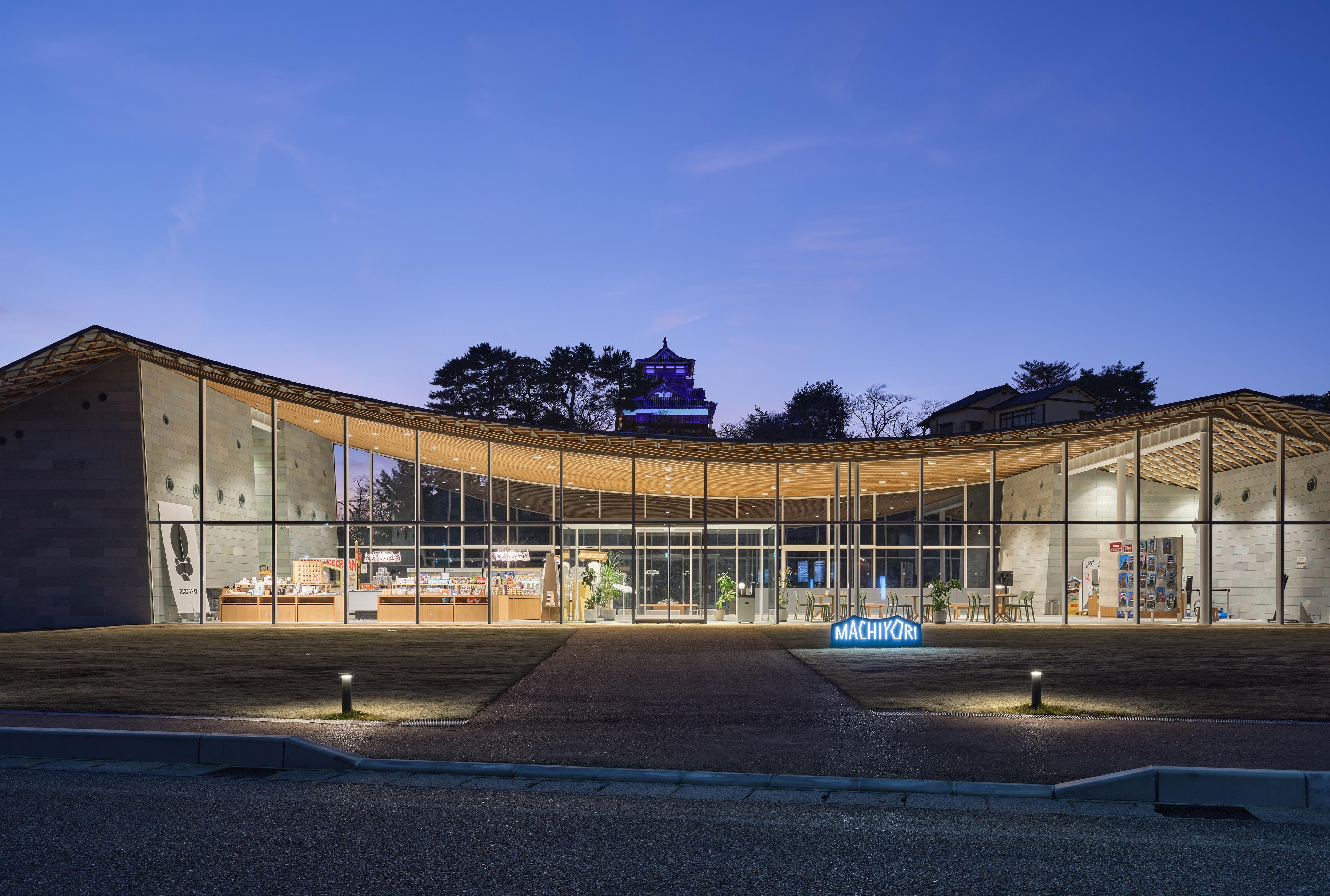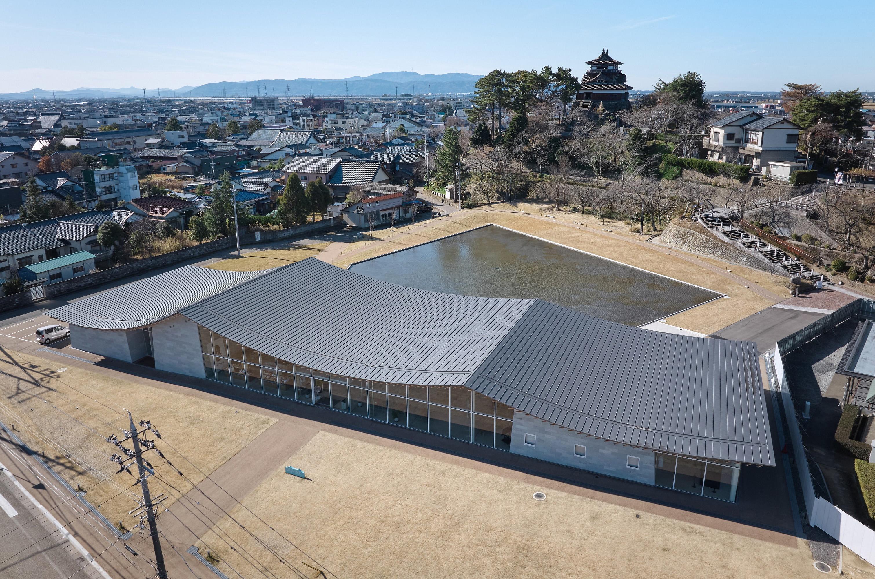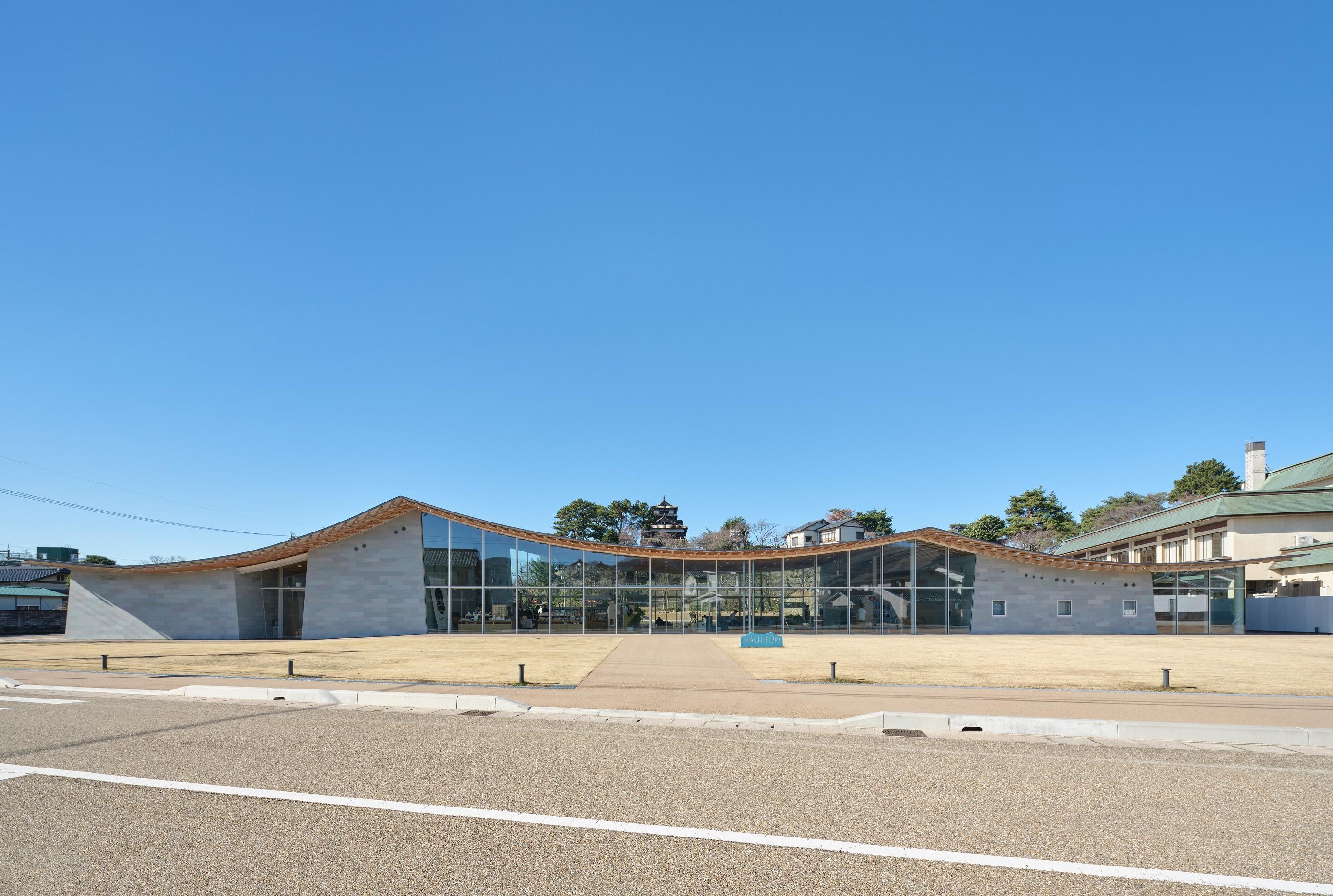 現存12天守の一つである丸岡城天守を望む霞ヶ城公園内の施設を再編成し、一箇所に集約した市民と観光客の交流を生み出す観光情報センターである。丸岡地域全体の新しいゲートとなり、周辺地域への周遊を促すための拠点となる施設をつくる。周辺の視線を遮らない平屋とし、周辺からも天守が望める配置計画とした。室内は大スパンの無柱空間を実現し、室内からの眺望を最大限生かす計画とした。丸岡城天守と豊原寺跡、白山を直線で結ぶ軸線をコンセプトに、越前織をモチーフとしたドレープ状の屋根をくぐり丸岡城へ向かう、地域性を取り込んだ建築を目指した。