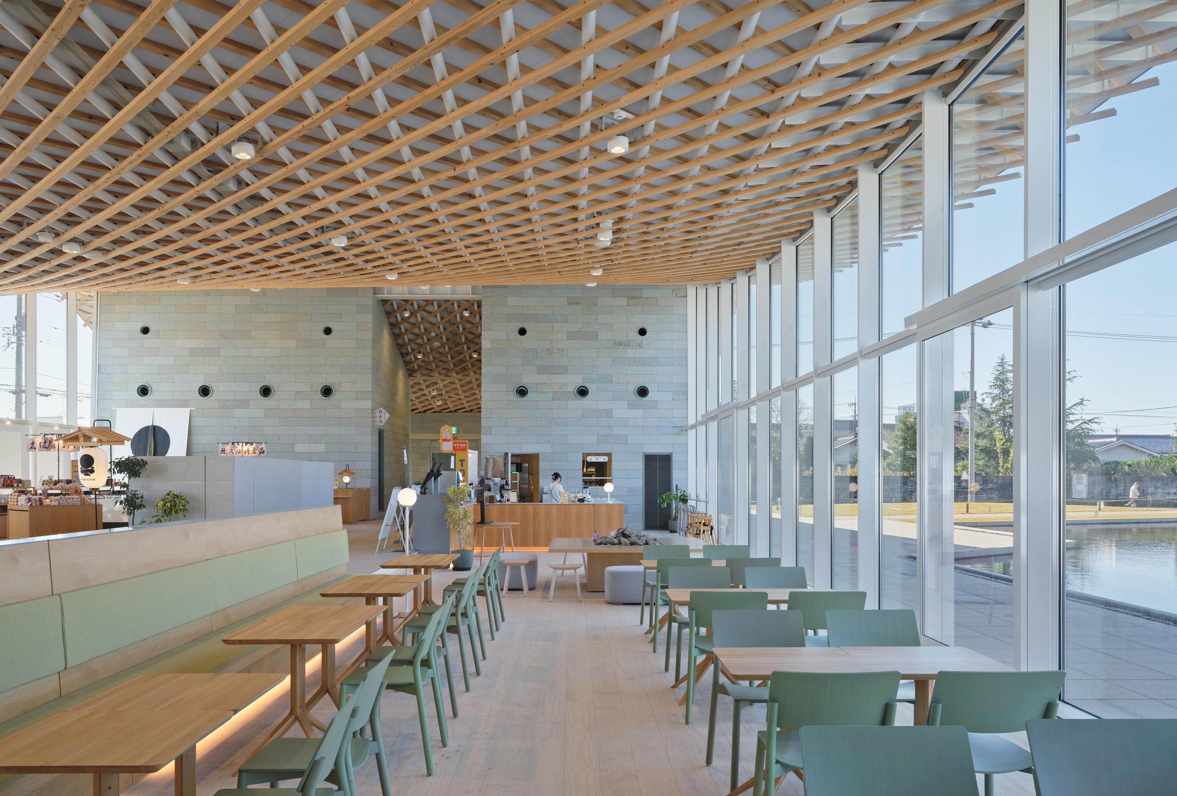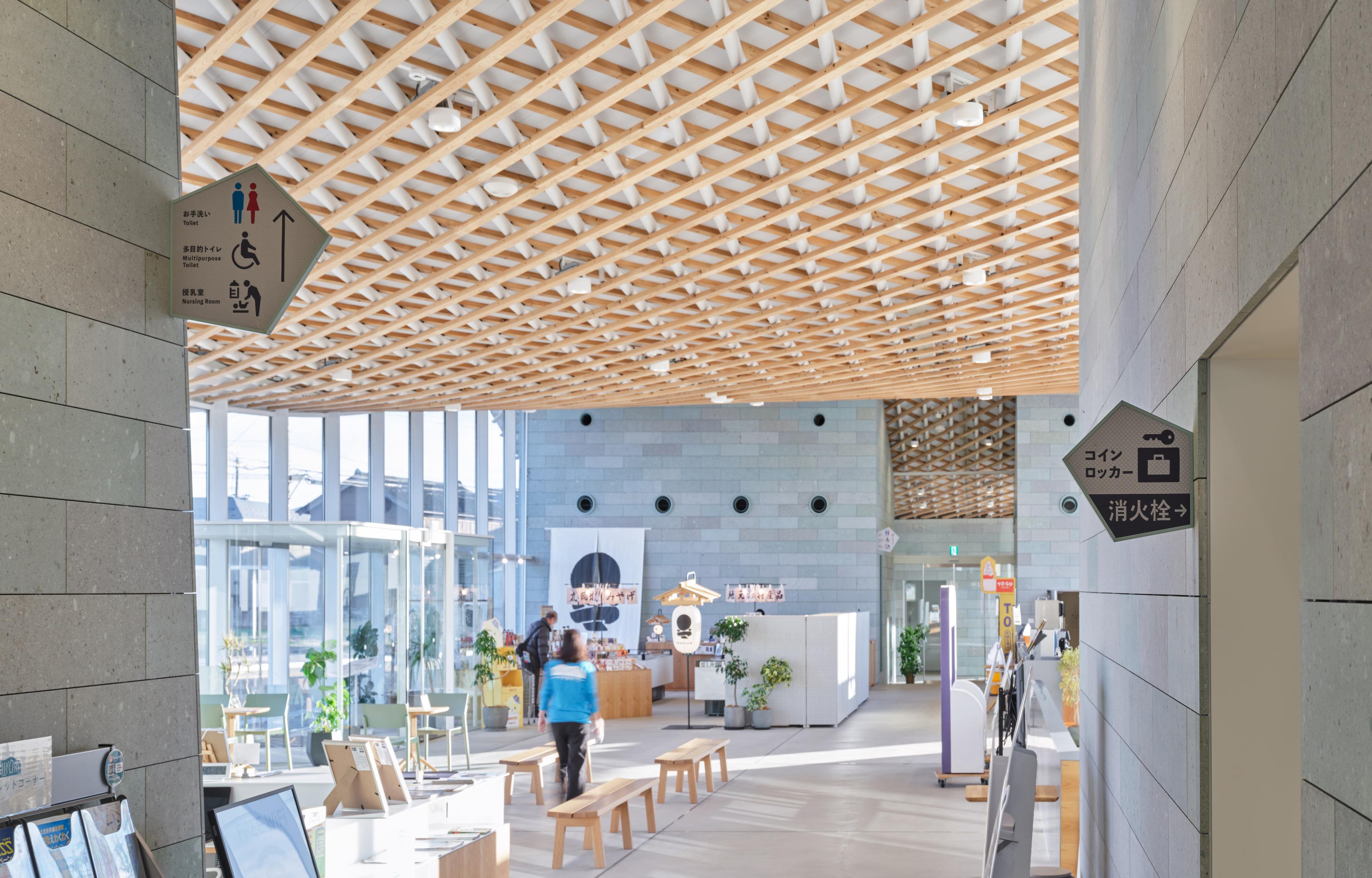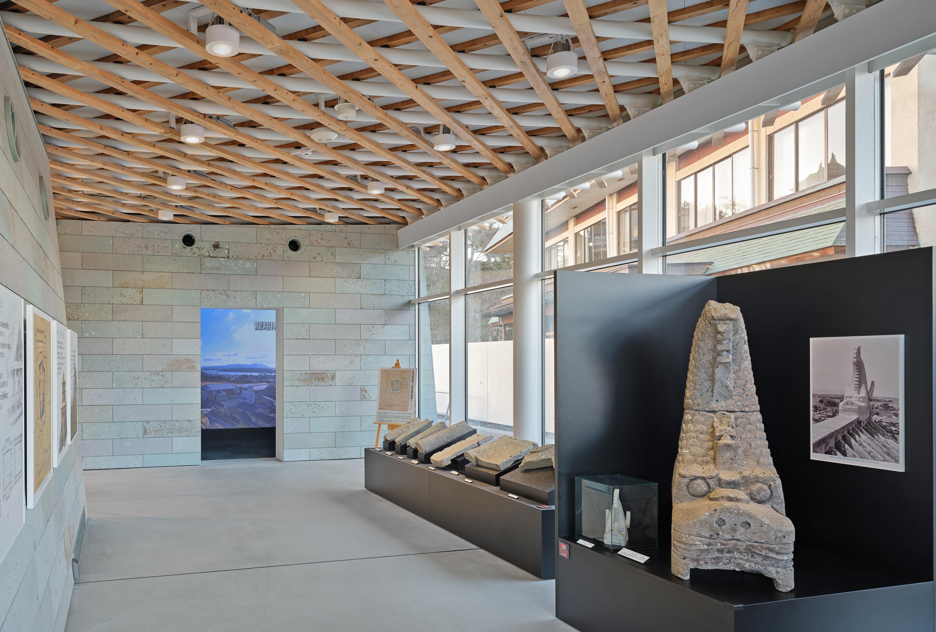 現存12天守の一つである丸岡城天守を望む霞ヶ城公園内の施設を再編成し、一箇所に集約した市民と観光客の交流を生み出す観光情報センターである。丸岡地域全体の新しいゲートとなり、周辺地域への周遊を促すための拠点となる施設をつくる。周辺の視線を遮らない平屋とし、周辺からも天守が望める配置計画とした。室内は大スパンの無柱空間を実現し、室内からの眺望を最大限生かす計画とした。丸岡城天守と豊原寺跡、白山を直線で結ぶ軸線をコンセプトに、越前織をモチーフとしたドレープ状の屋根をくぐり丸岡城へ向かう、地域性を取り込んだ建築を目指した。
