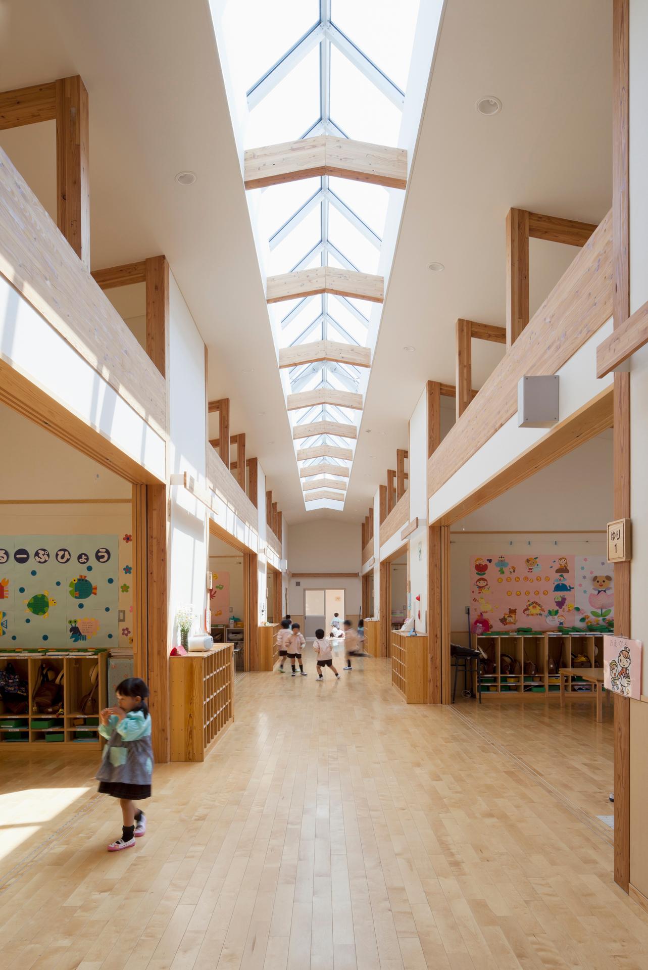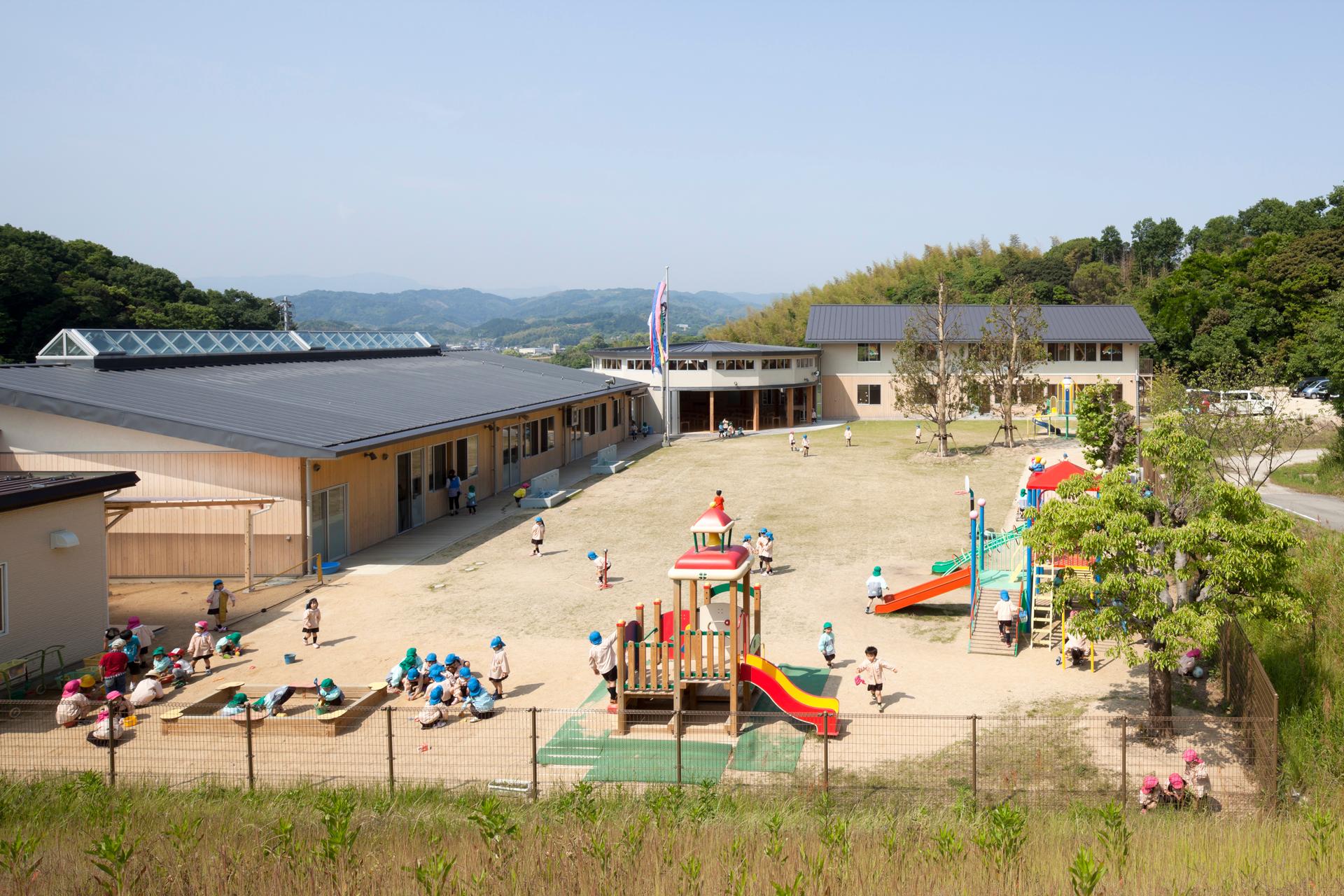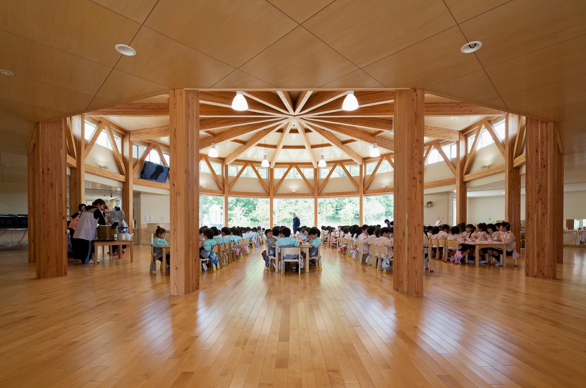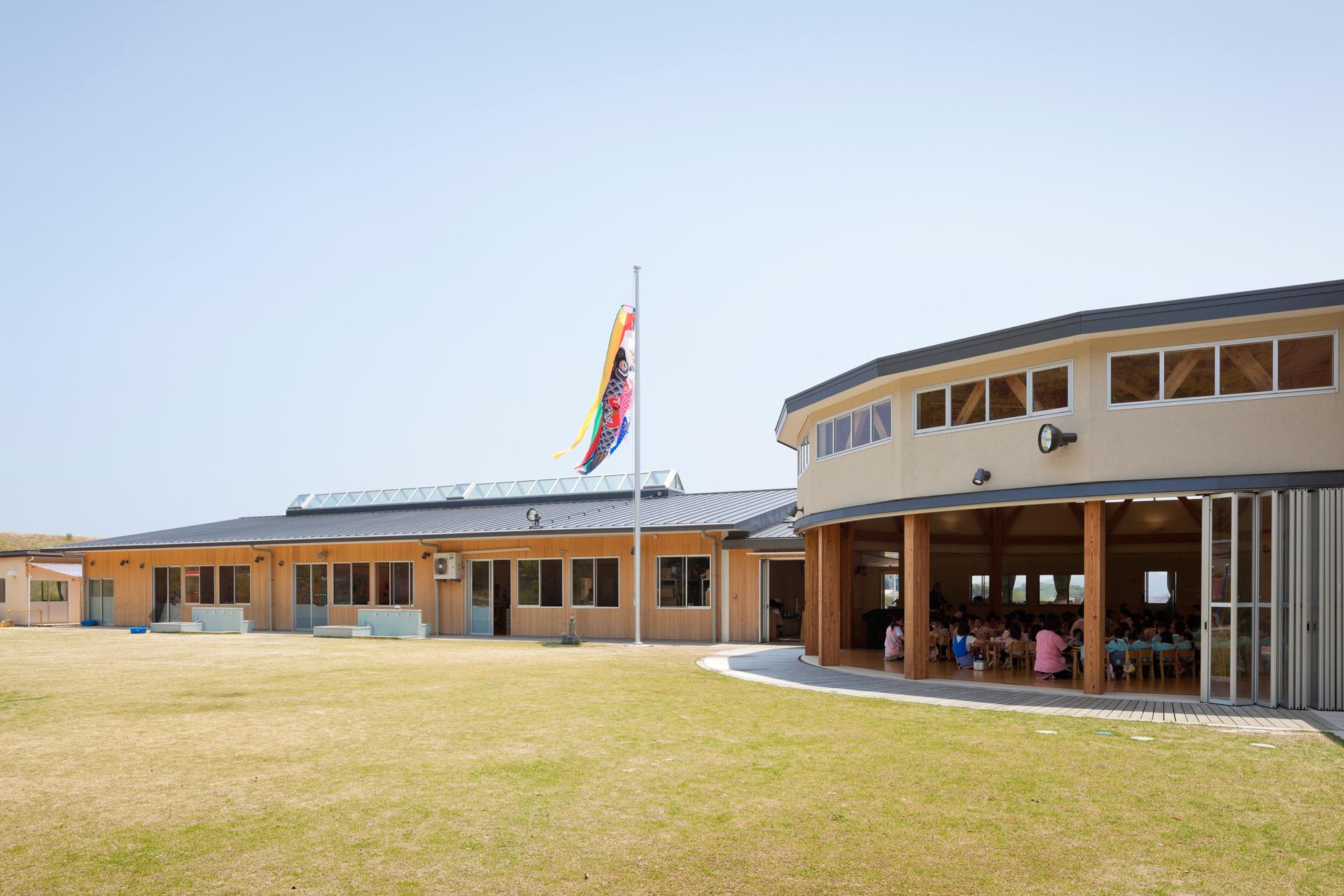 「しまなみの杜認定こども園」は、幼稚園210名、保育所30名の園児を収容する幼保連携型の保育施設。「ようちえんは、畑」という基本理念のもと、食育活動を推進し、メインホールであるランチルームを中心に幼稚園棟と保育所棟を両ウィングに配置した。天井高さ約4.7m、対面方向17mの16角形の無柱空間は、木造大断面の構造となっており、機能的にもデザイン的にも、園を象徴した空間である。健全な子どもの発育・発達を促す施設として、豊かな自然環境と有機質素材にこだわり、光と風、木と土を大切にした温かな園舎が完成した。