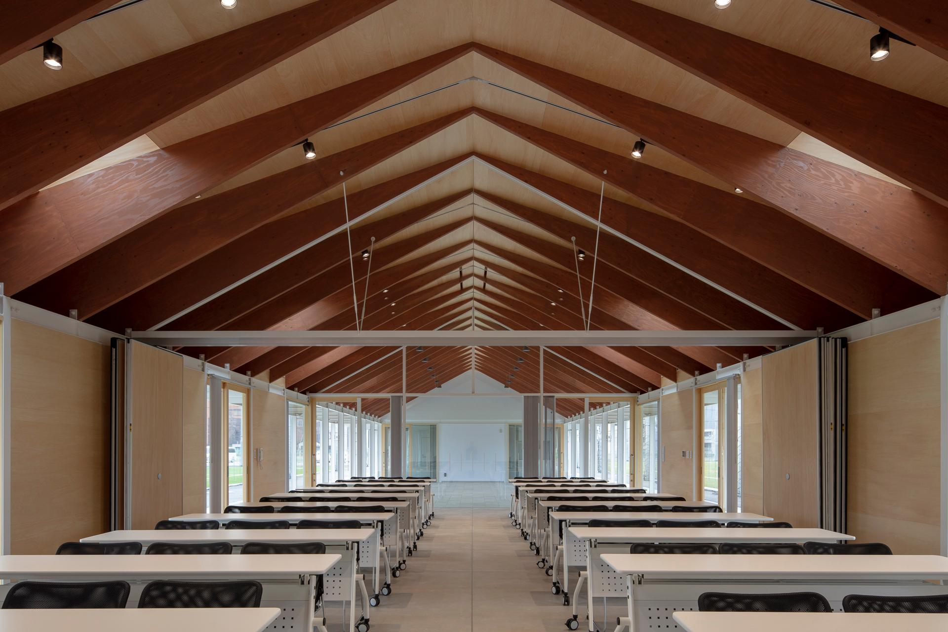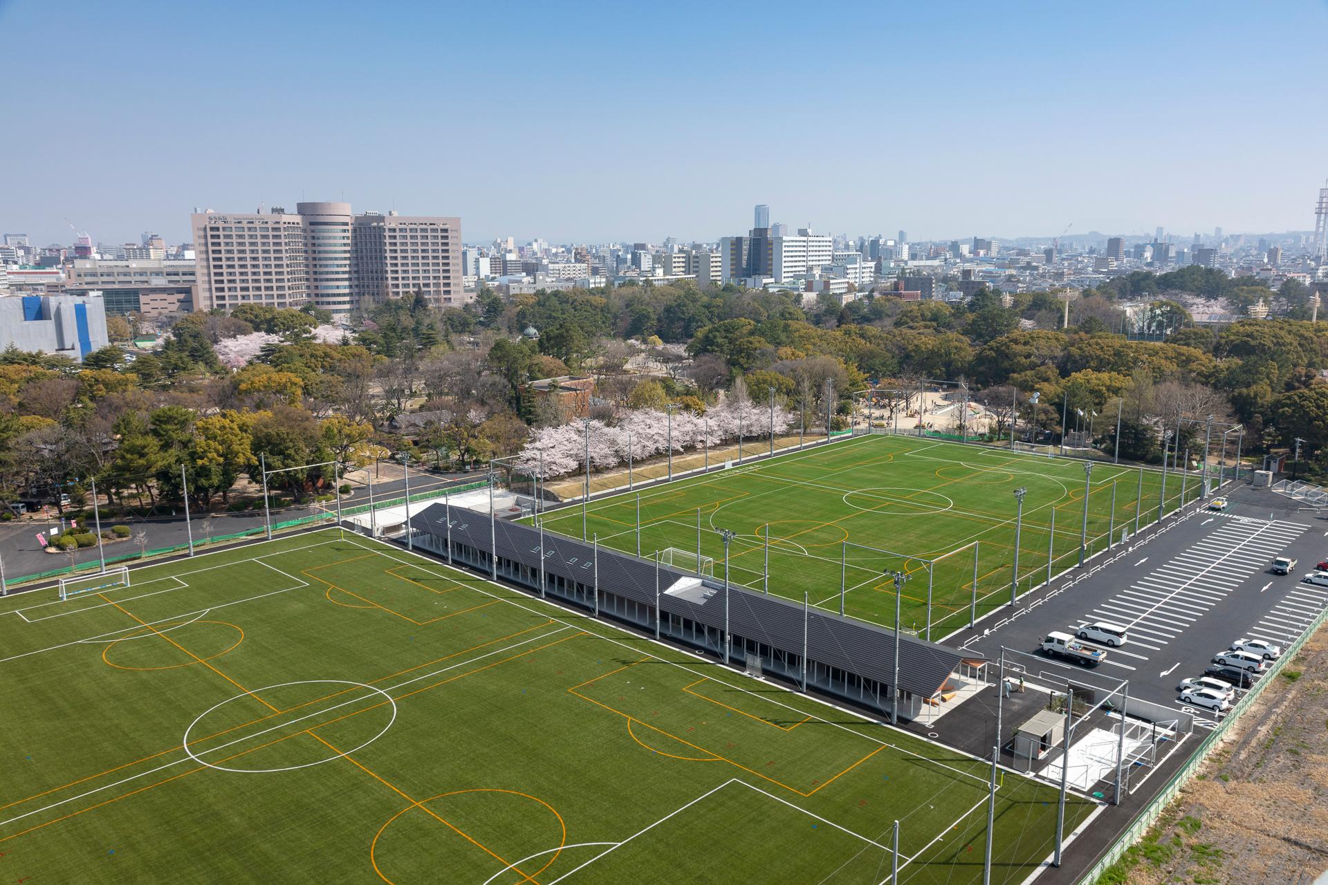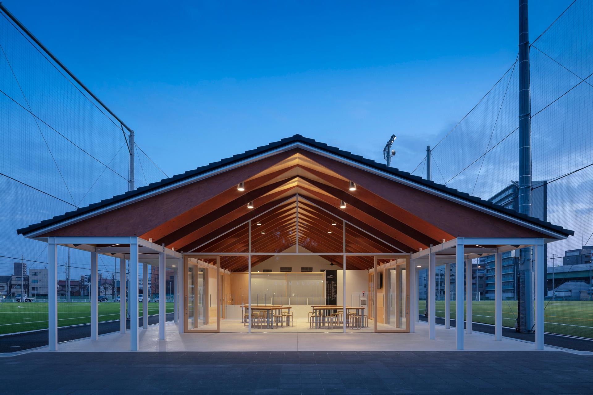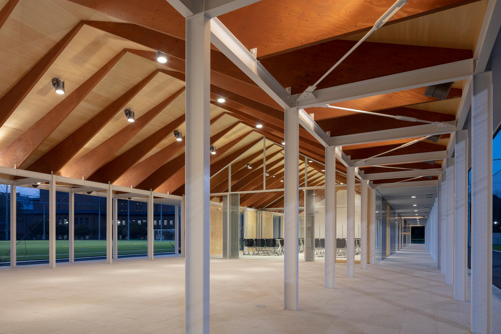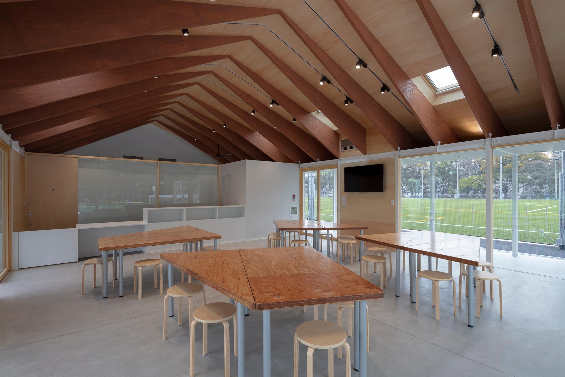 公園内の陸上競技場を、球技を主としたスポーツコミュニティ施設へと転用した計画です。「スポーツを通じた人と人とのコミュニケーションの場」をコンセプトに公園のつながりを重視して計画されました。グラウンド2面に挟まれるように配置した建物は、パーゴラのような鉄骨フレームにLVLの梁をかける構成をとっており、軸組が短辺方向の水平力を負担することで界壁が構造を担わない、将来的な組み換えが容易なシステムを目指しました。グラウンドに細長く面した屋根は回廊であるとともに、グラウンドに必須である日影空間を多量につくる、公園から人を呼び込む東屋のような建築です。