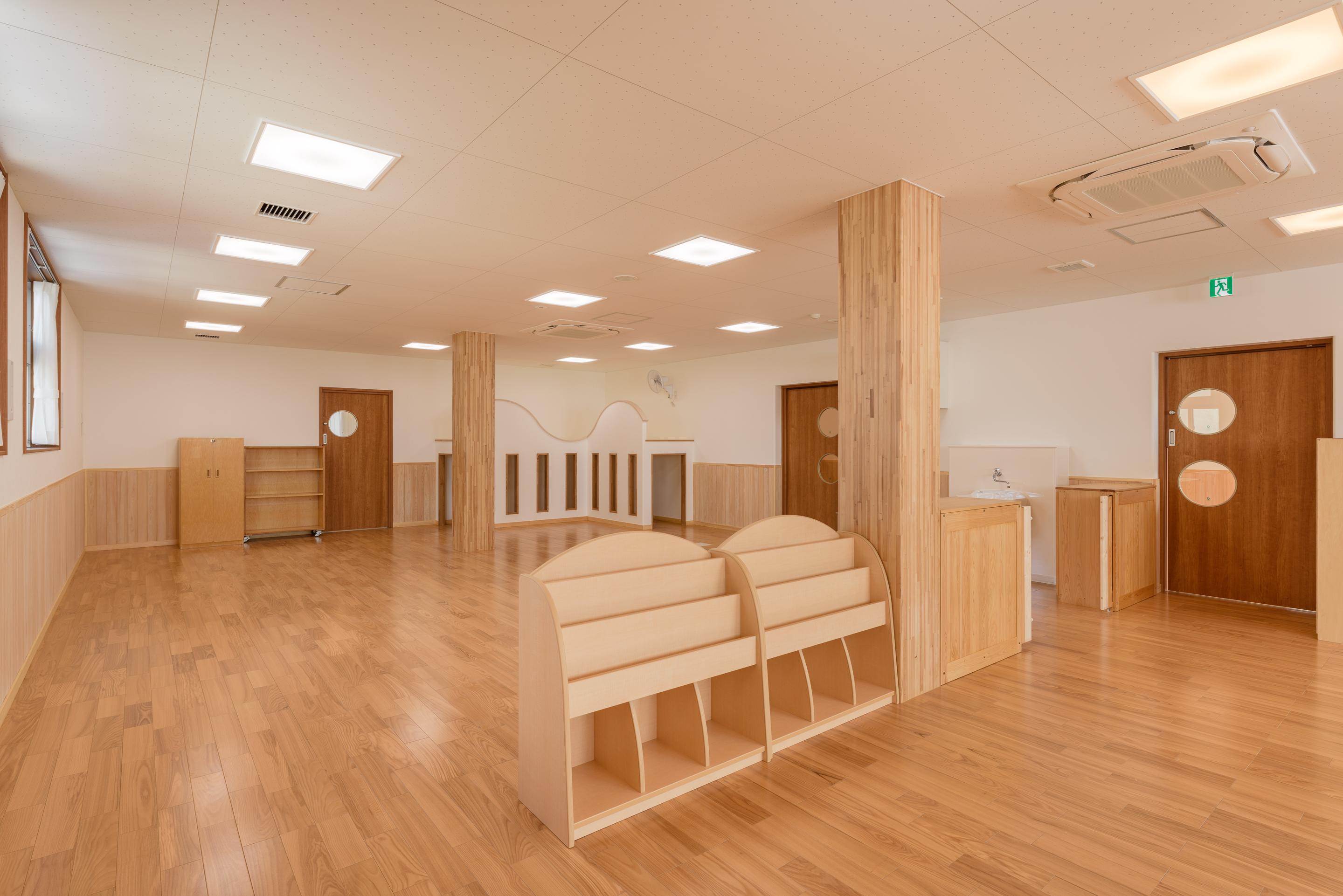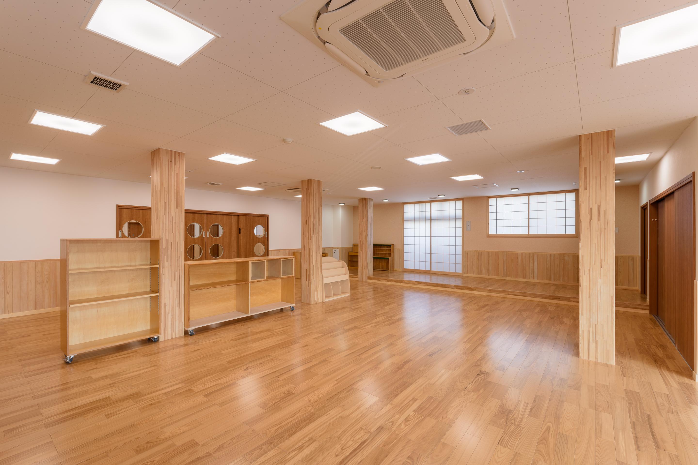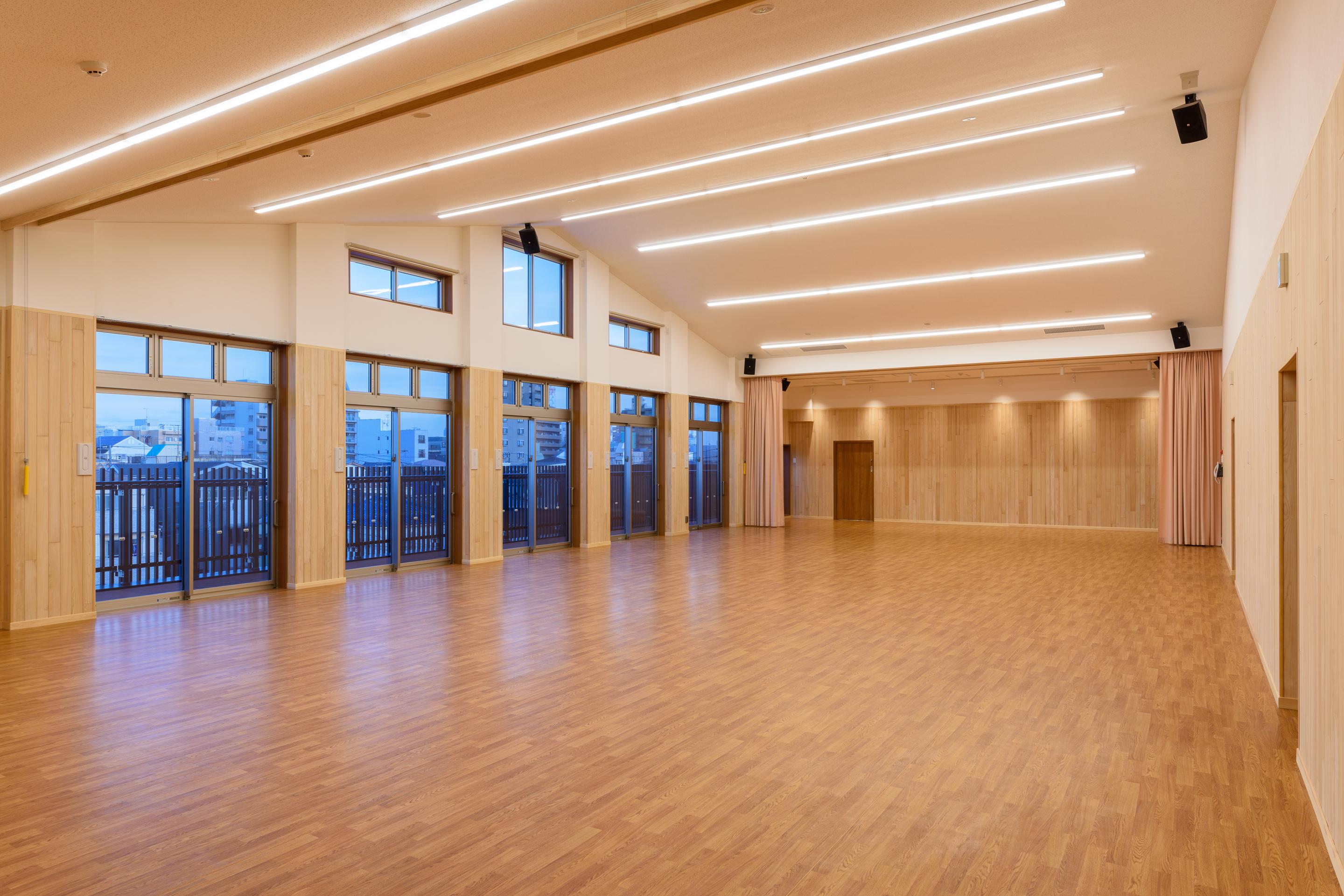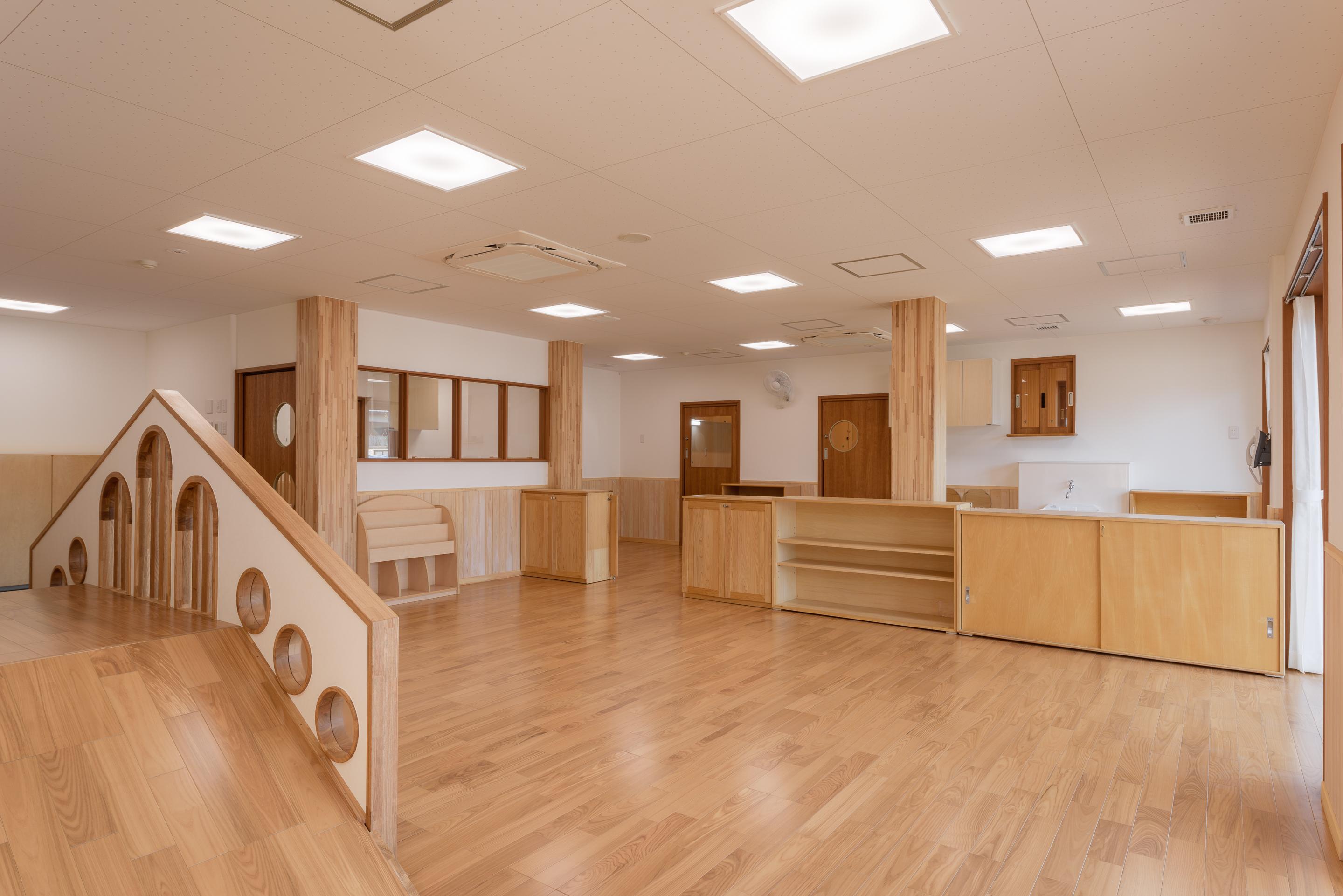 隅田川のほとりの市街地に建つ、3階建ての木造保育園。木質耐火部材“COOL WOOD” を採用した1時間耐火建築物で、耐火部材を使用した木造保育園としては都内最大級の規模となっています。3階にはスパン9mのホールがあり、木の温もりに包まれ、子どもたちが伸び伸びと過ごせる園舎です。