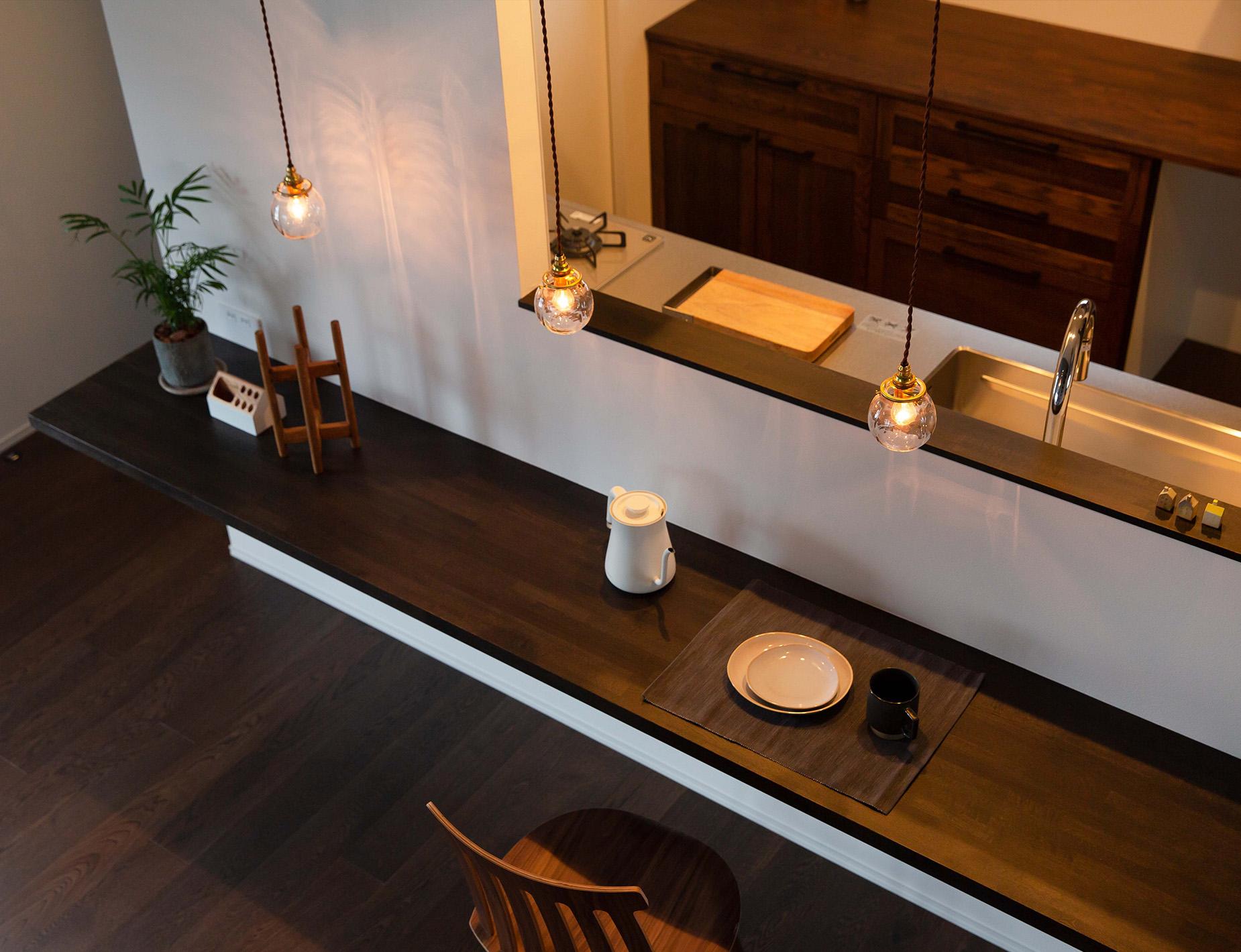 キッチン前のカウンターでは家族や友人との小さな団欒を楽しみ