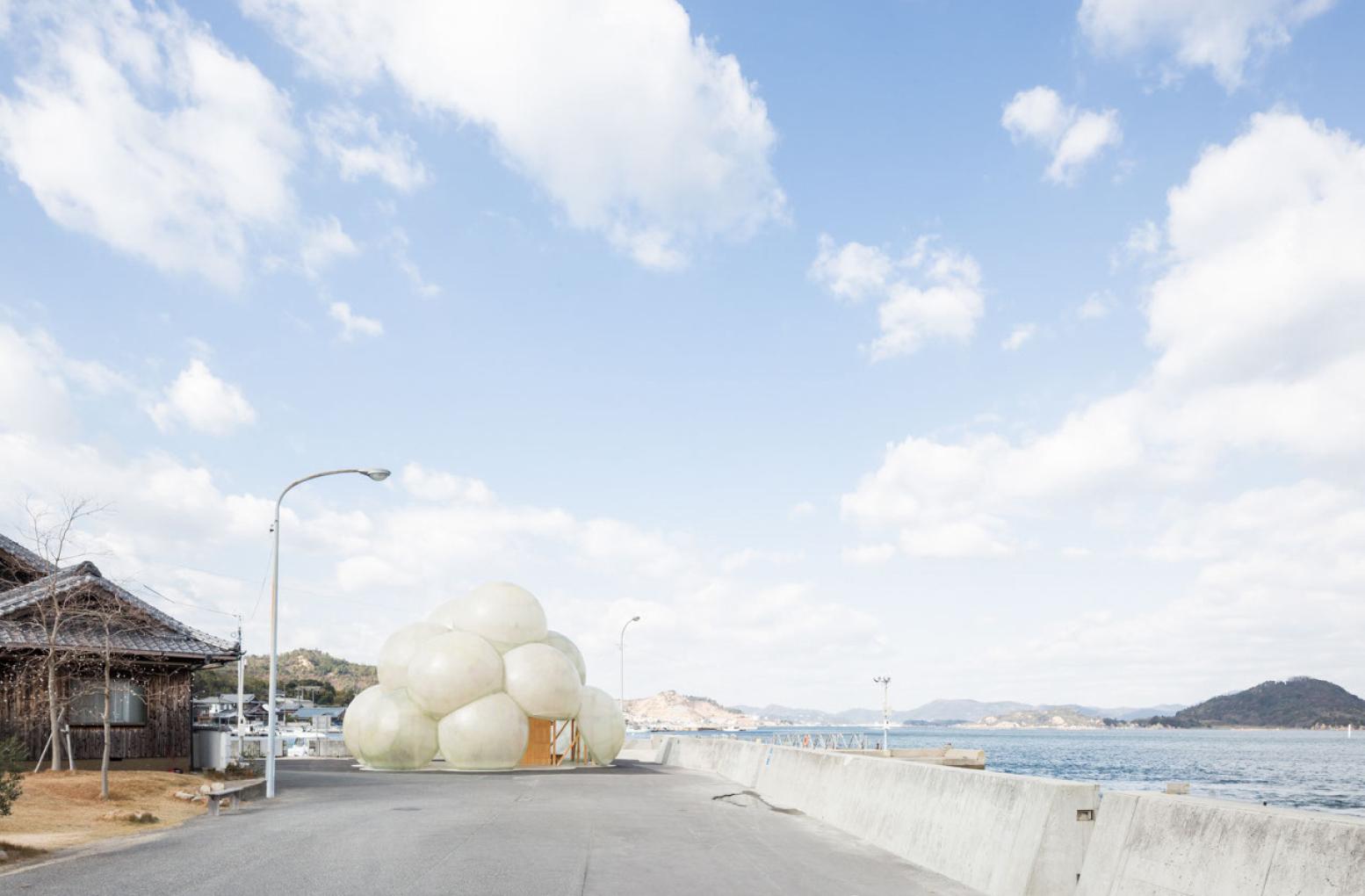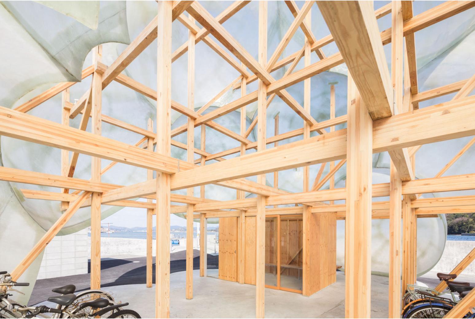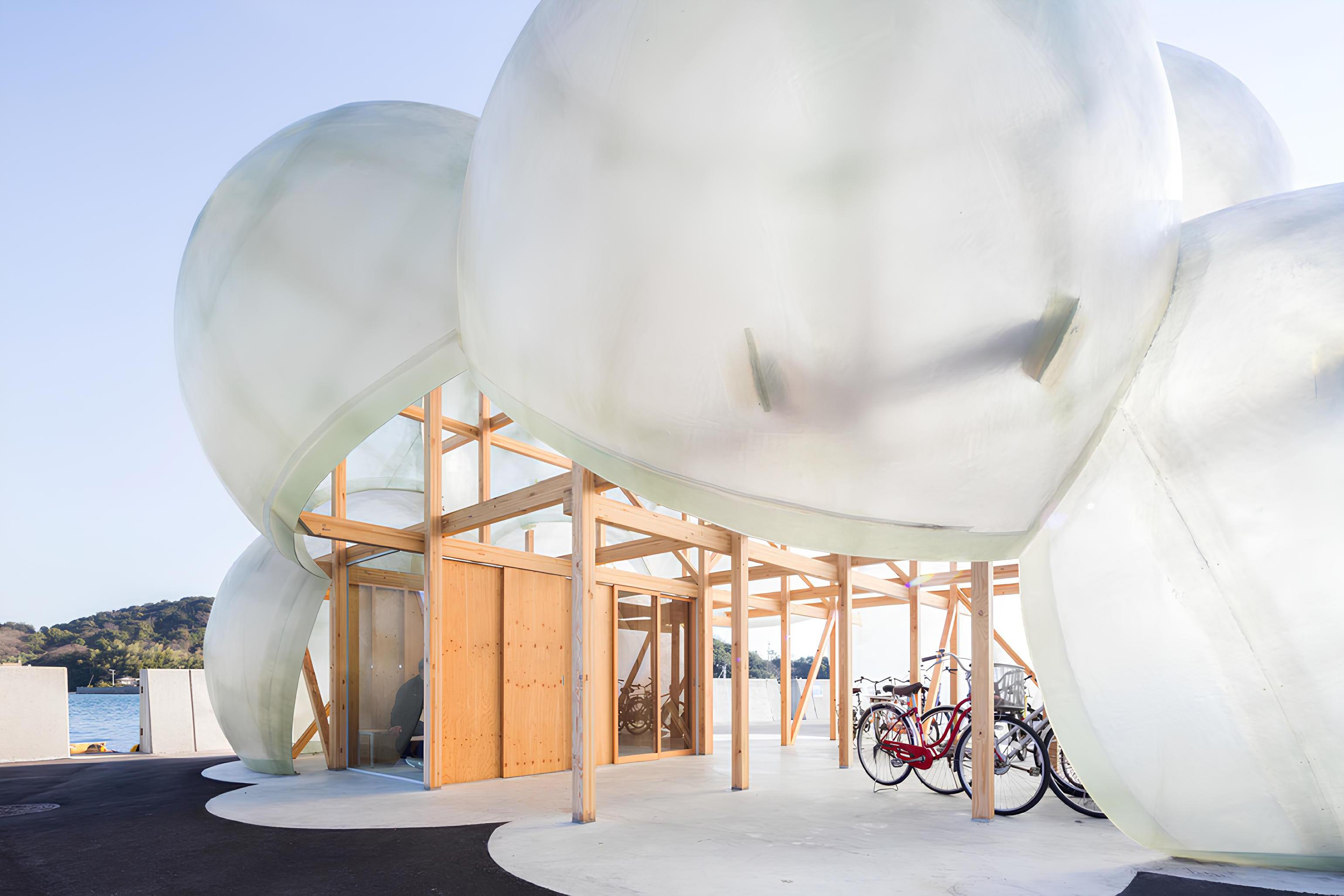 直島の本村にある小さな旅客船のためのターミナルです。既存のターミナルが老朽化したため、新しい待合所、駐輪場、トイレが求められました。本村は多くの観光客が訪れる場所でもあるので、だれでも船のり場がすぐにわかるように、まちのランドマークとなるように考えました。格子状に組んだ木の柱梁の上に、球体のFRPをランダムに積み上げて、入道雲のような立体的な形を作りました。そうすることで、遠くからでも港をすぐに見つけることができます。このターミナルのもとに、島に住んでいる人たちや島を訪れた観光客が一緒に集まり、まちの新しいシンボルとなることを望んでいます。