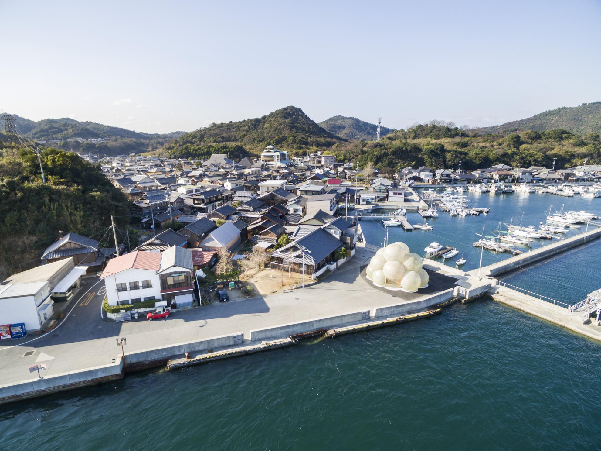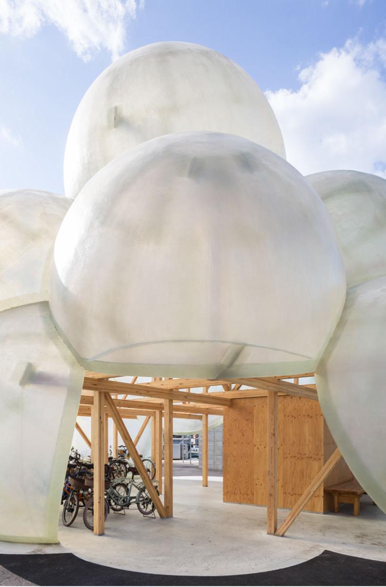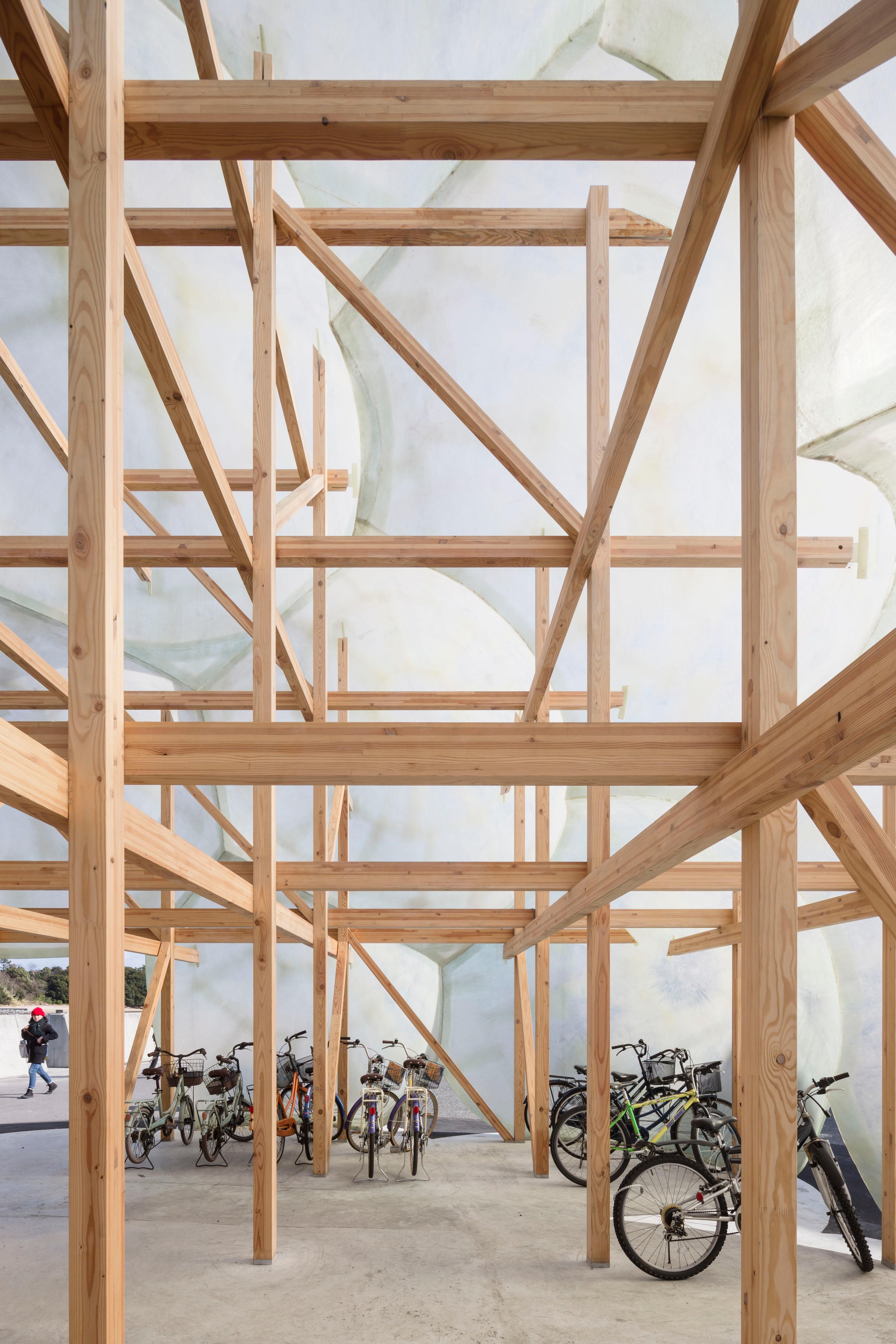 直島の本村にある小さな旅客船のためのターミナルです。既存のターミナルが老朽化したため、新しい待合所、駐輪場、トイレが求められました。本村は多くの観光客が訪れる場所でもあるので、だれでも船のり場がすぐにわかるように、まちのランドマークとなるように考えました。格子状に組んだ木の柱梁の上に、球体のFRPをランダムに積み上げて、入道雲のような立体的な形を作りました。そうすることで、遠くからでも港をすぐに見つけることができます。このターミナルのもとに、島に住んでいる人たちや島を訪れた観光客が一緒に集まり、まちの新しいシンボルとなることを望んでいます。
