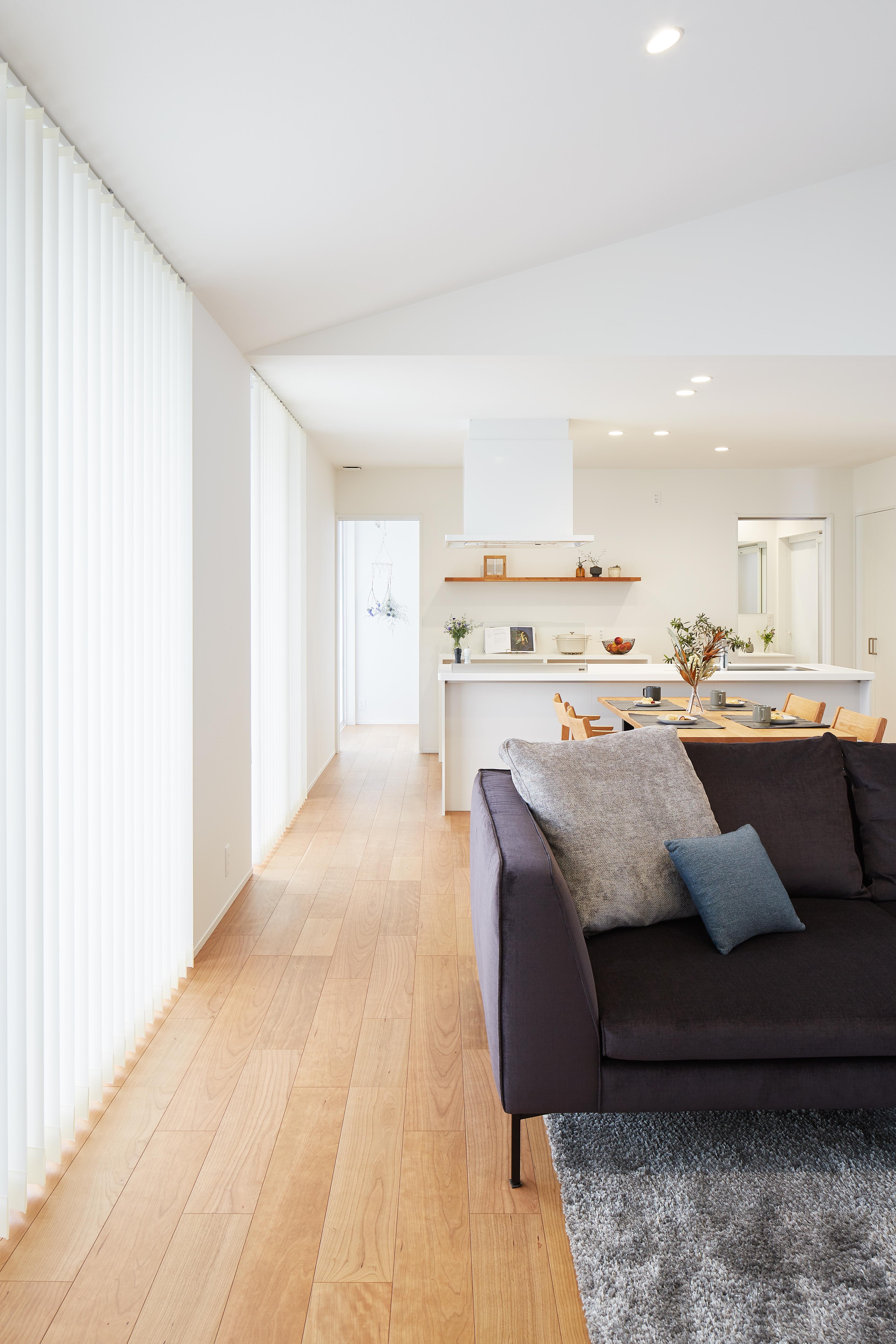 白いしつらえとブラックチェリーの床が印象的なLDK。