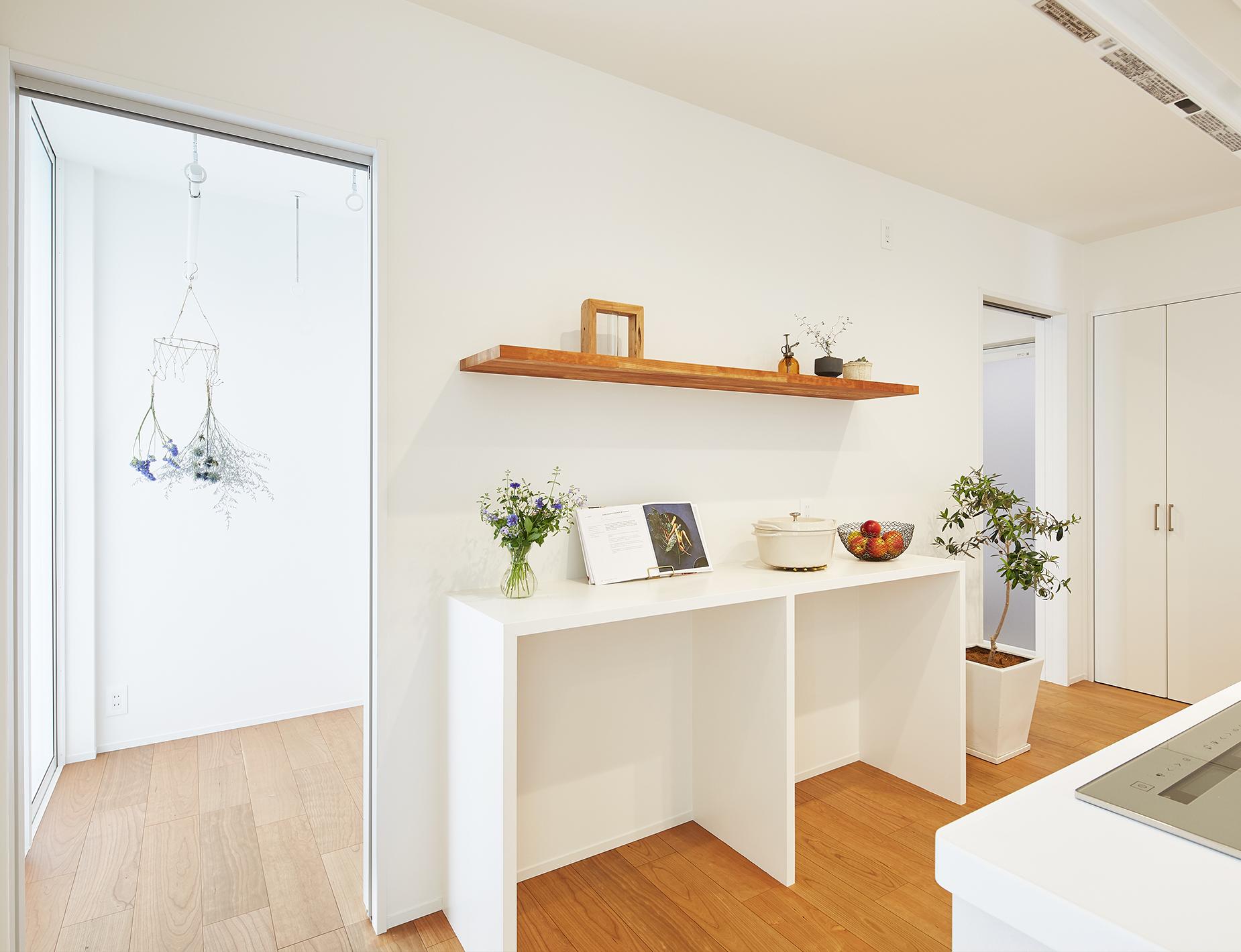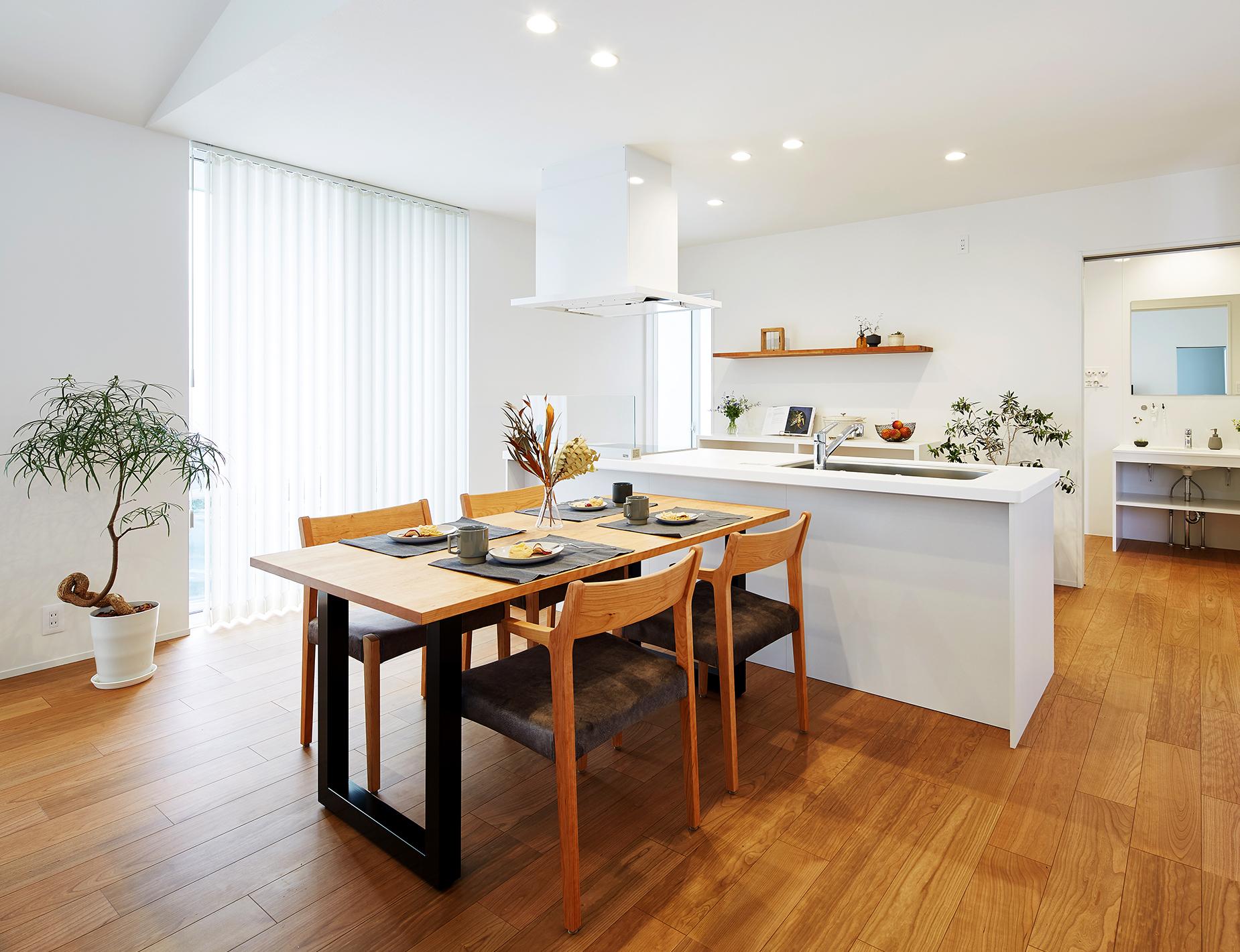 家族と会話しながら作業ができる対面キッチンは、回遊性があり家事のしやすい動線とした。