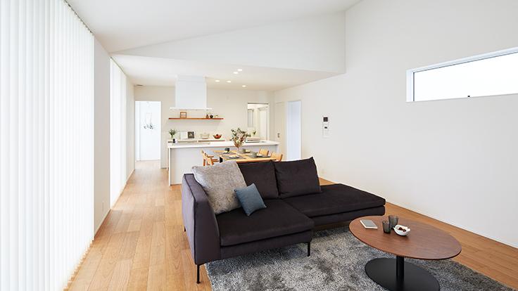 陽の光を勾配天井が拡散して朝の団らんをやわらかく照らす