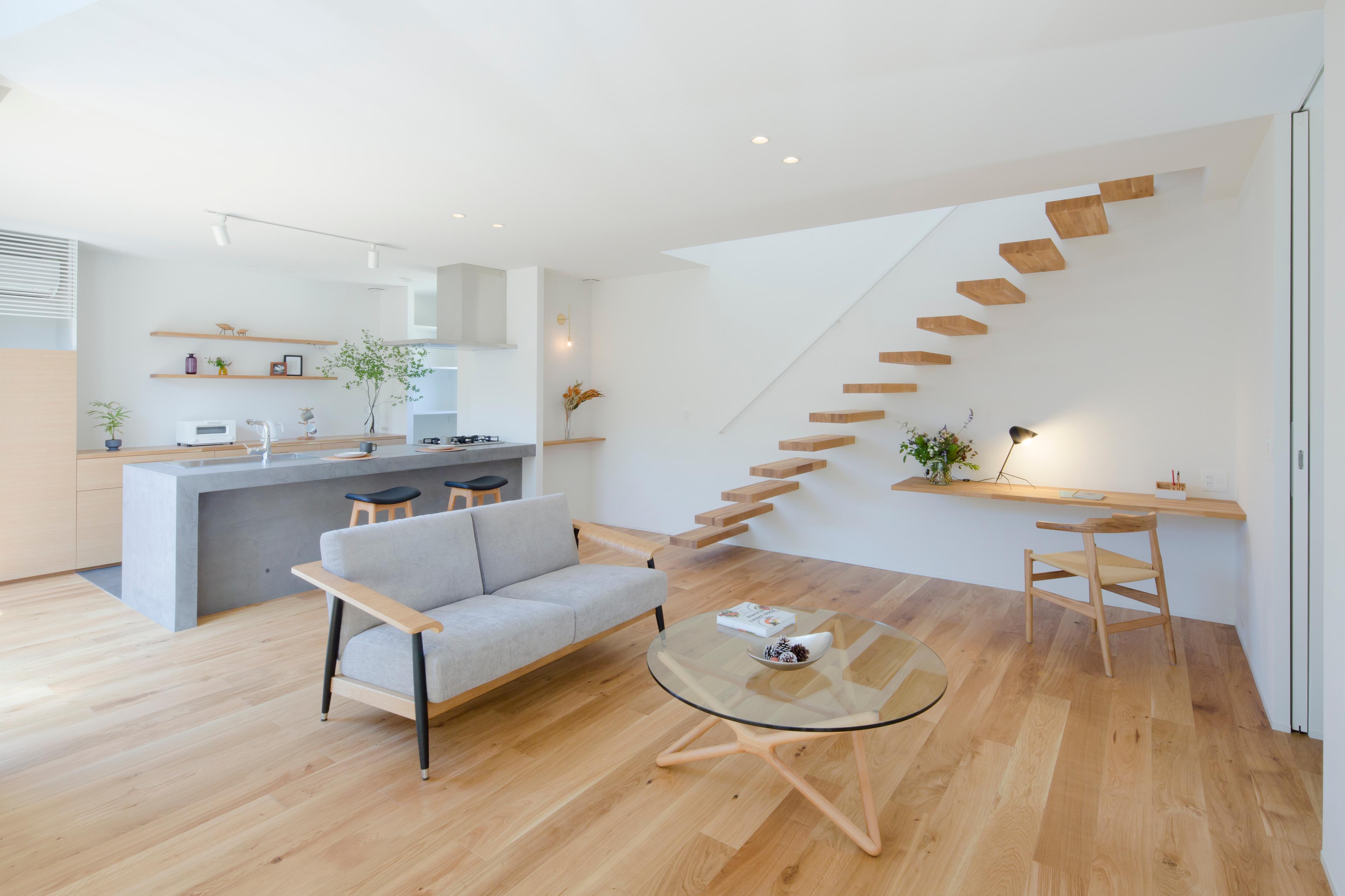 ナチュラルな色合いとオブジェのような階段が生み出す