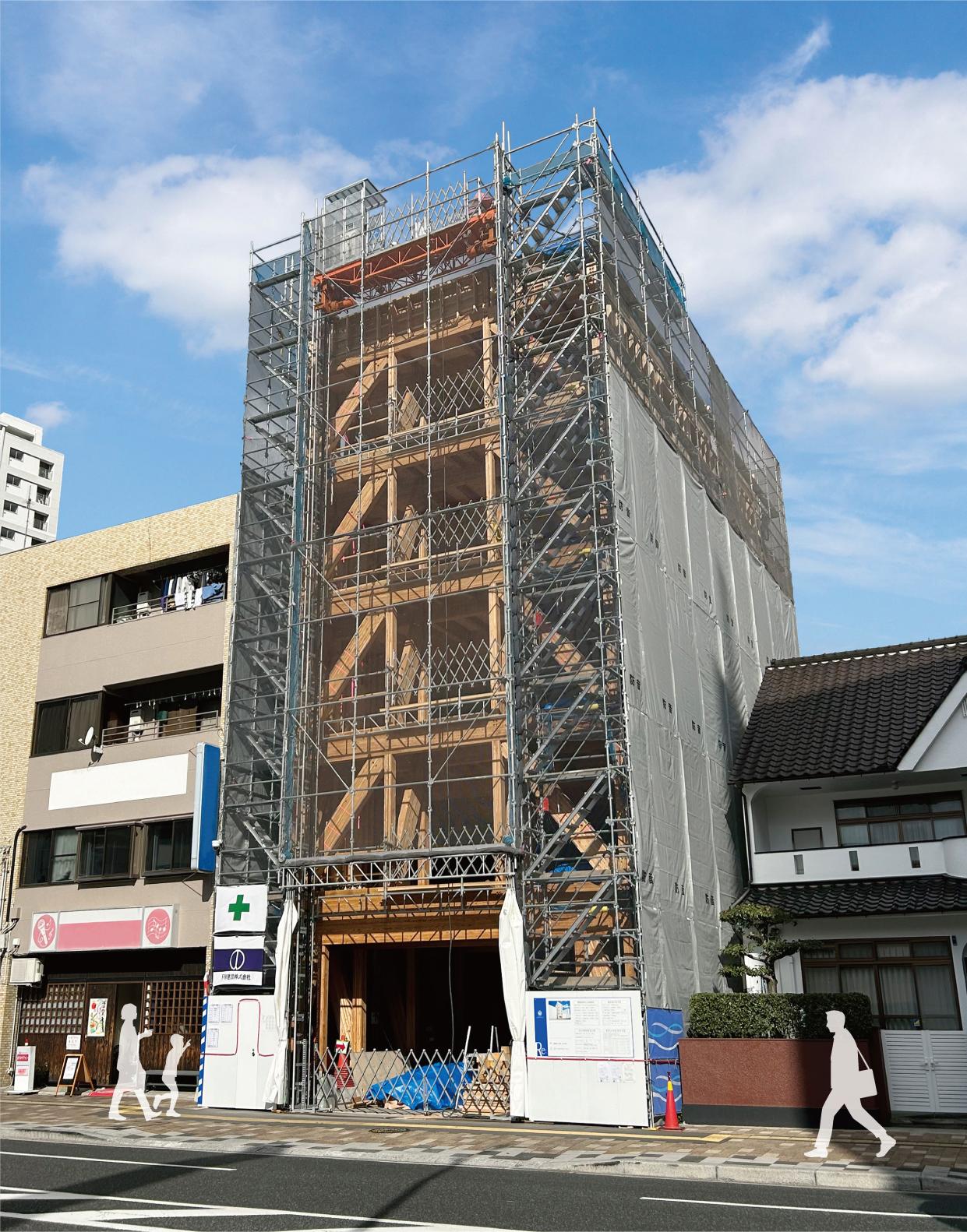 柱・梁・ブレースには木質耐火部材 COOL WOODを採用し、準防火地域における純木造ビルを実現しました。また、木造の躯体で軽量化を図り、杭基礎工事を不要としました。