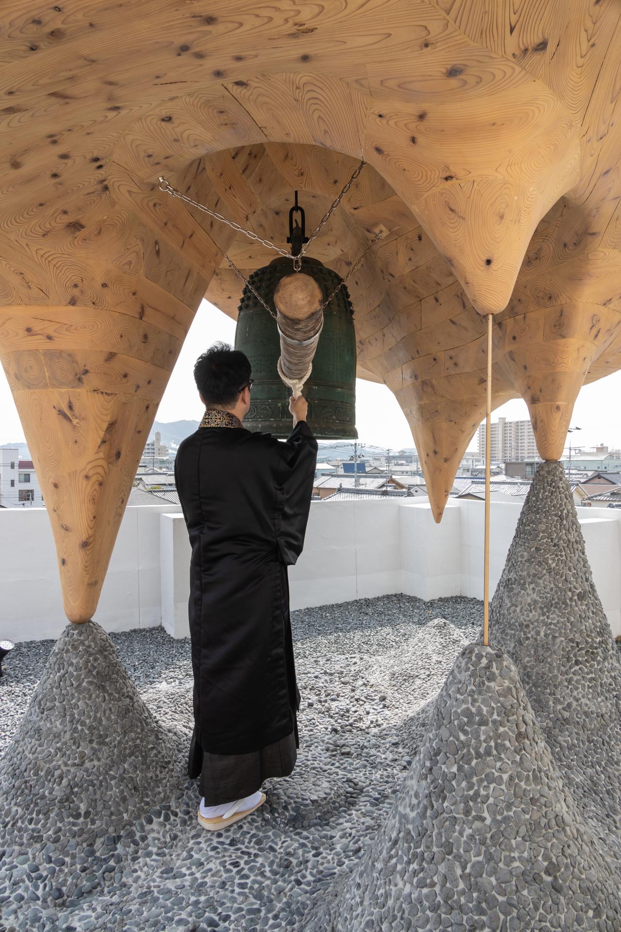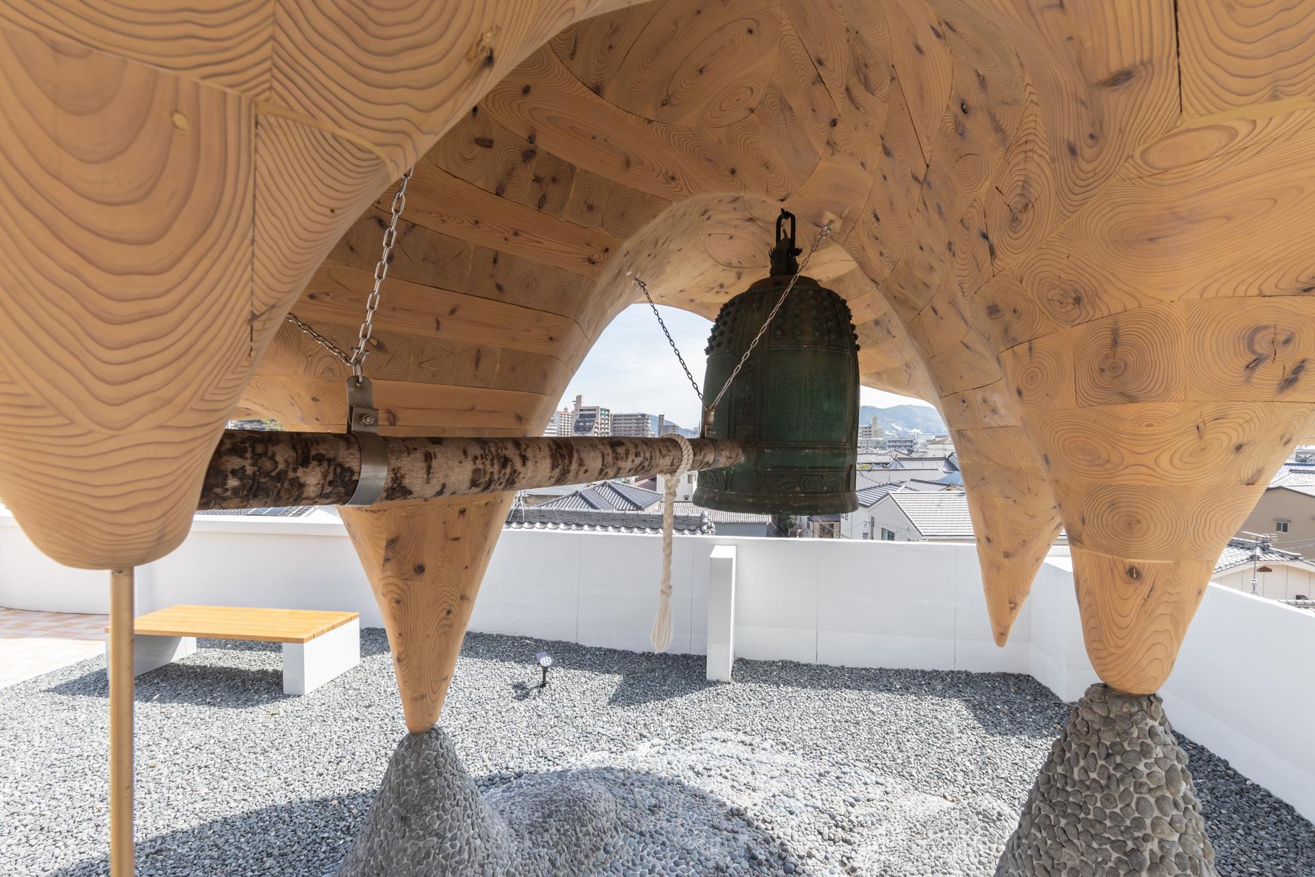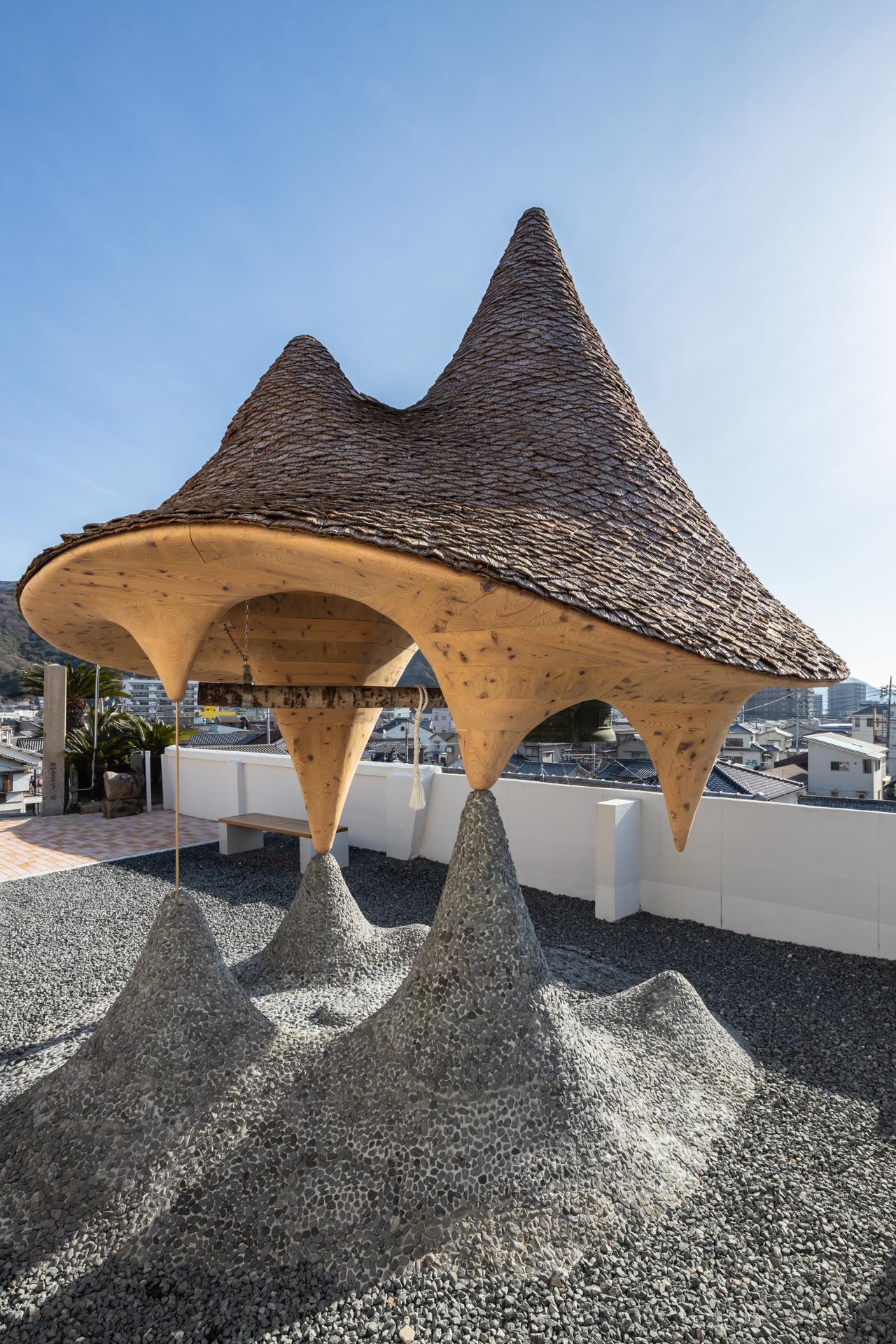 ご住職から「多くの方にお寺に興味を持ってもらえるようなものを」と要望を受け、洞窟や山を想起させる建築をつくることにした。特徴的な屋根は木材をジェンガのように積み重ね、3Dで削り出す技術を使って丁寧につくられた。木の塊が削り出された躯体が綺麗で、仕上げるのが惜しいくらいであった。彫刻と建築の間のような自由な造形が、お寺の新たなシンボルとして皆に愛されることを心から祈っている。