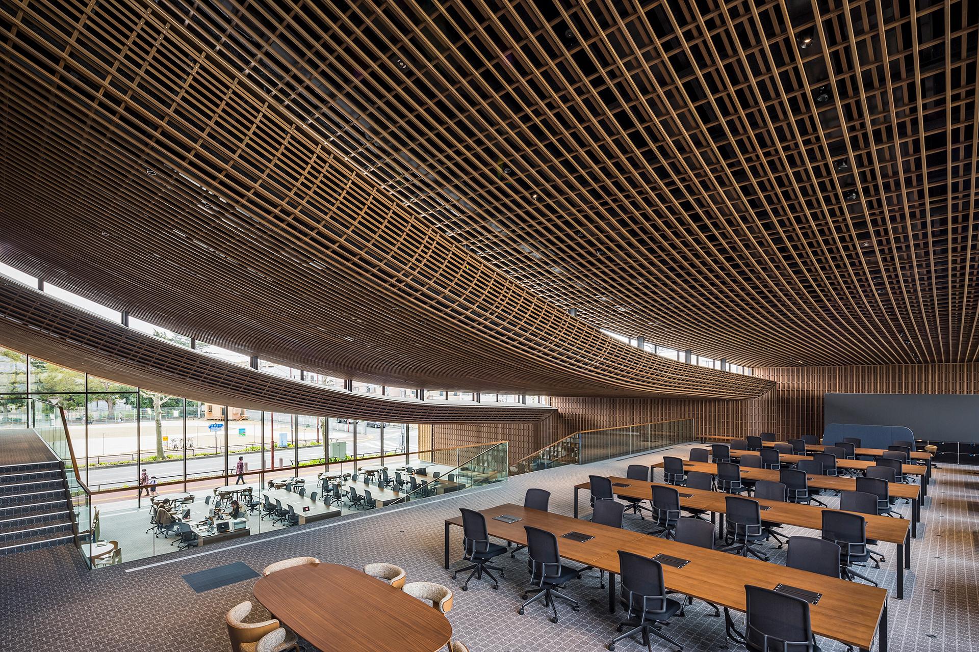 ZOZO本社屋は、スタッフ同士の顔が見える吊り屋根の無柱空間が特徴である。街路と一体化した大開口とはね出しの大庇は、ストリートから生まれるトレンドを観察する習慣を促している。2~8mに変化する天井高とスキップフロアによって、フリーアドレスの執務空間にパブリックとパーソナルな空間がグラデーション状に生まれている。30×30mmの木材をR=39mの曲率で曲げ、柔らかに編み込んだ繊維質の屋根と壁は、大きな布のようにたっぷりと垂れ、人びとをやわらかに包みこむ。ZOZOらしい「着心地のよい服のような建築」である。