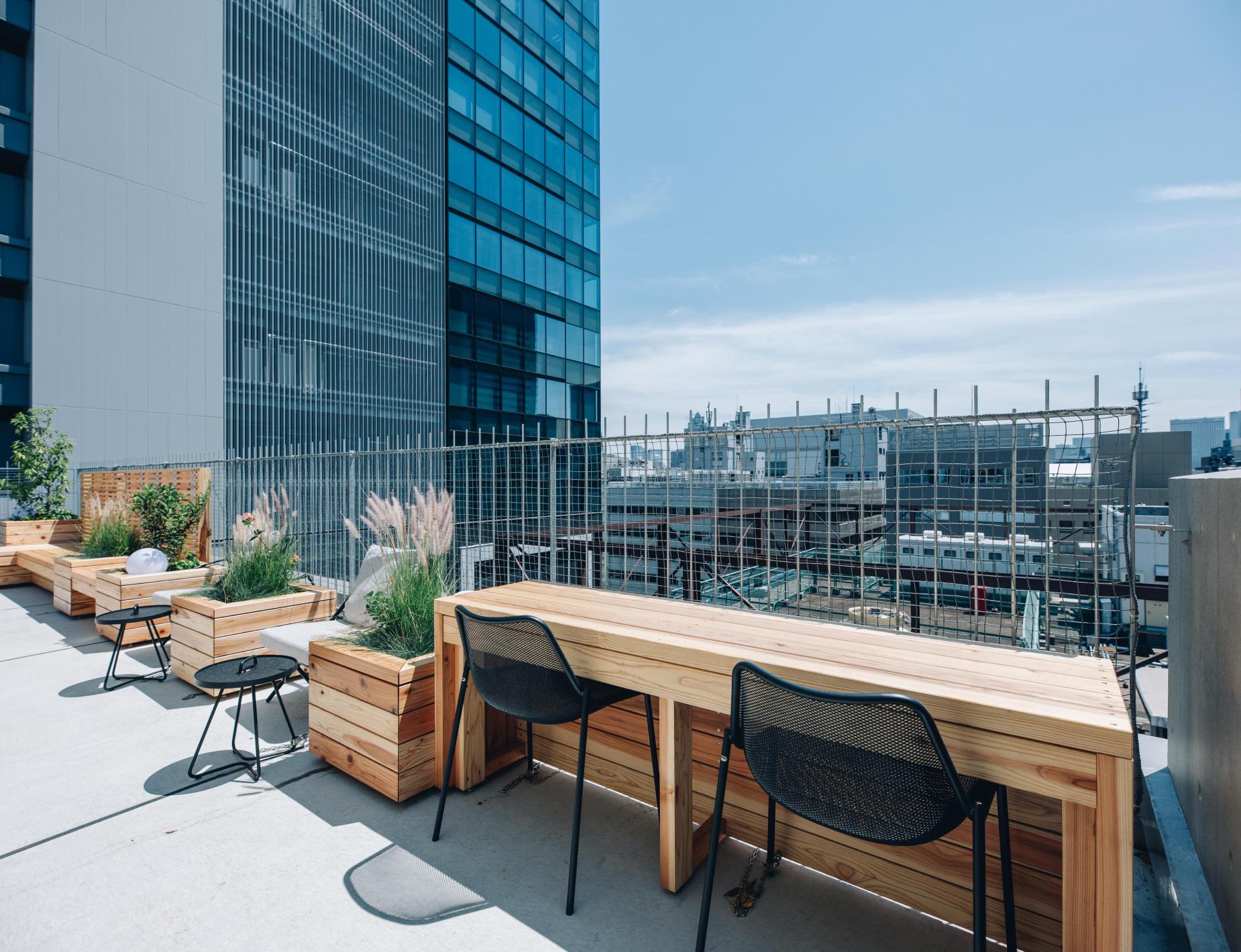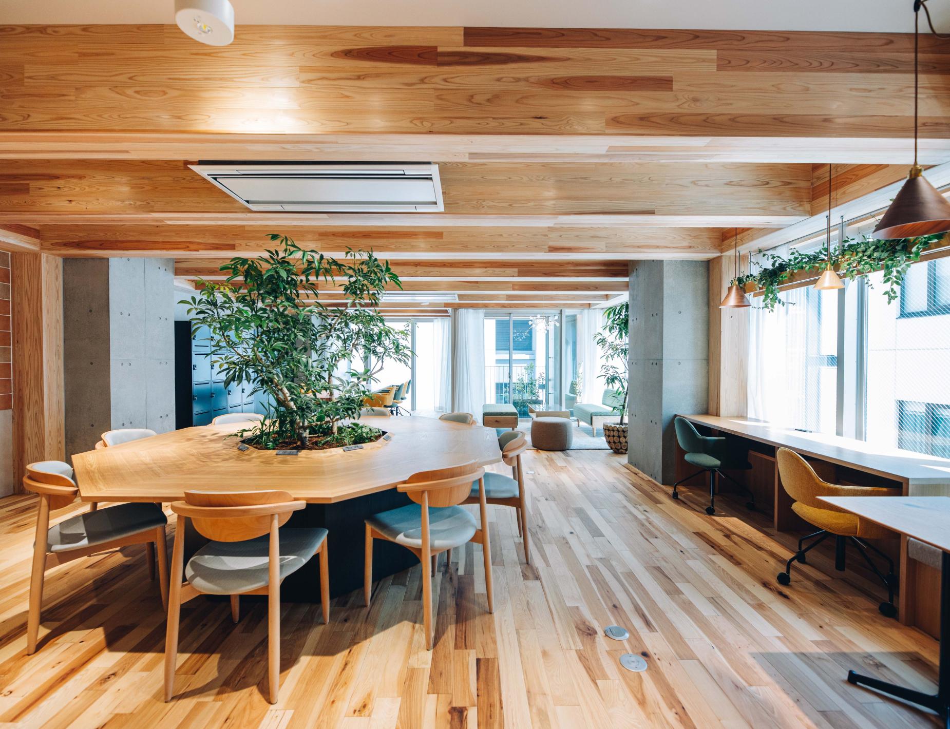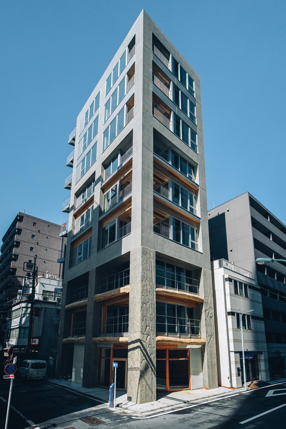 日本橋兜町に建つ、10階建てのオフィス兼店舗である。構造性能を担保する3層飛ばしの鉄骨鉄筋コンクリートメガストラクチャーの中に木造を入れ込むことで建物全体を軽量化し、地震力や基礎等への負担を軽減できる。また木造部は増改築も容易で将来的なプラン変更も実施しやすく、多様性を兼ねた合理的な構造になっている。エントランス部分を含む1階から3階部分の梁には、秋田県産の栗の木を丸太のまま使用。無機質なイメージの強い都心の金融街に、自然を感じられる温かみのある空間を生み出した。