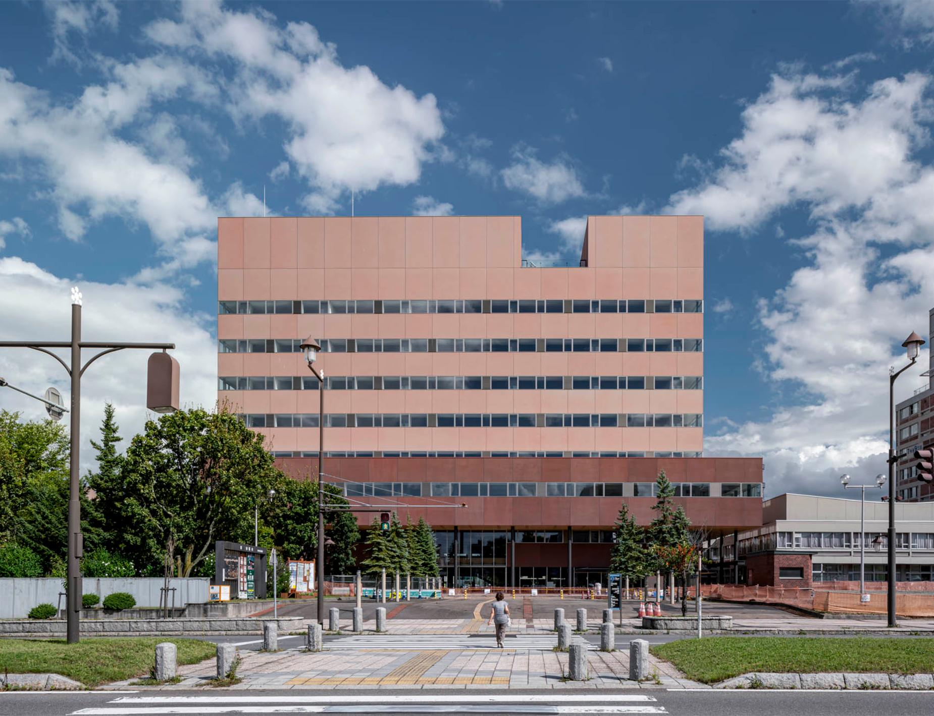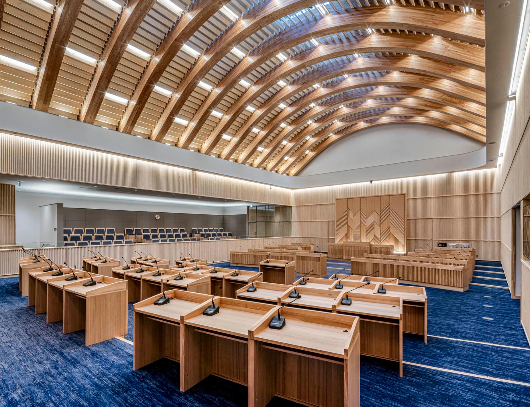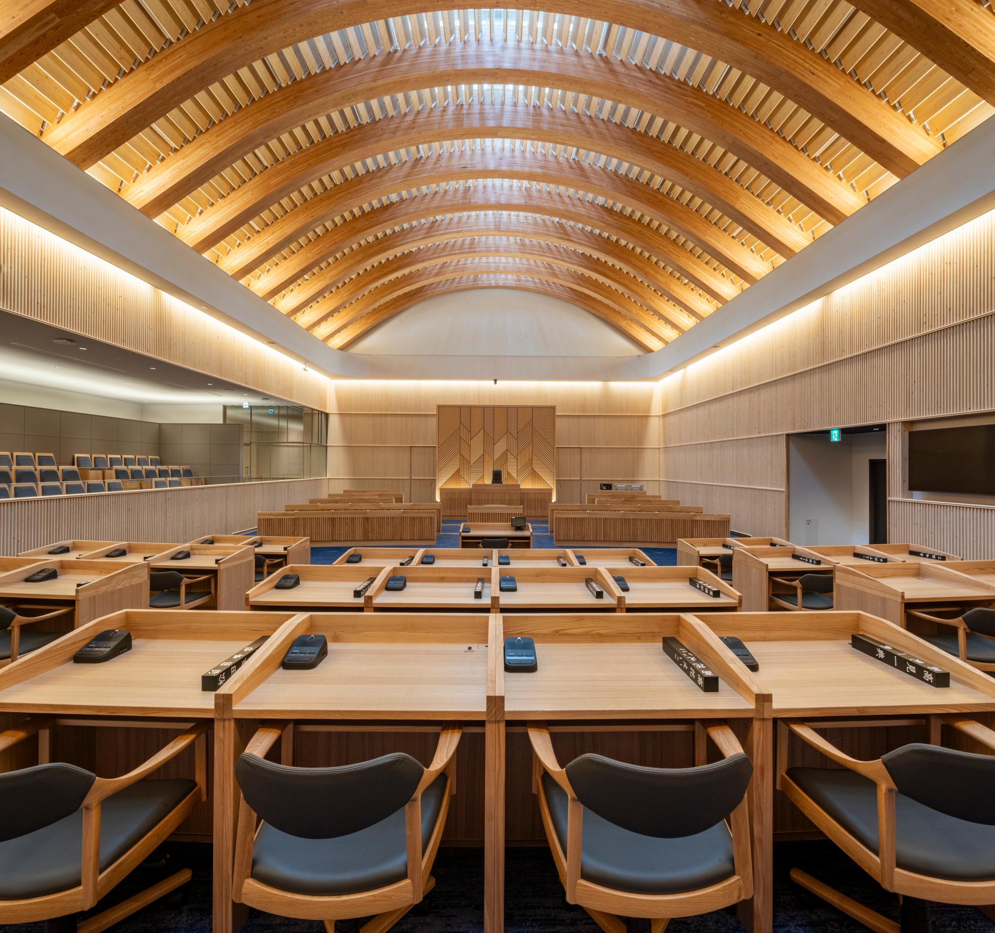 北海道旭川市の総合庁舎です。市庁舎としての利便性はもとより、市民の日常使いや観光客の訪問も考慮し、最上階には大雪山から十勝岳連峰まで展望できるラウンジや議場を計画しました。議場のアーチ梁はカラマツ、ルーバーや壁はトドマツ、家具にはタモと、旭川市産材を全面的に採用しています。山の稜線のような木造アーチとルーバーを通して自然光が降り注ぐ空間では、雲の流れや積雪などによる変化を体感することができます。自然環境に身を置いたような開放的な雰囲気とすることで、開かれた議会運営の場となることを願っています。