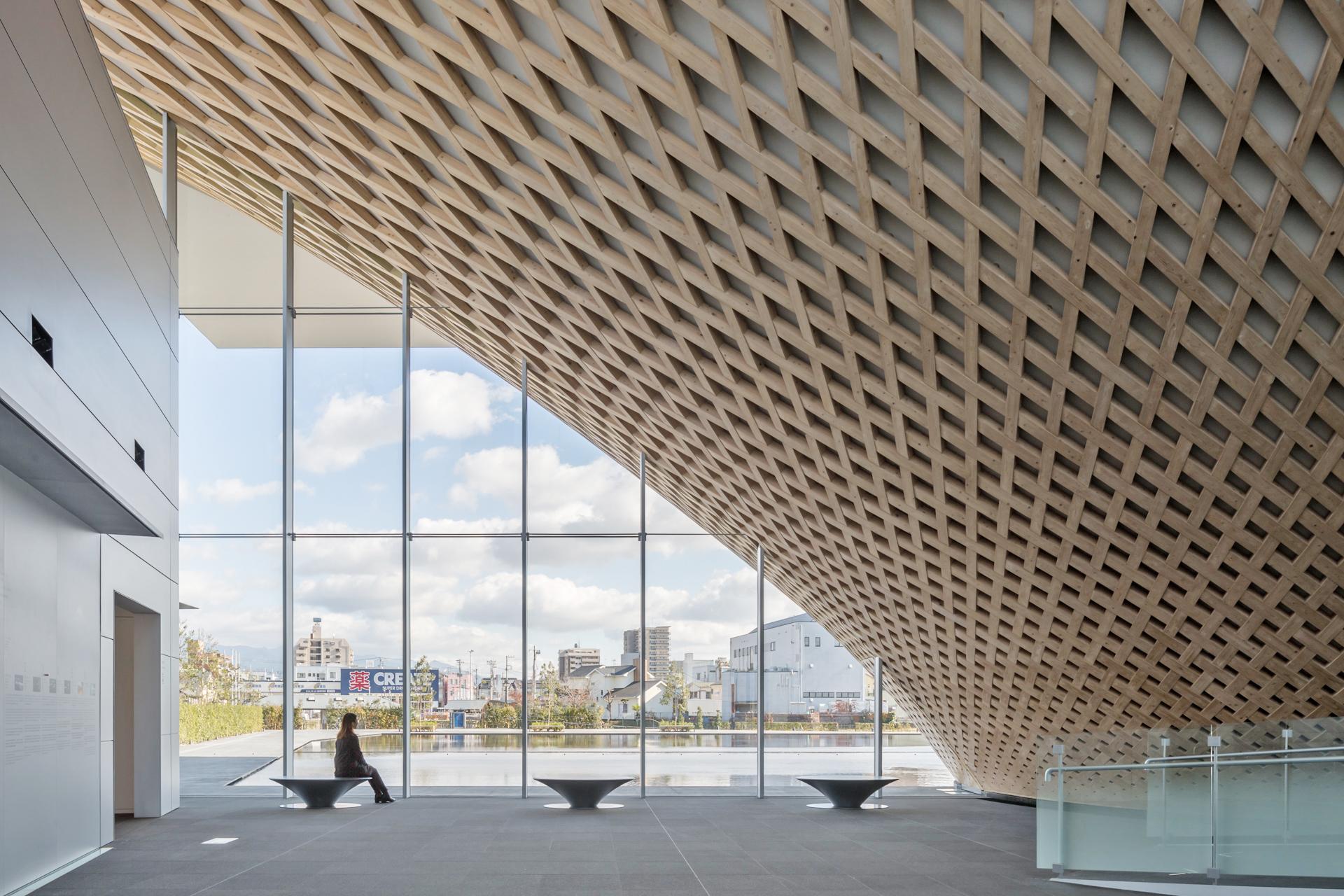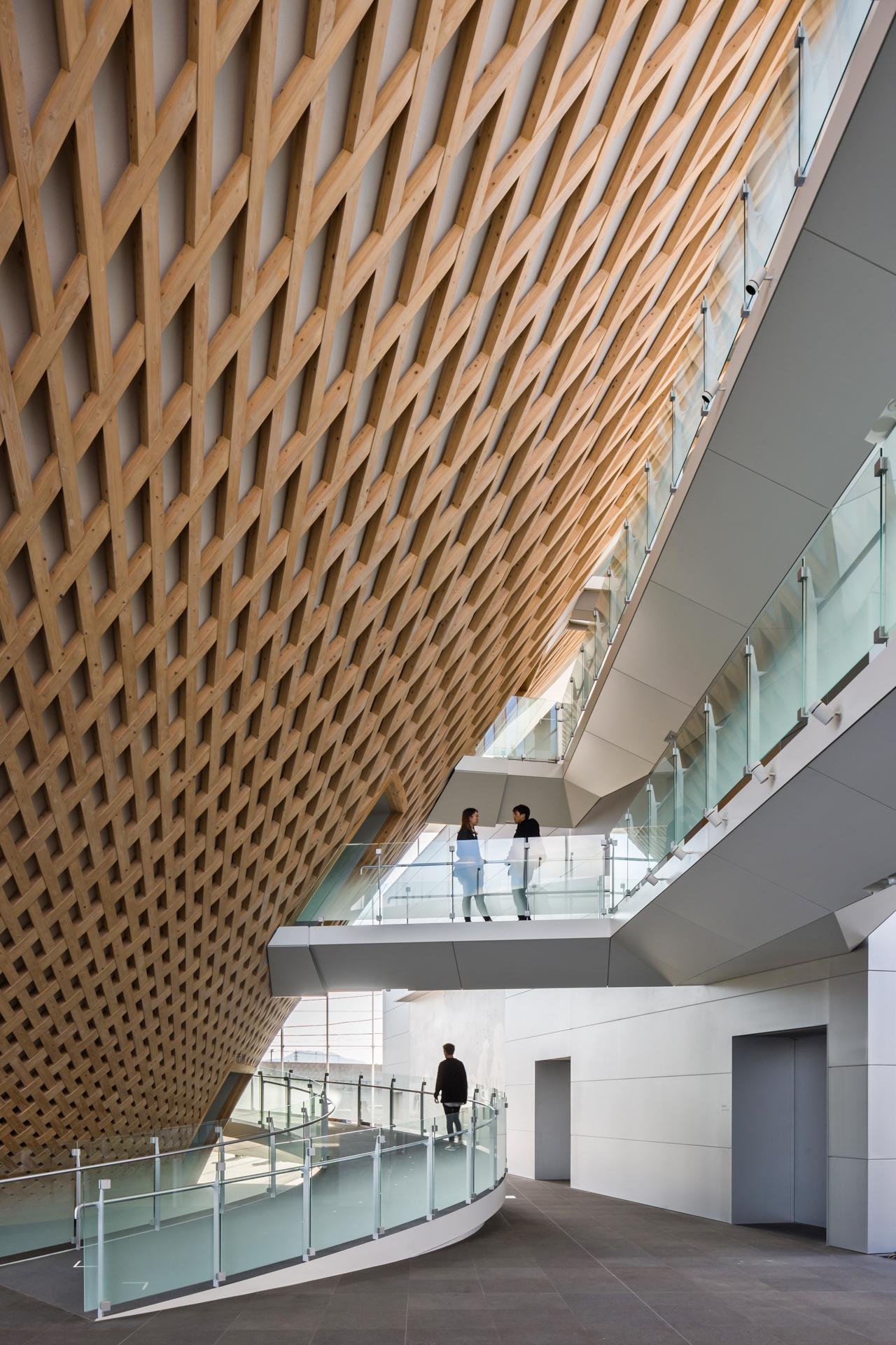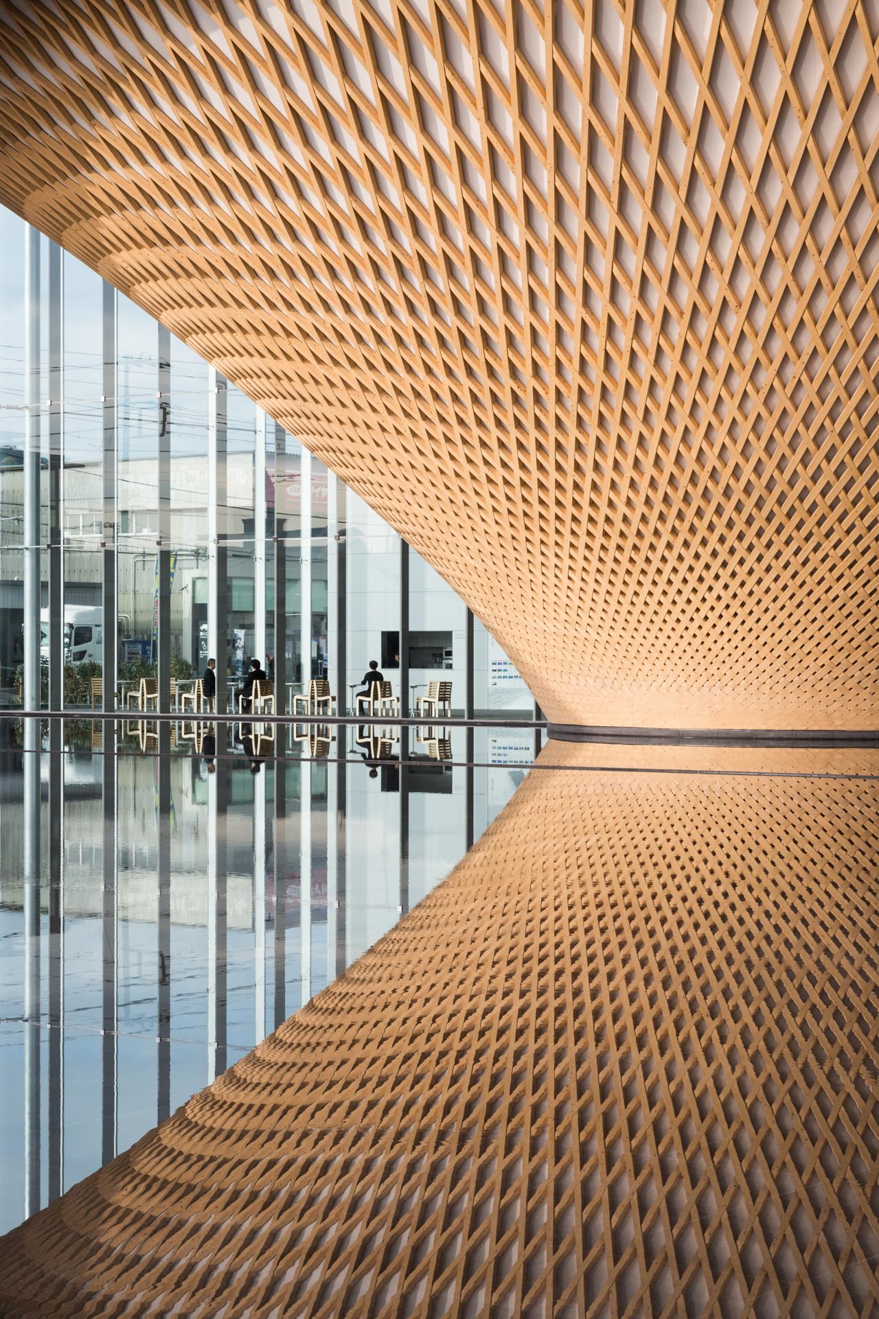 内外部の格子は、全6,973ピースの部材数で構築されており、それぞれの部材は、曲率やひねり、長さが違う部材を削り出して製作したものである。組み立てにおいても、交点(接点)は、XY角度やZ角度がそれぞれ違う形状で7,261箇所存在する。相じゃくりを基本として組み合わせ、一材で編み込んだように交点の加工にデザインを施し、高次元の表現力を醸し出している。